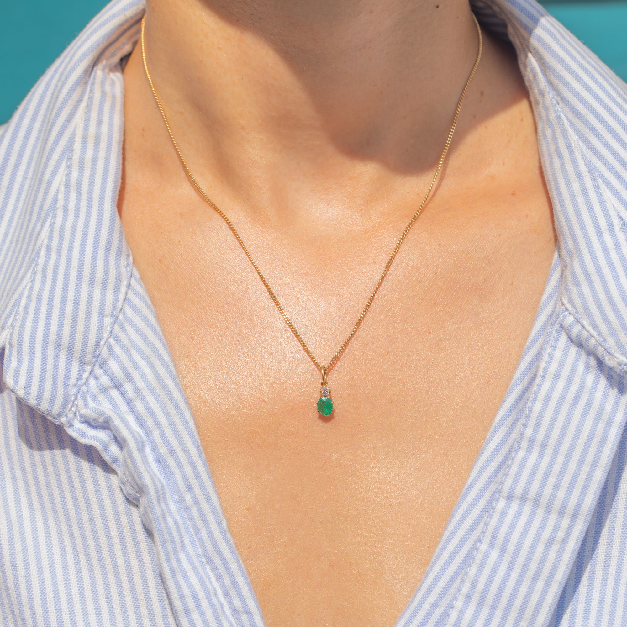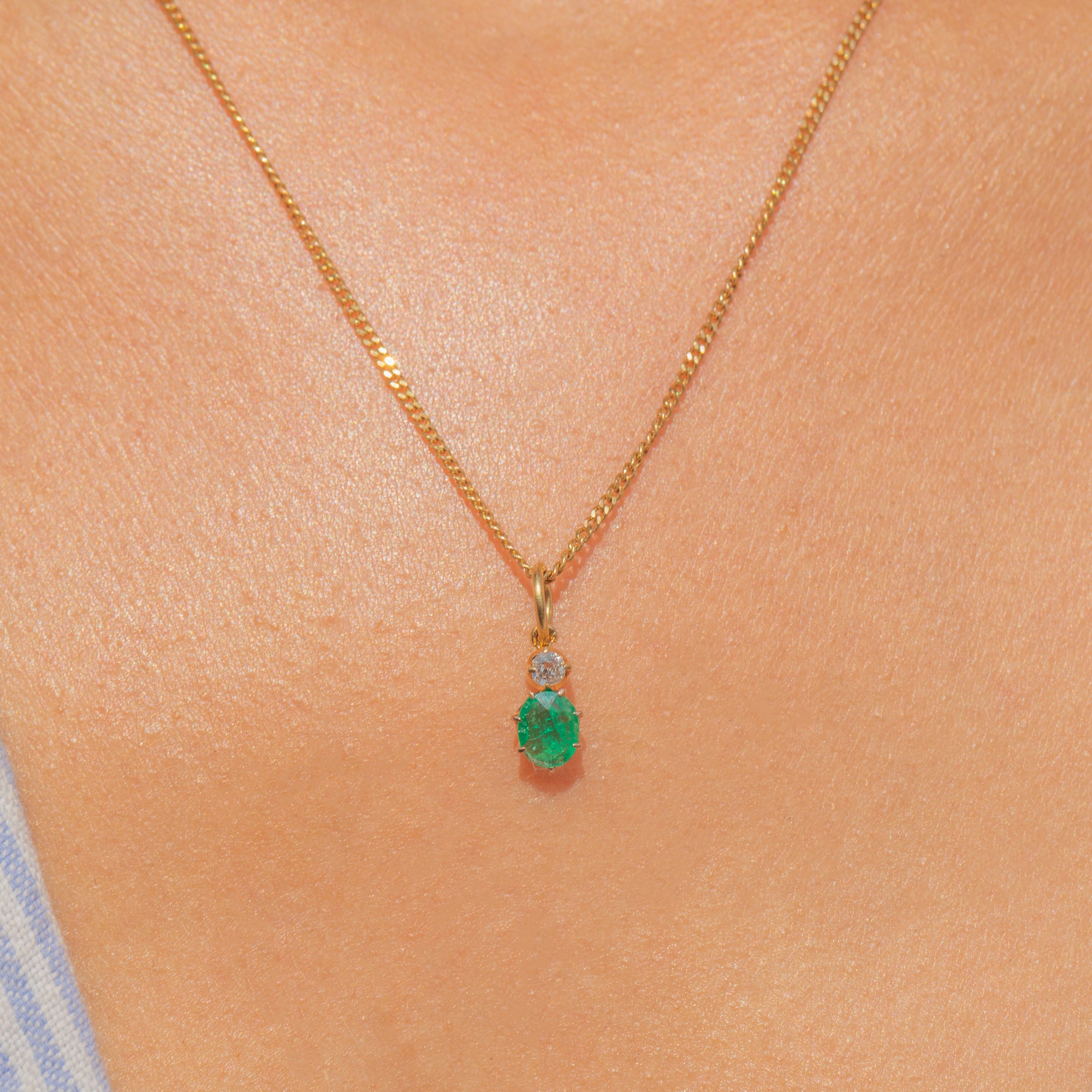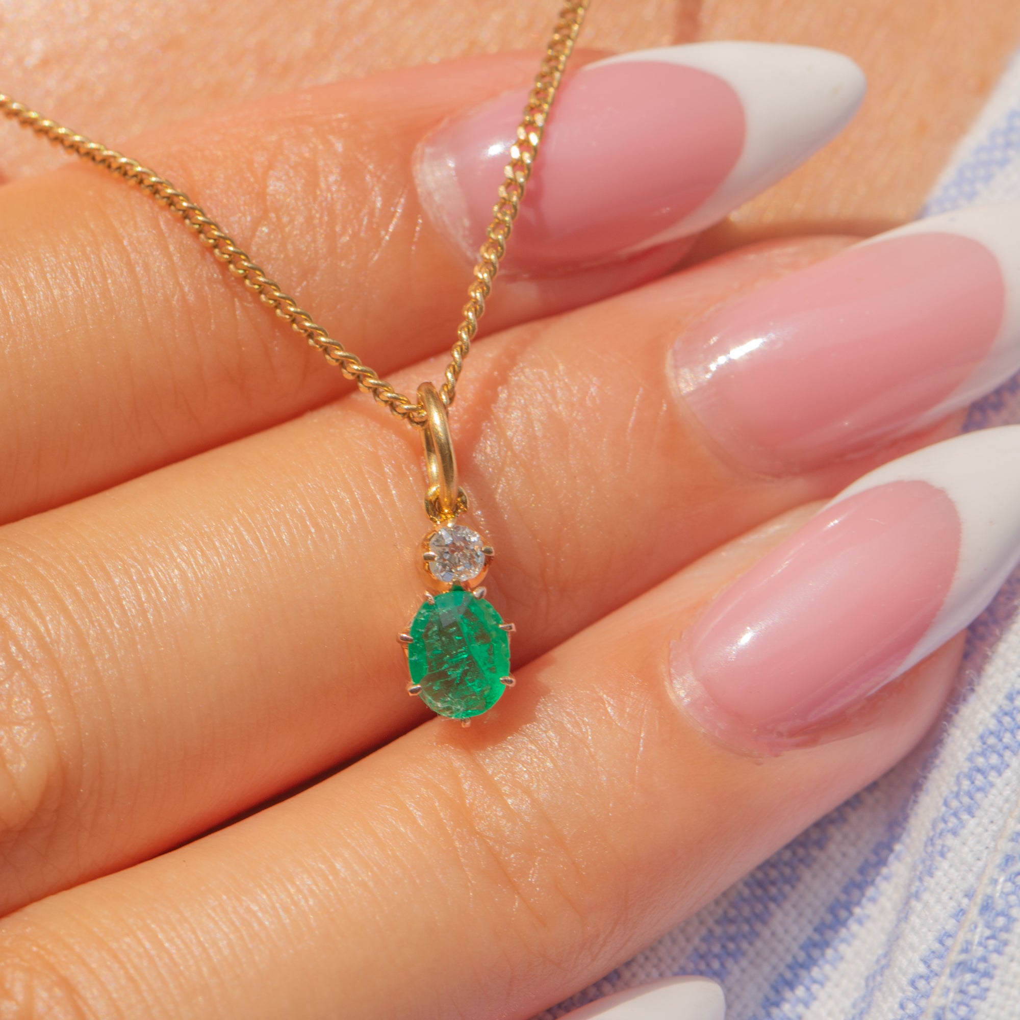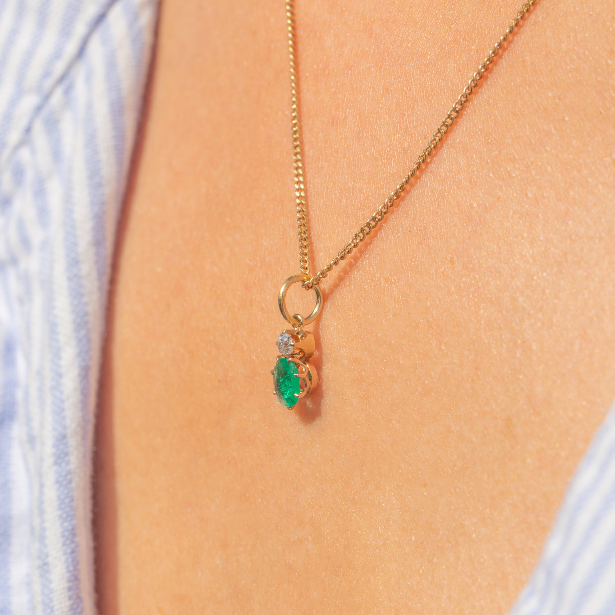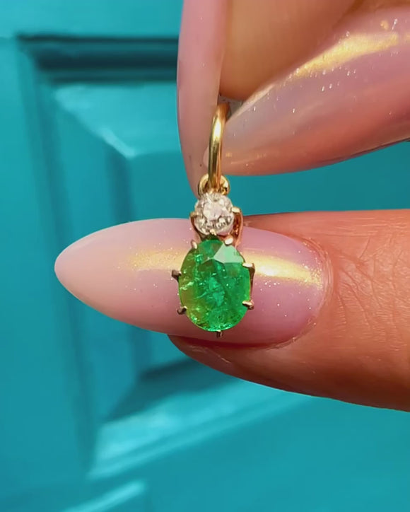 This petite Edwardian charm suspends a vibrant oval Emerald and is adorned by a scintillating Diamond above.