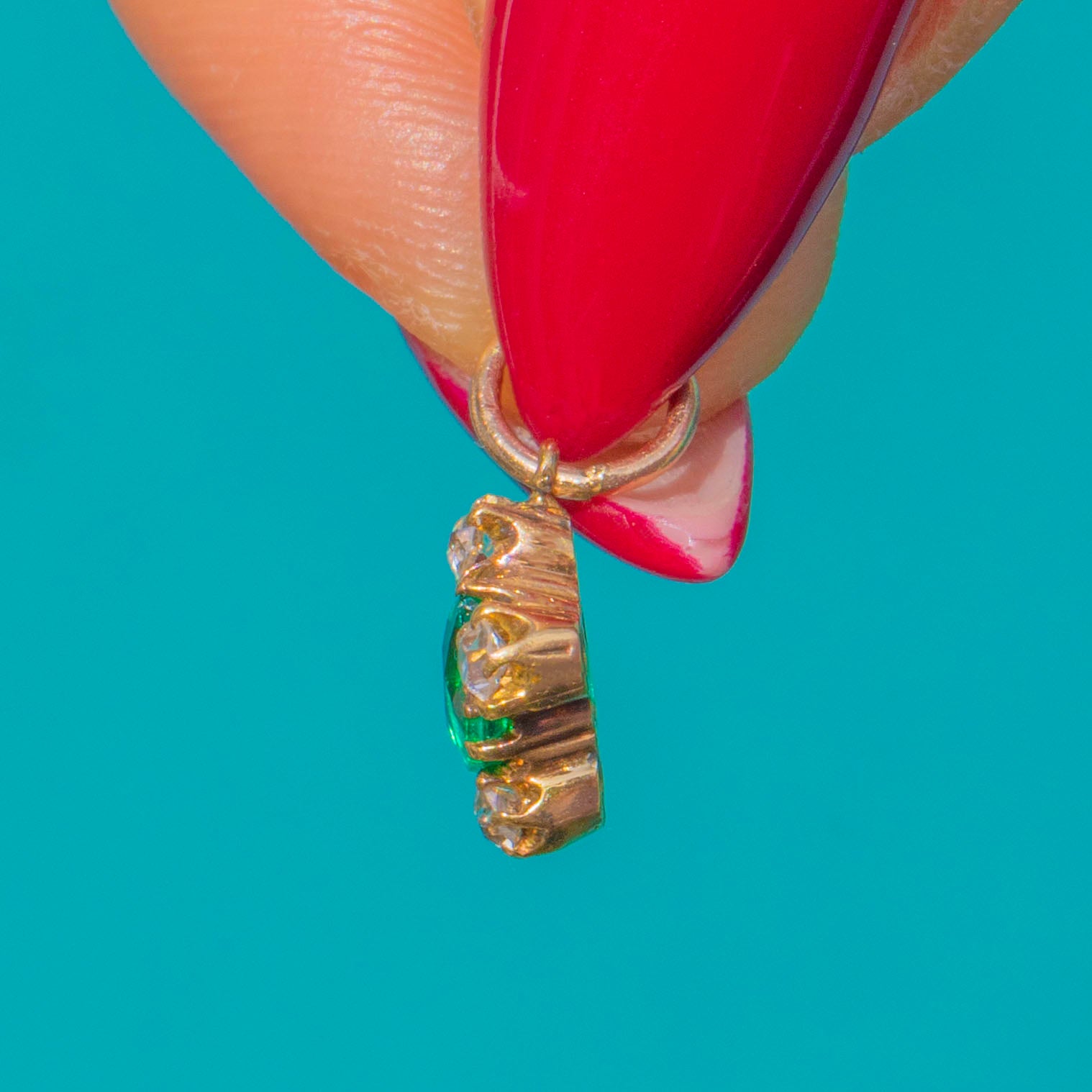 EXCELLENT: The Emerald and Diamonds are bright and well-set with no noticeable chips, abrasions or facet wear; the Emerald shows natural internal inclusions typical of the gem. The Gold settings and jump ring are secure with only light surface wear commensurate with age, and a neat solder seam is visible on the jump ring.