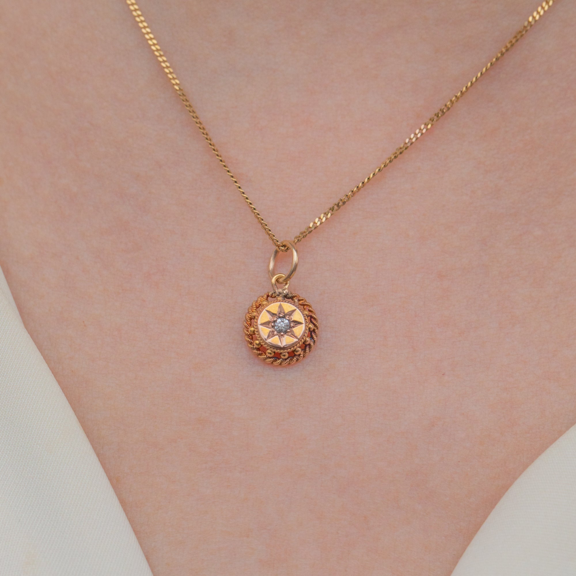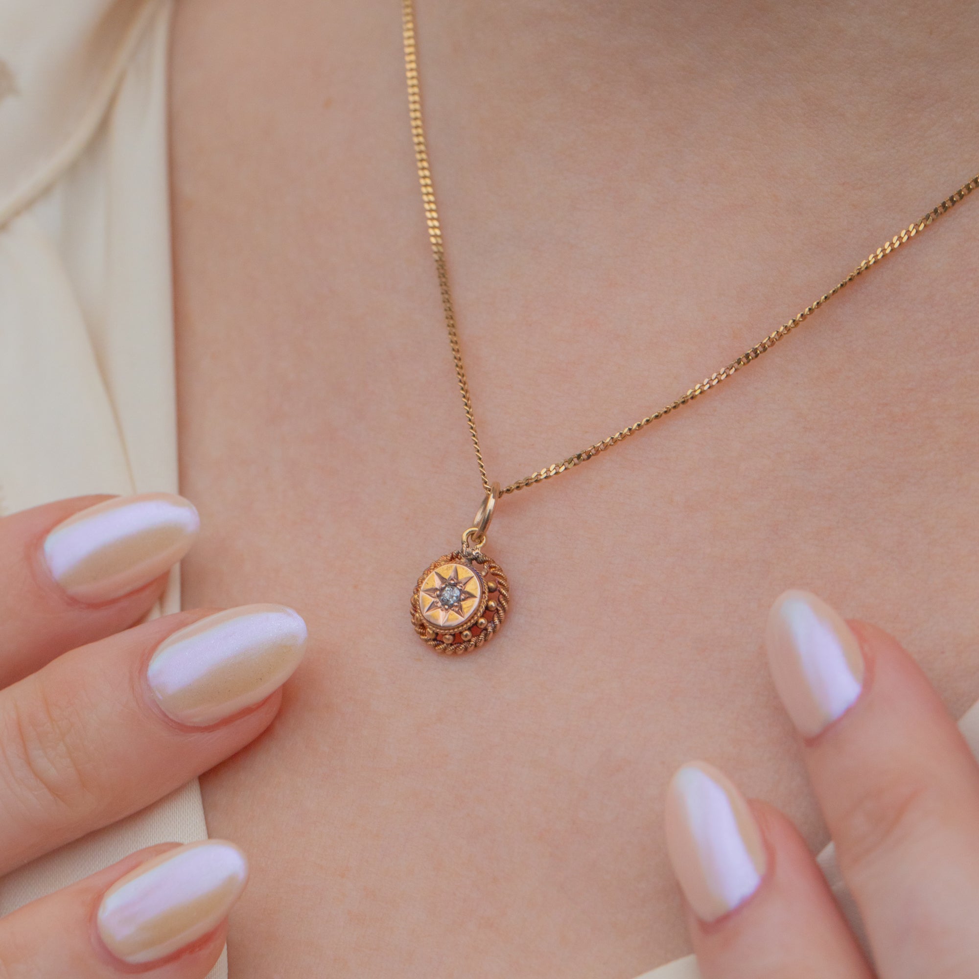 Crafted from solid buttery 18ct Gold, this Victorian charm showcases a star-set twinkling Diamond at her centre surrounded by intricate details for a refined finish. This Etruscan beauty will look exquisite suspended from a dainty Gold chain!