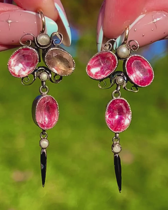 Antique 18ct Gold French Foiled Pink Paste, Pearl & Black Enamel Drop Earrings