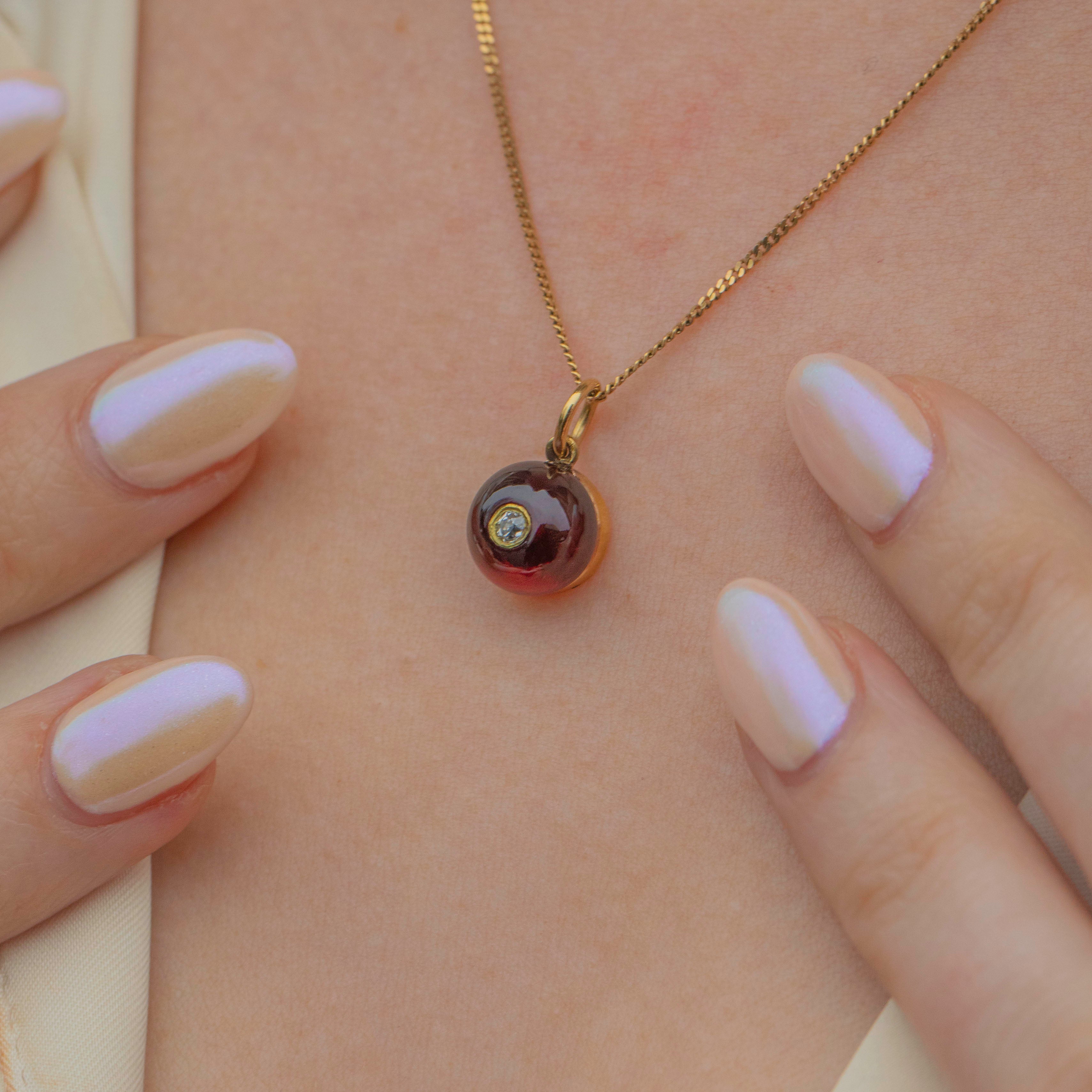 This antique 18ct Gold Garnet cabochon Diamond charm is certainly a piece to celebrate! Sure to bring comfort throughout the winter months, her sumptuously smooth, mulled wine Garnet exudes warmth, accented with a sparkling Diamond. She is the most lovely winter treat!