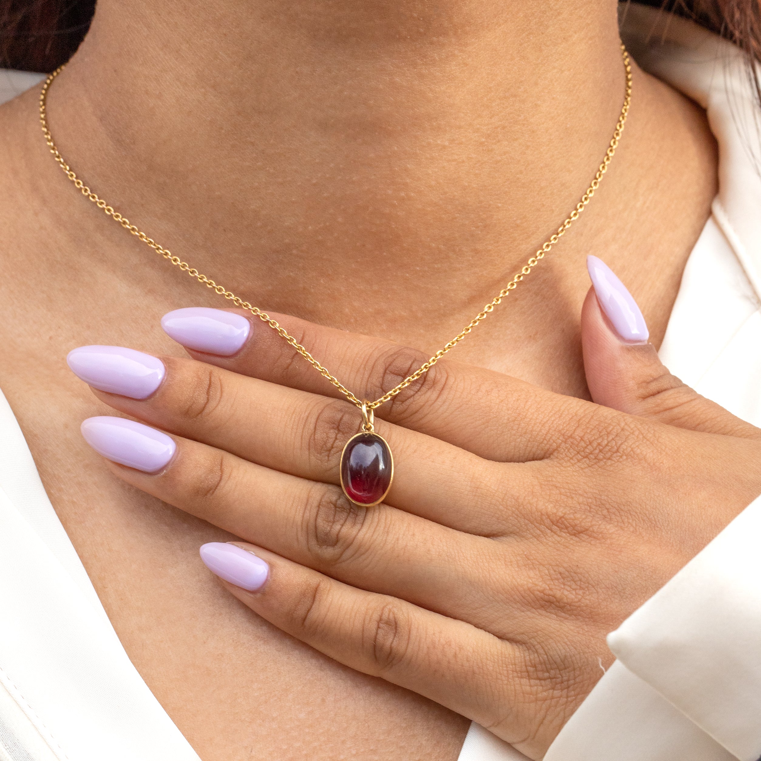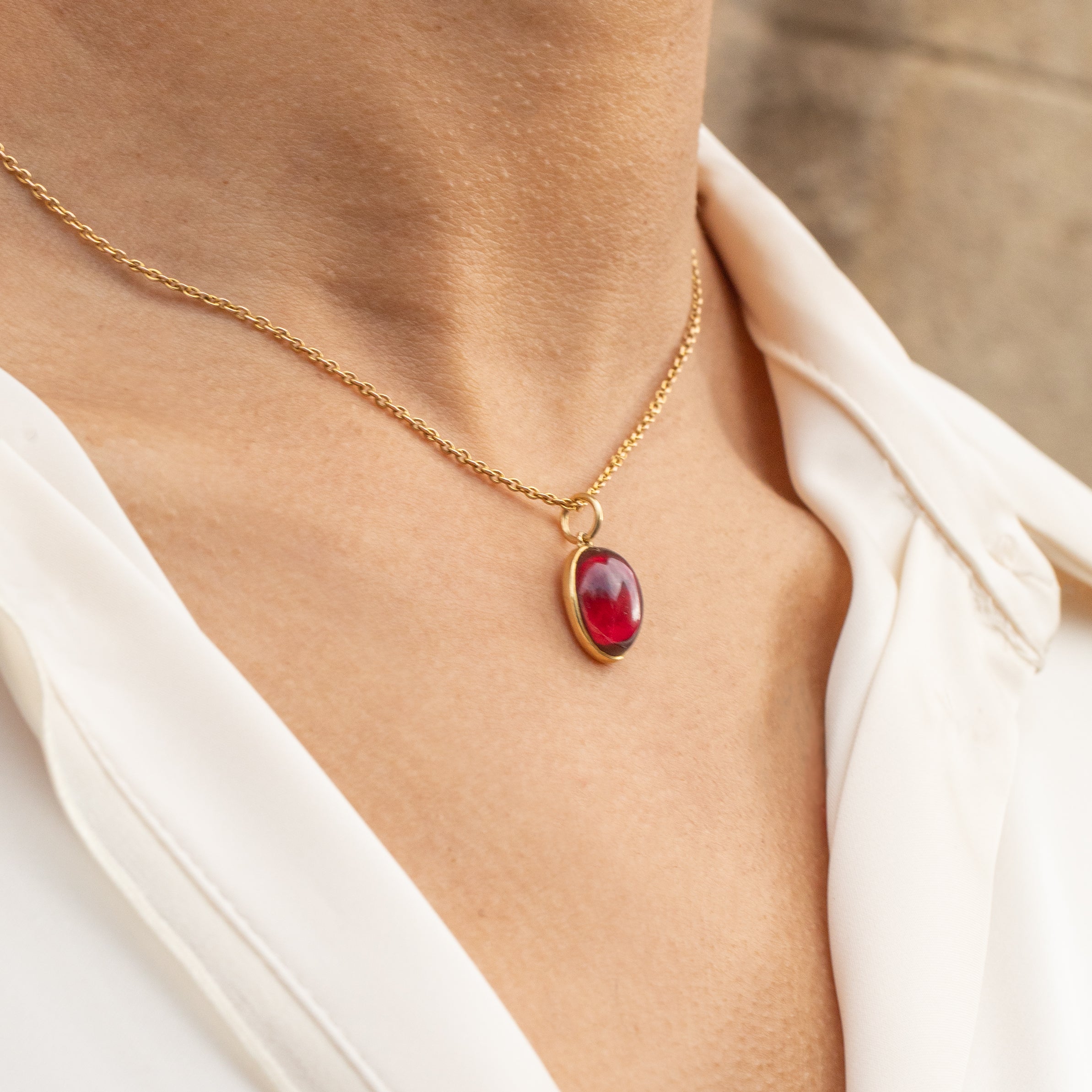Each curve and contour of the pendant reflects in the light, revealing seductive crimson hues that shimmer across the smoothly domed Garnet cabochon; this Victorian pendant is sure to swoon!