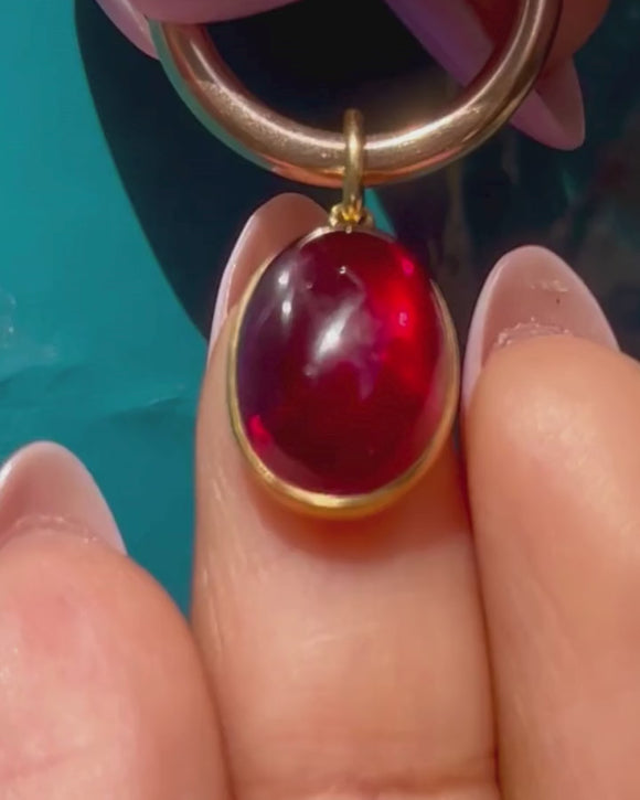 VERY GOOD. This antique 18ct Gold Garnet cabochon pendant is offered in very good condition. The Garnet has a mouthwatering hue and is securely held within its bezel. The Garnet has one very small nibble just below the centre, but the Garnet is smooth and glossy overall. The 18ct Gold is bright and lustrous with only minor surface wear on the back, which it's not noticeable when worn. Compete with a generously sized jump ring, all this eye-catching Victorian Garnet pendant needs is a Gold chain to adorn!