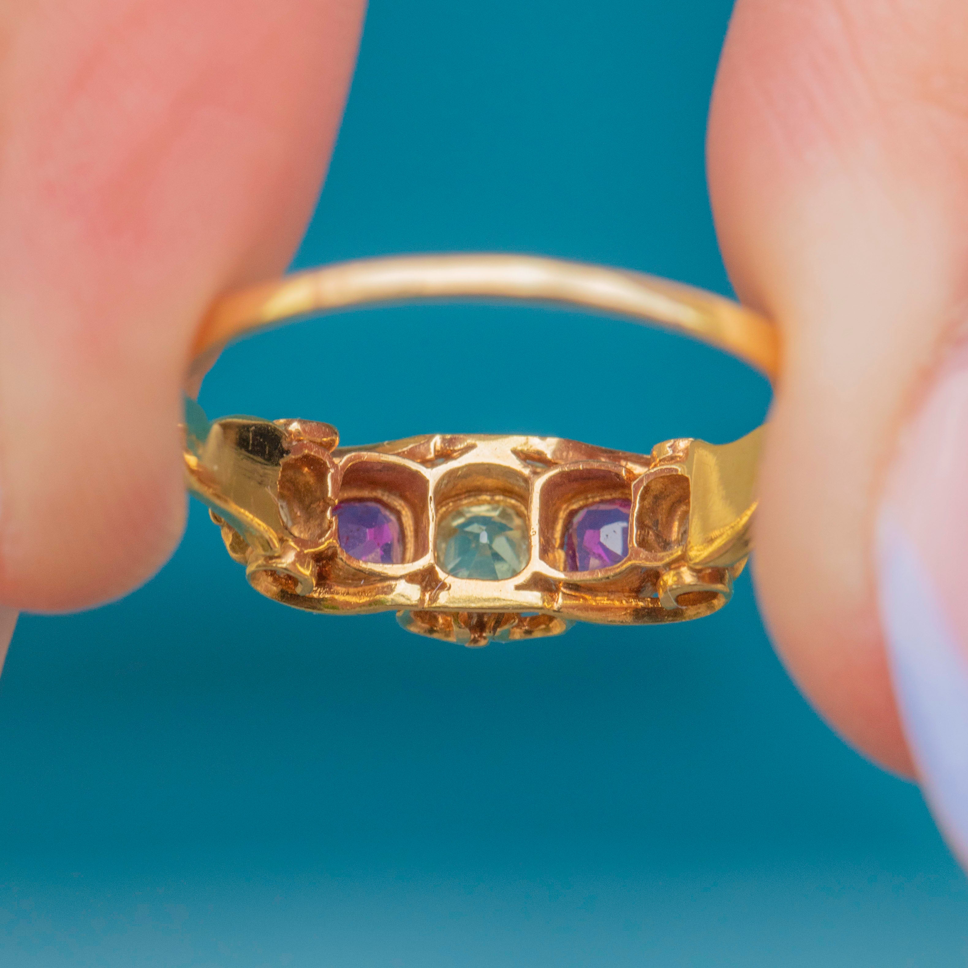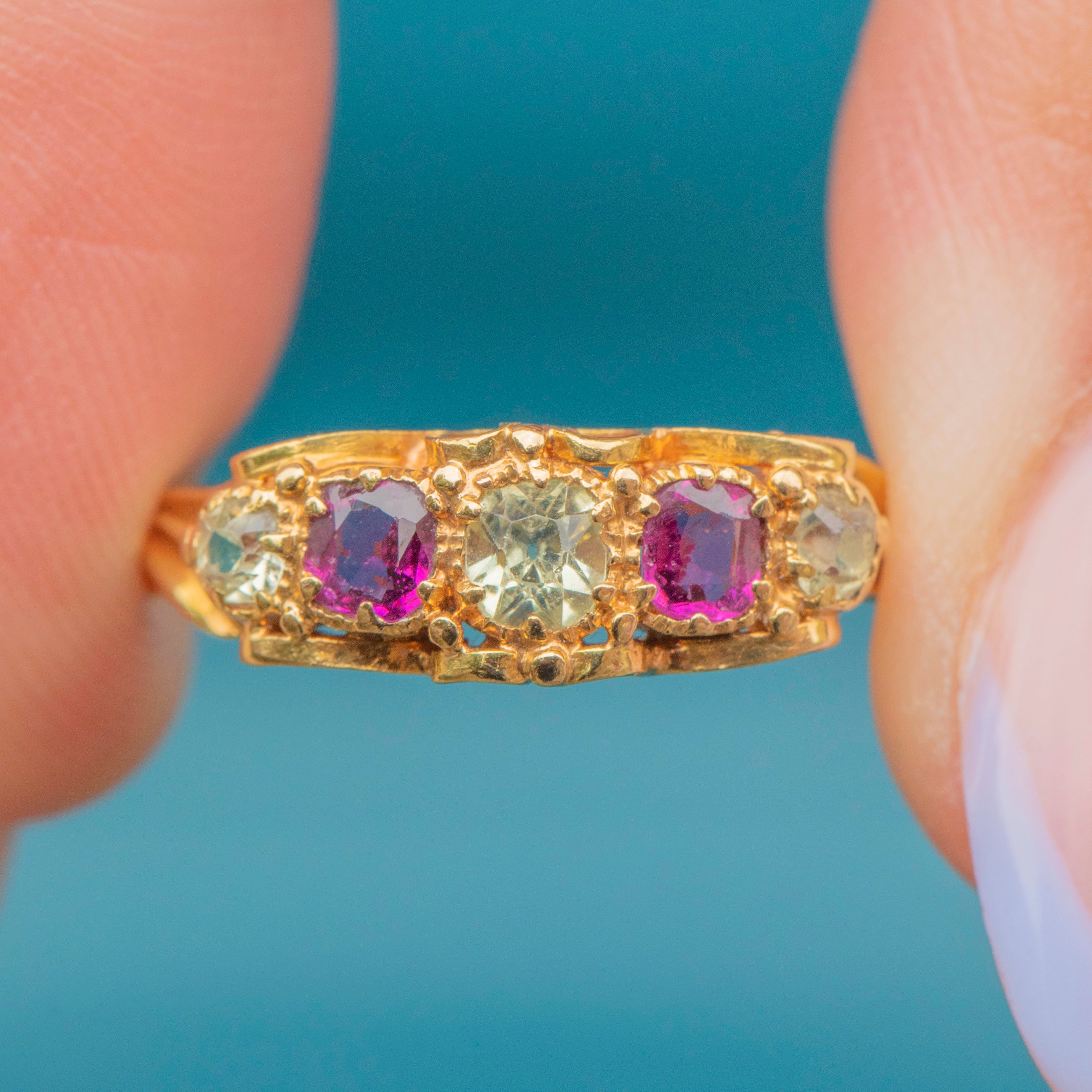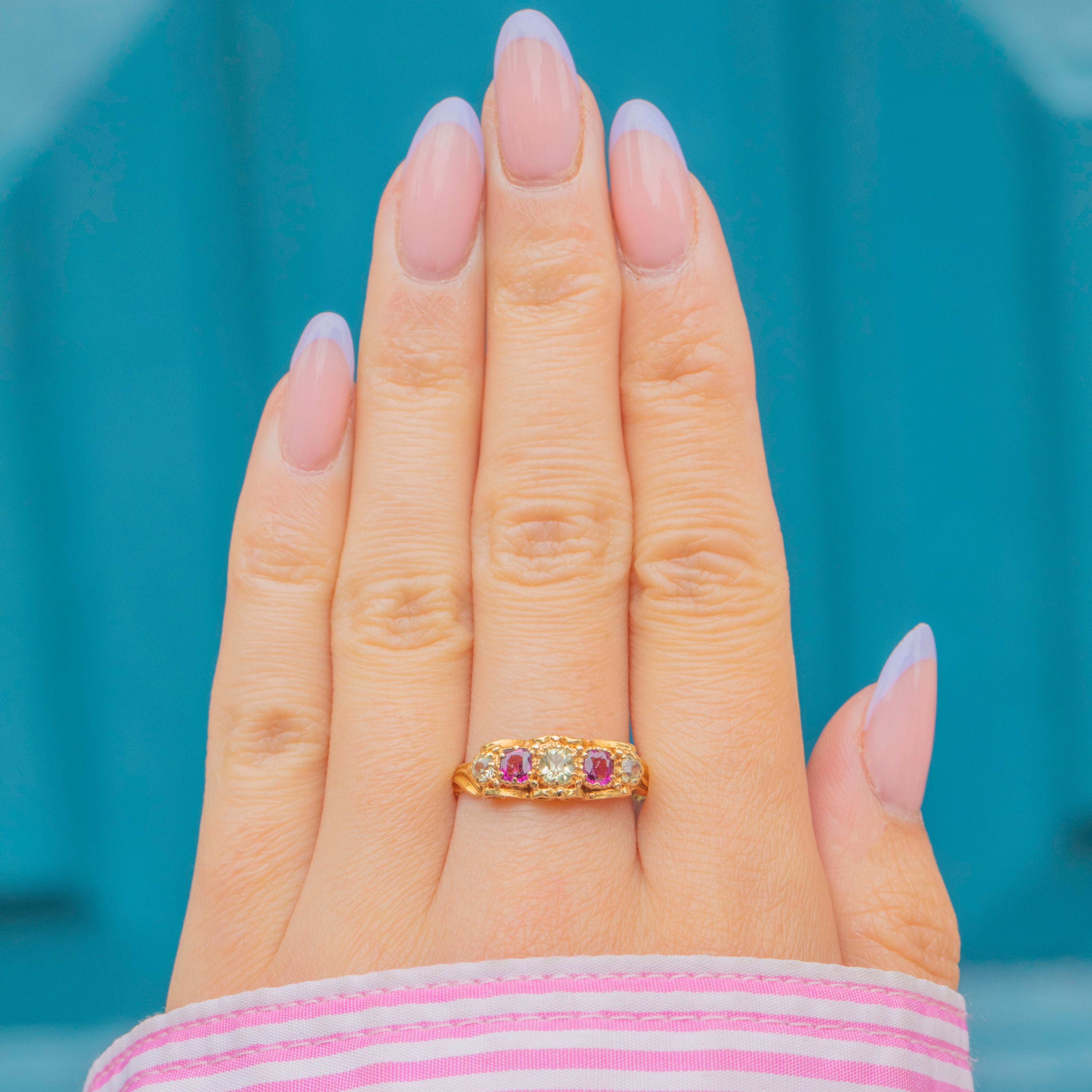 Featuring three gorgeous sage Chrysoberyl stones, each flanked by a vibrant fuchsia Garnet, this five stone ring is a decadent delight. She is crafted entirely from buttery 18ct Gold and features delicate, ornate settings and shoulders in quintessential Victorian style.