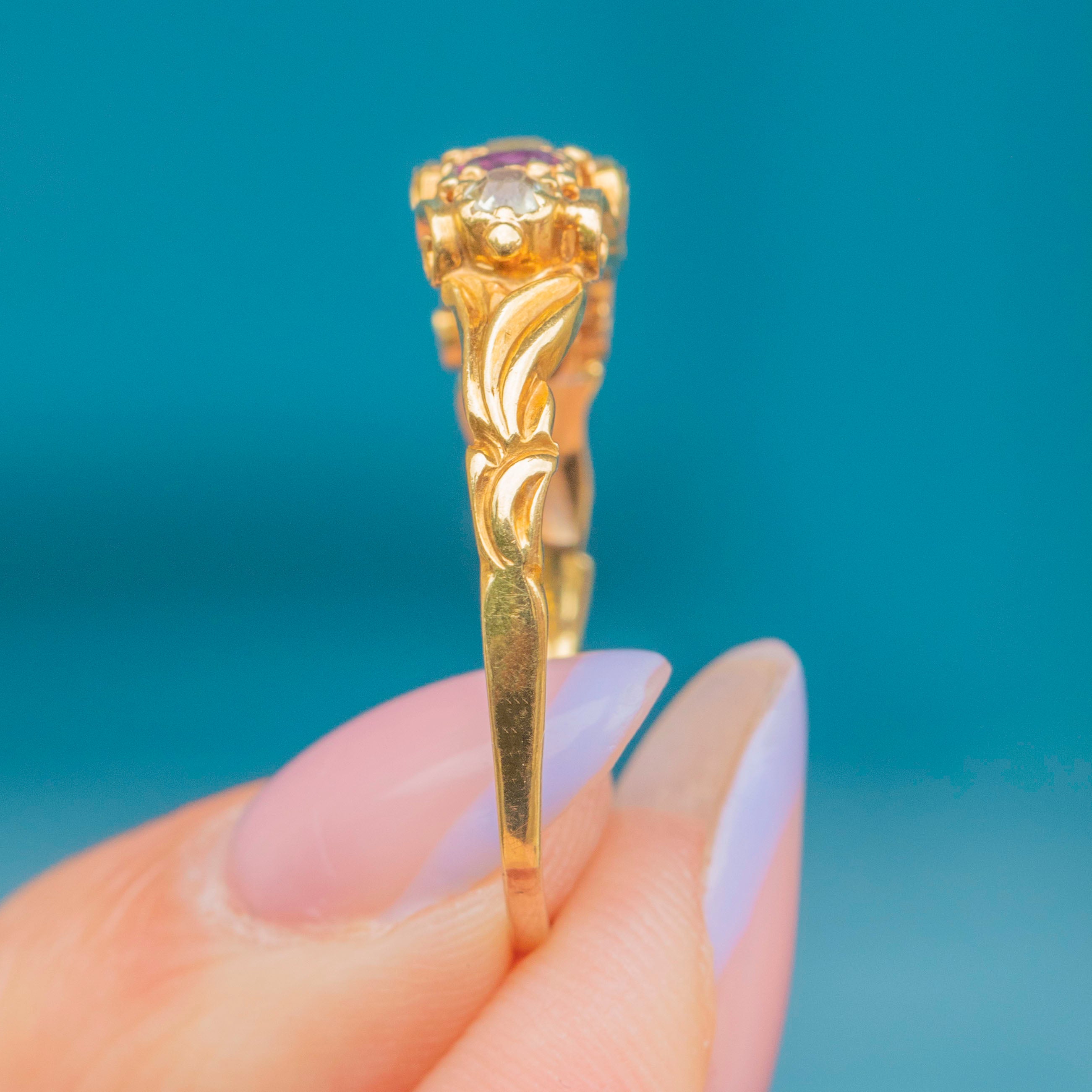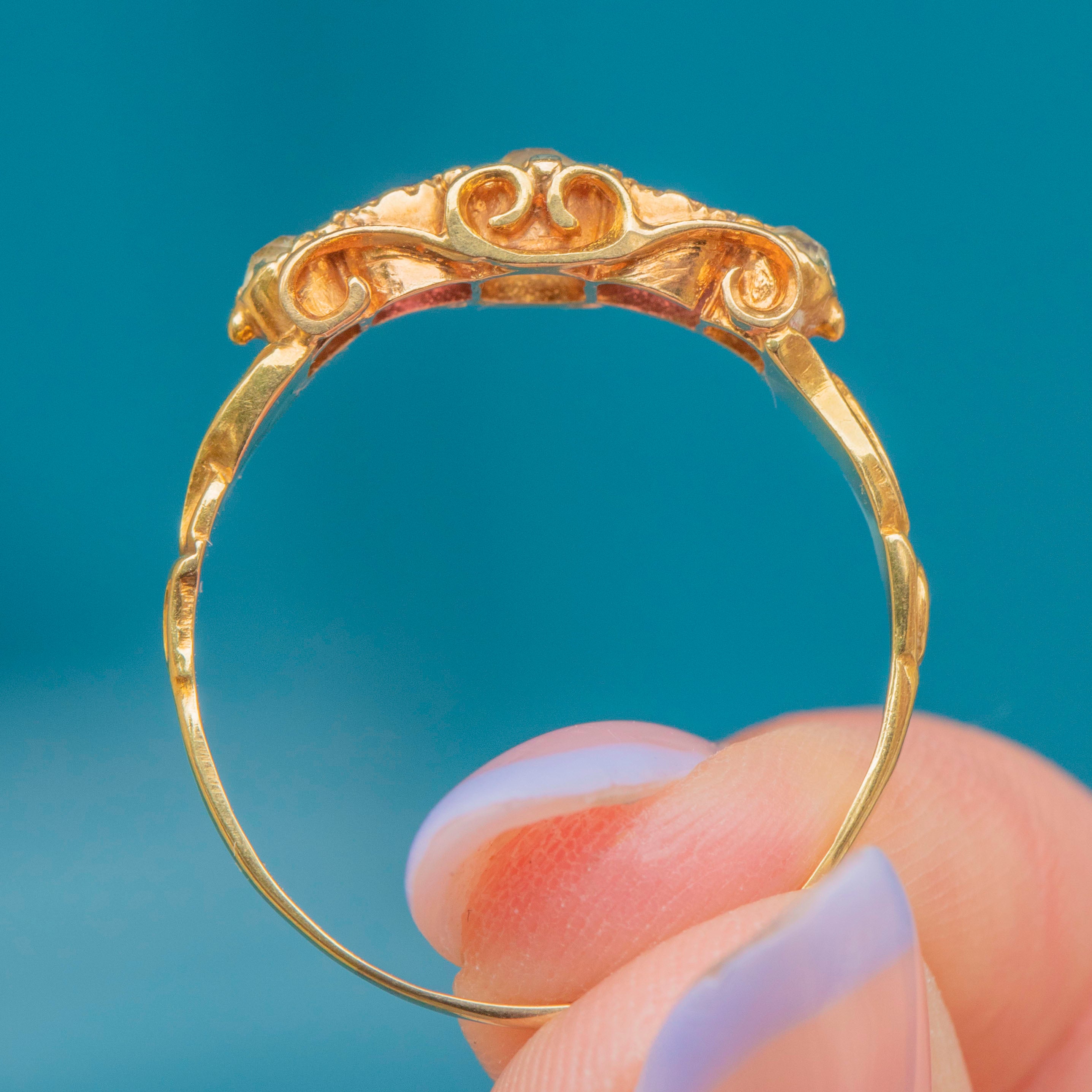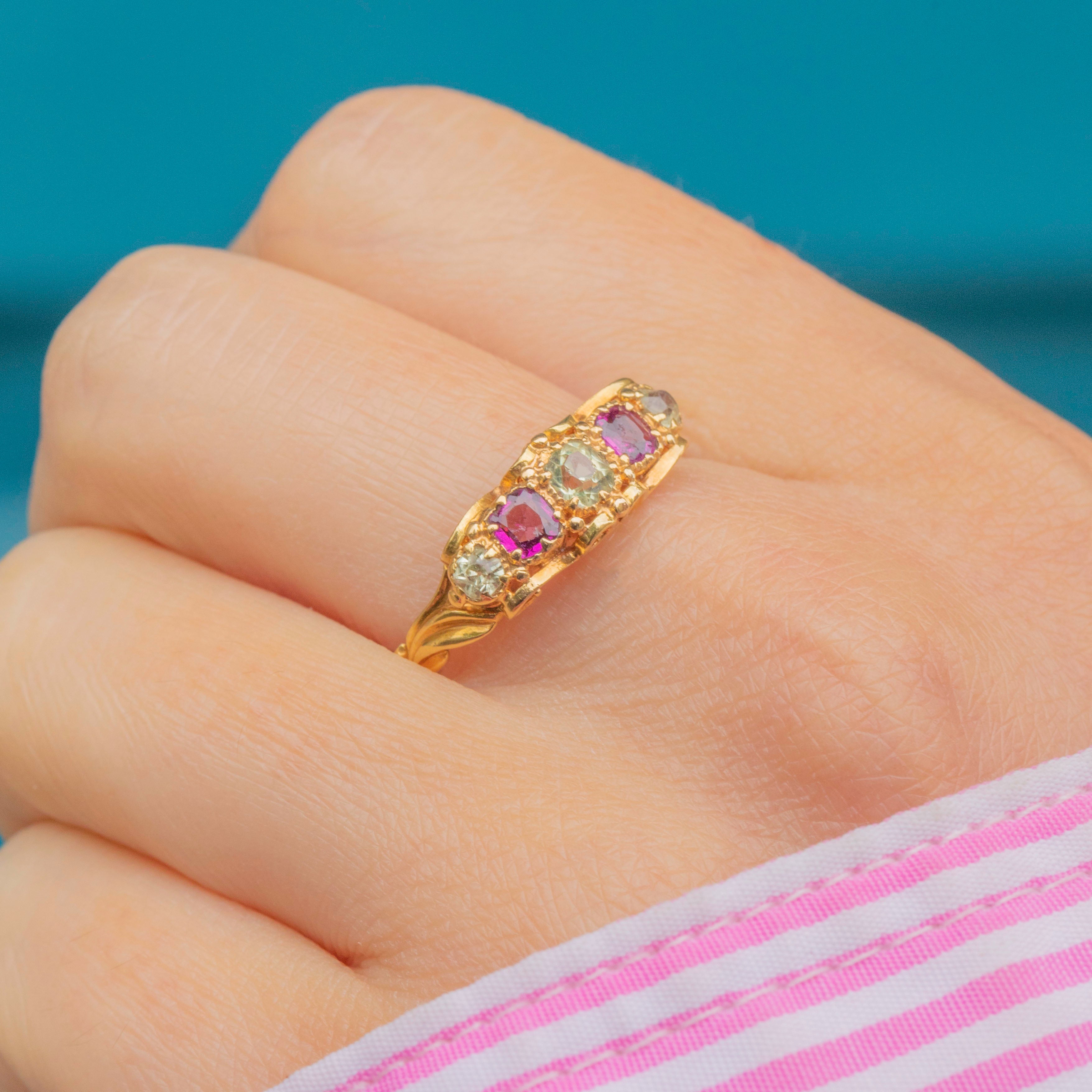 Featuring three gorgeous sage Chrysoberyl stones, each flanked by a vibrant fuchsia Garnet, this five stone ring is a decadent delight. She is crafted entirely from buttery 18ct Gold and features delicate, ornate settings and shoulders in quintessential Victorian style.