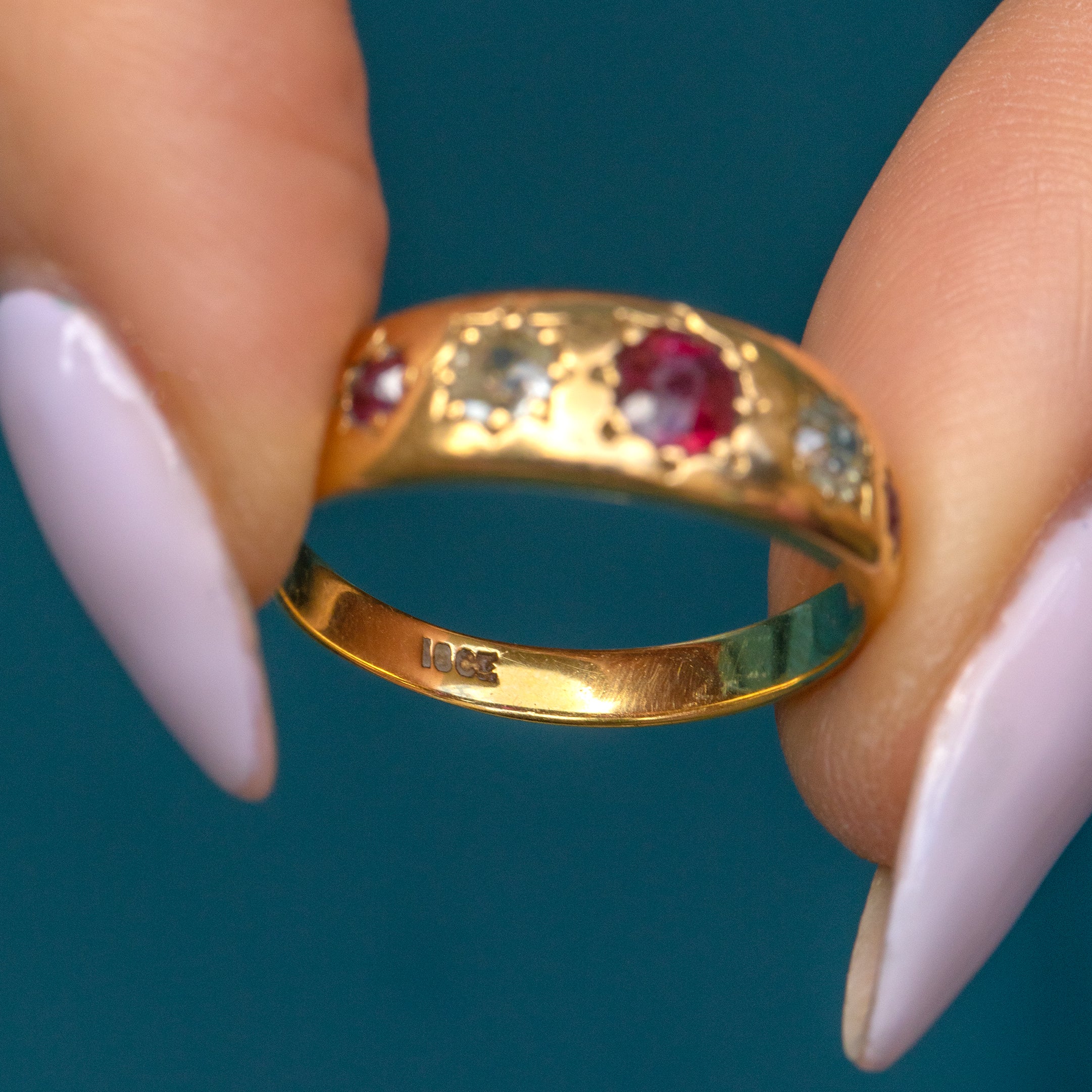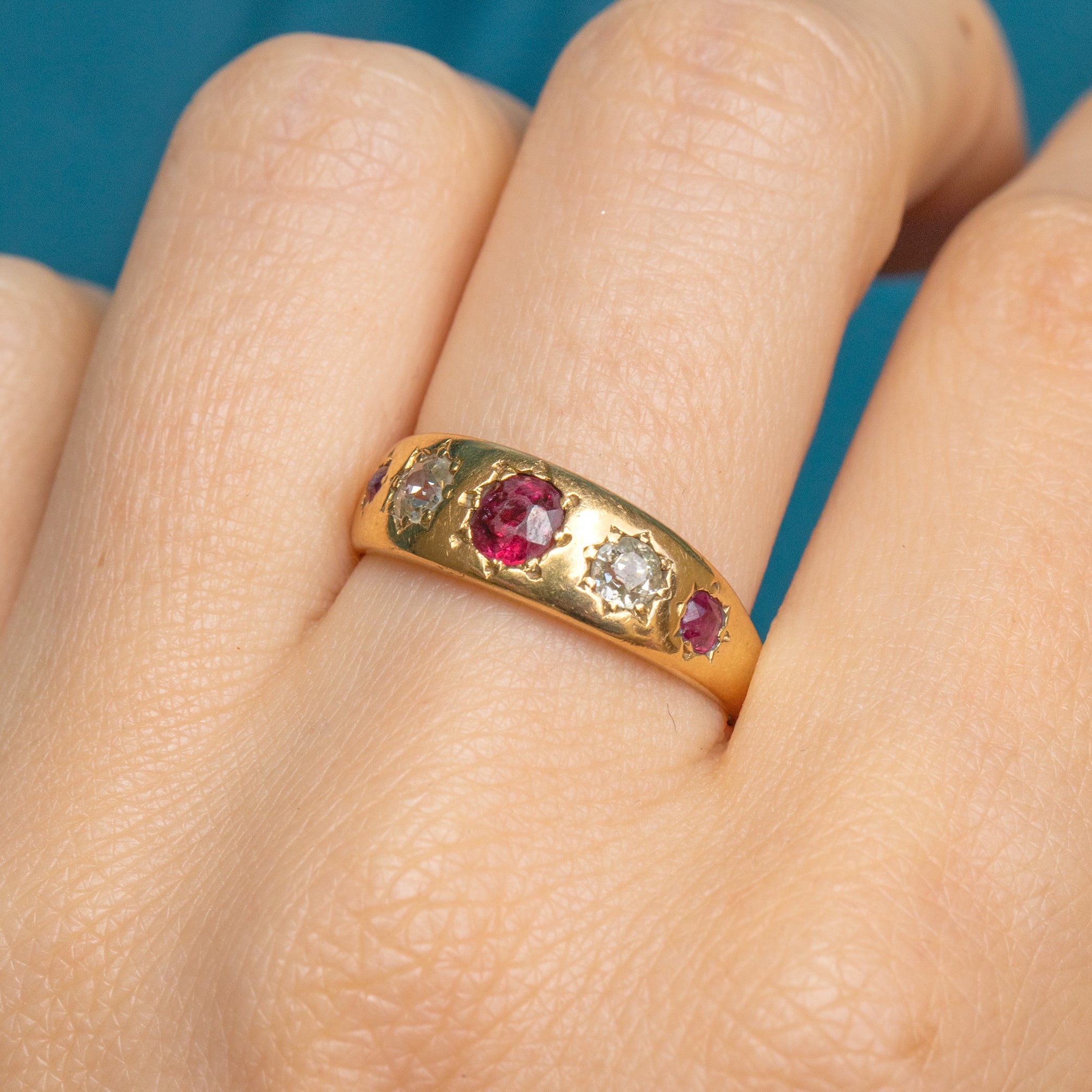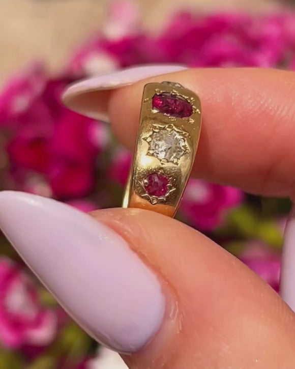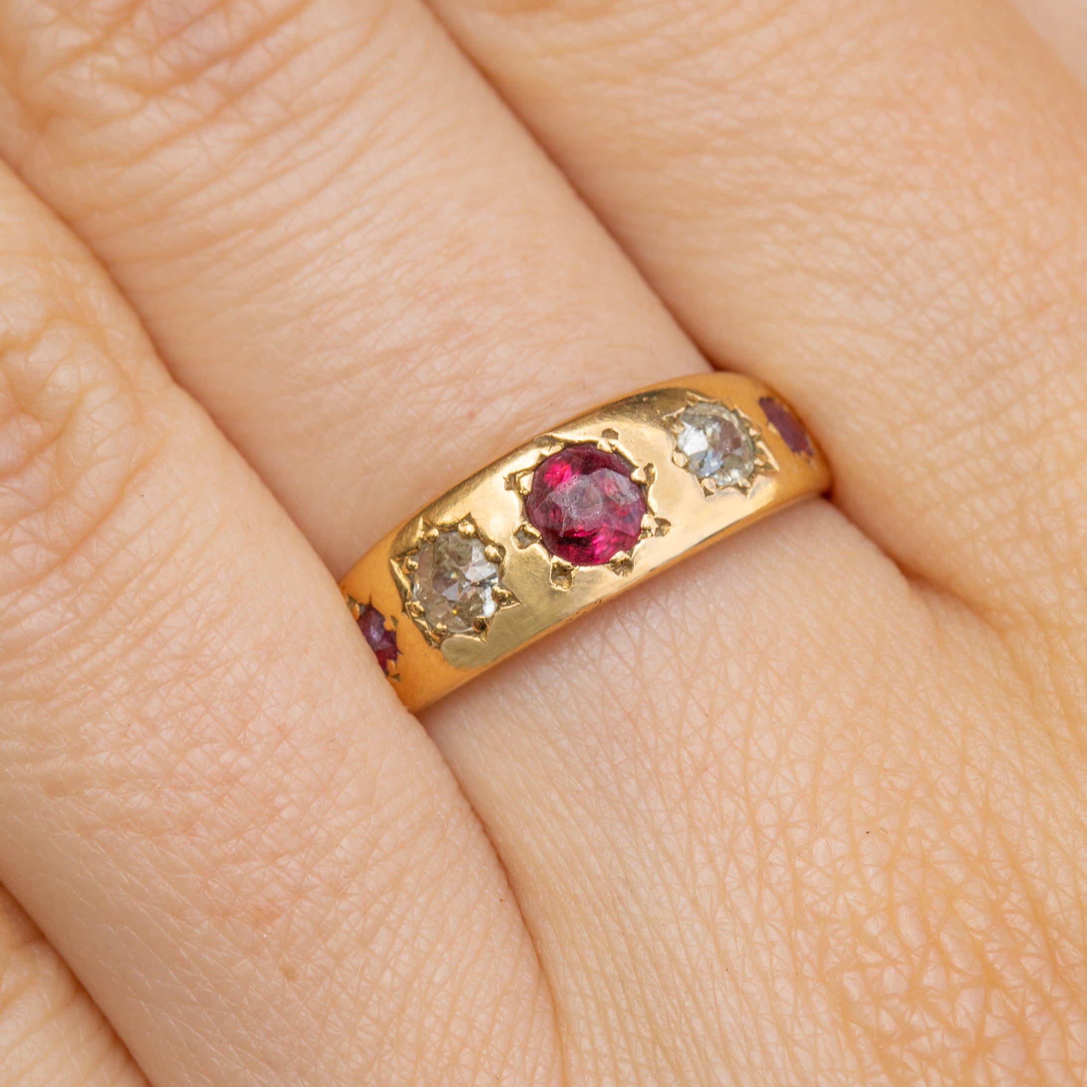 VERY GOOD. This antique 18ct Gold Garnet Diamond gypsy ring is in very good condition! The Garnets and Diamonds are securely set and will provide your finger with a plethora of sparkle. There is some minor surface wear to the Garnets but nothing that affects their overall beauty. There is a resize mark to the side of the band, but there is only a slight change in colour to note and it wears comfortably! Although the ring band isn't completely circular, the Gold is smooth to the touch and glides onto your hand a dream. This Victorian Garnet ring will add elegance to your hand in an instant!