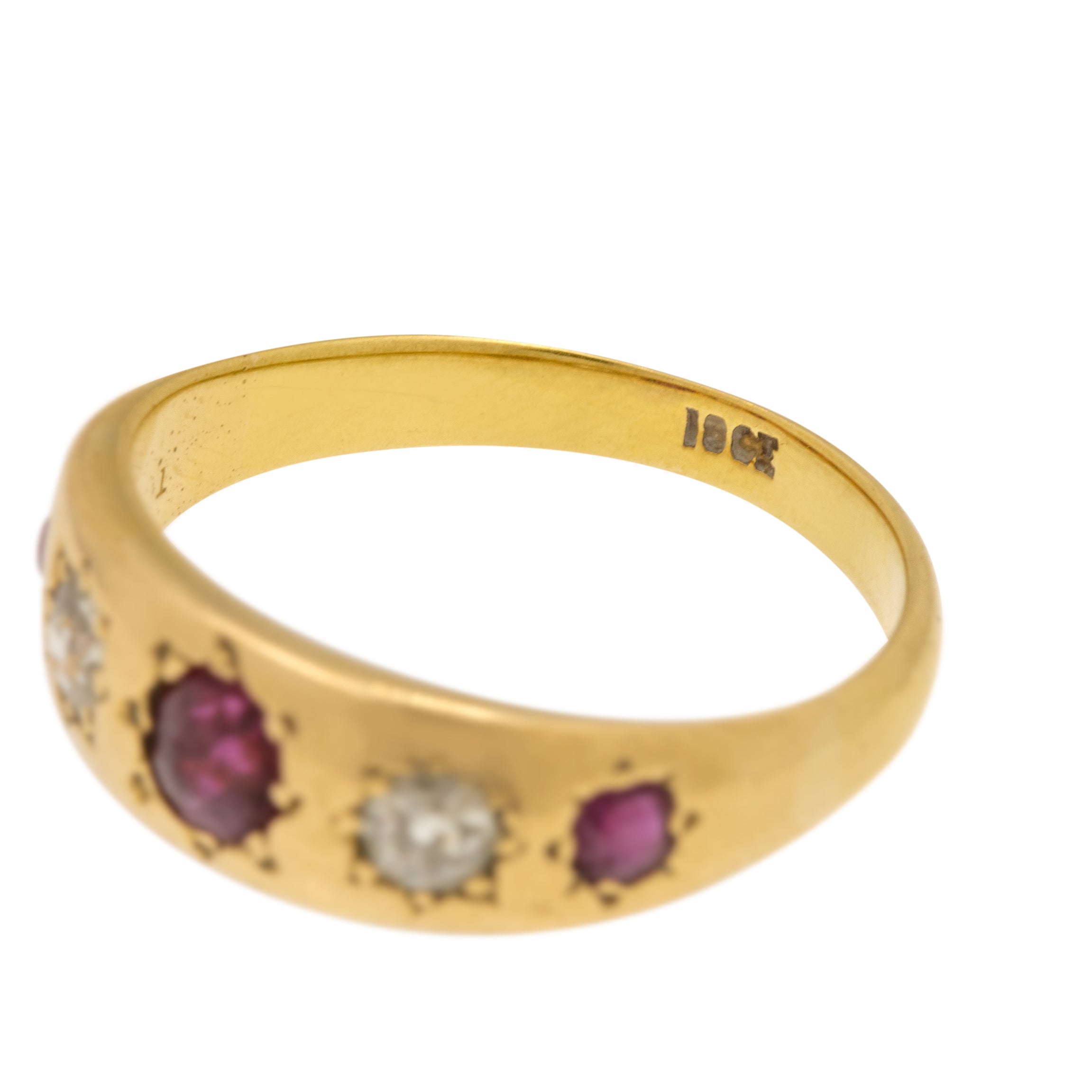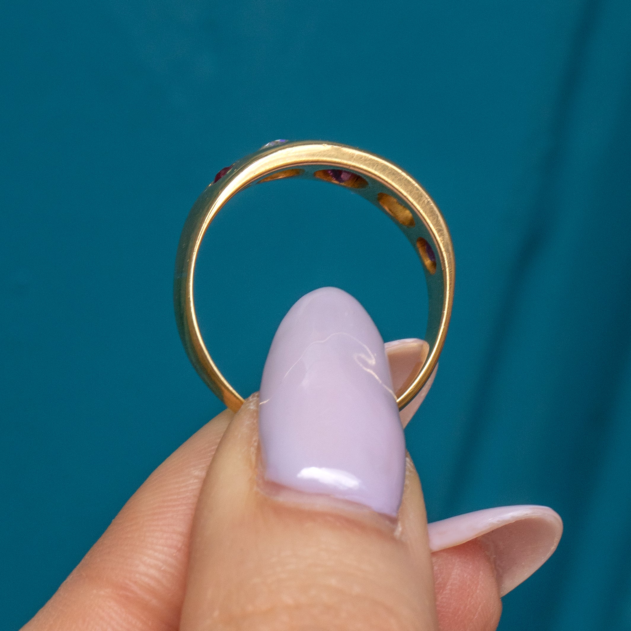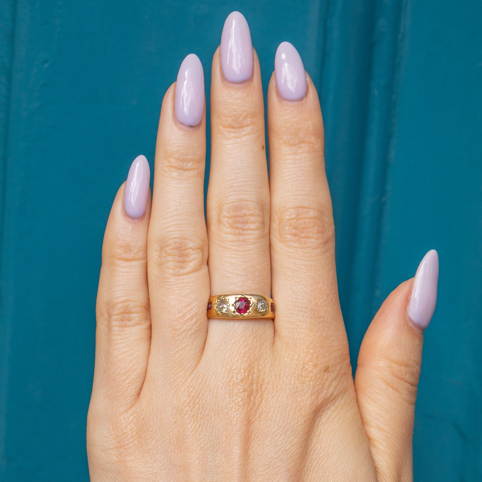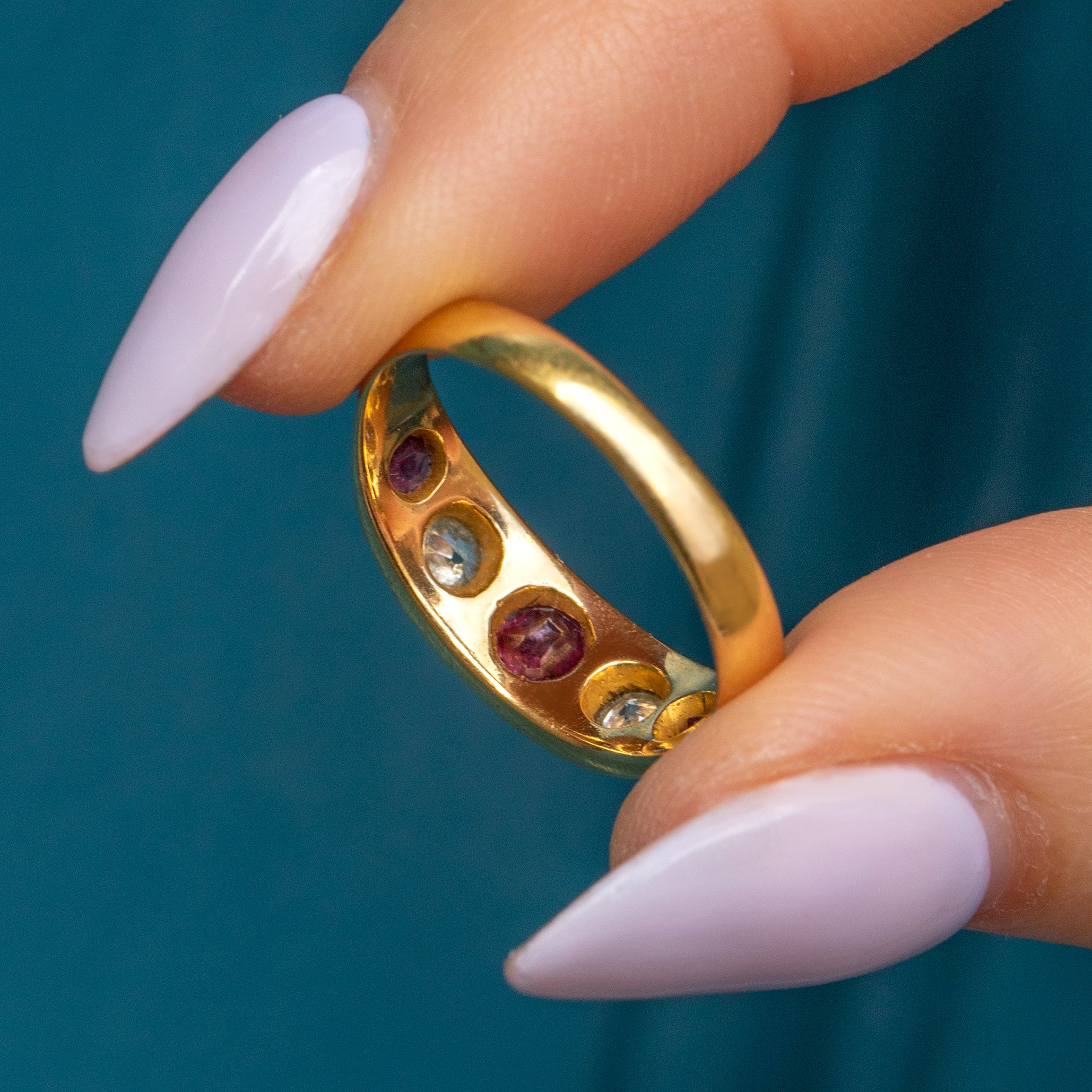 VERY GOOD. This antique 18ct Gold Garnet Diamond gypsy ring is in very good condition! The Garnets and Diamonds are securely set and will provide your finger with a plethora of sparkle. There is some minor surface wear to the Garnets but nothing that affects their overall beauty. There is a resize mark to the side of the band, but there is only a slight change in colour to note and it wears comfortably! Although the ring band isn't completely circular, the Gold is smooth to the touch and glides onto your hand a dream. This Victorian Garnet ring will add elegance to your hand in an instant!