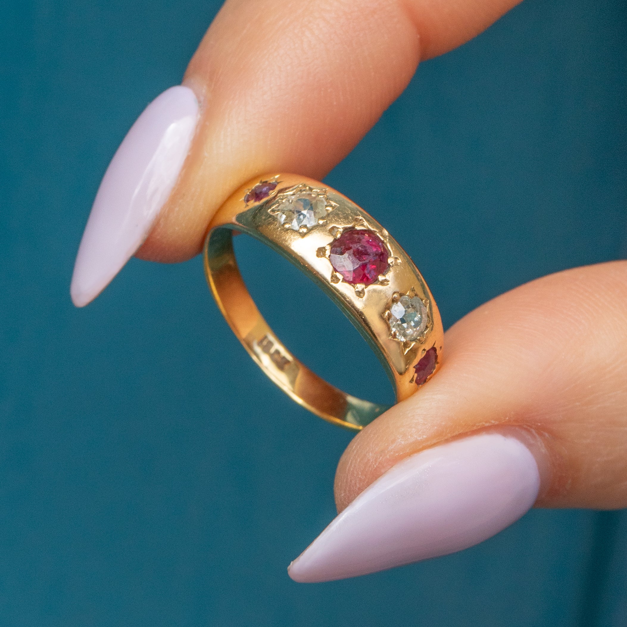 This antique 18ct Gold Garnet Diamond gypsy ring is a showstopper! Crimson glistens from her Sangria Garnets and are intertwined with crisp twinkles from the old-mine cut Diamonds, caressing the entirety of your finger width.