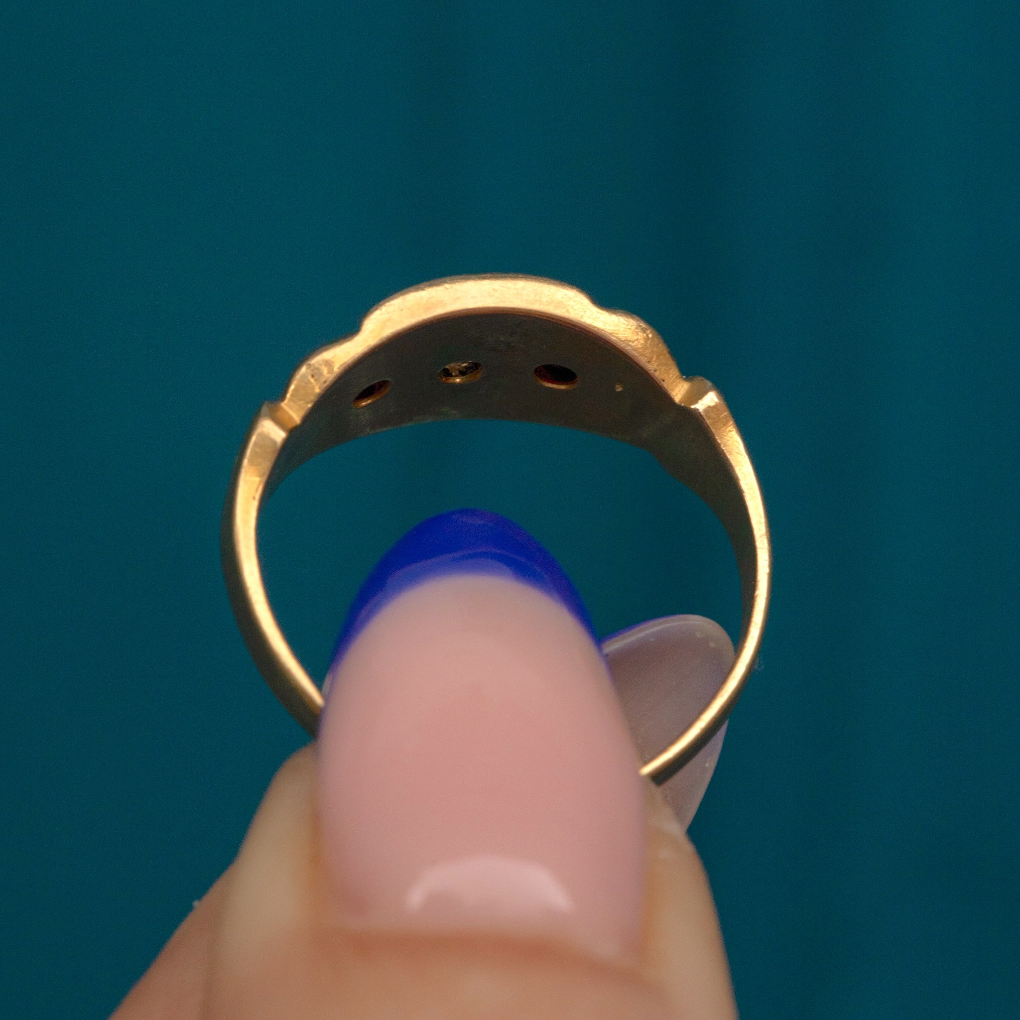 The star-set Diamond is flanked by crimson Garnets, each one glistening beneath the light. With a full set of hallmarks dating to 1899, this Victorian gypsy ring is a fine collector's piece!
