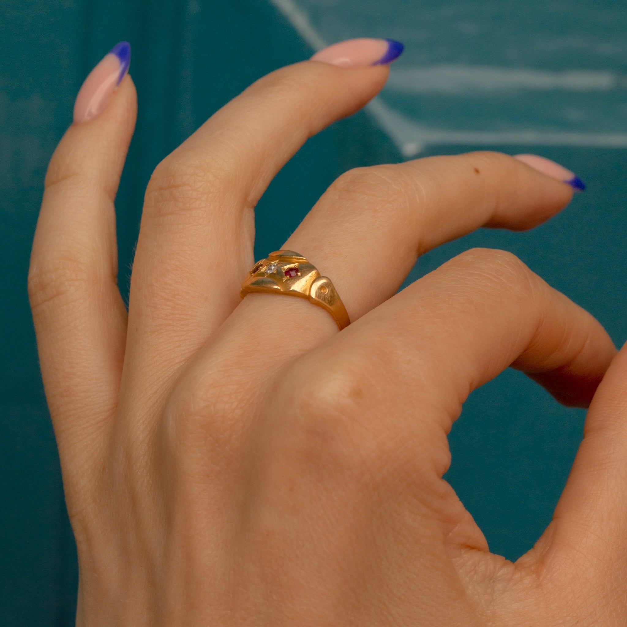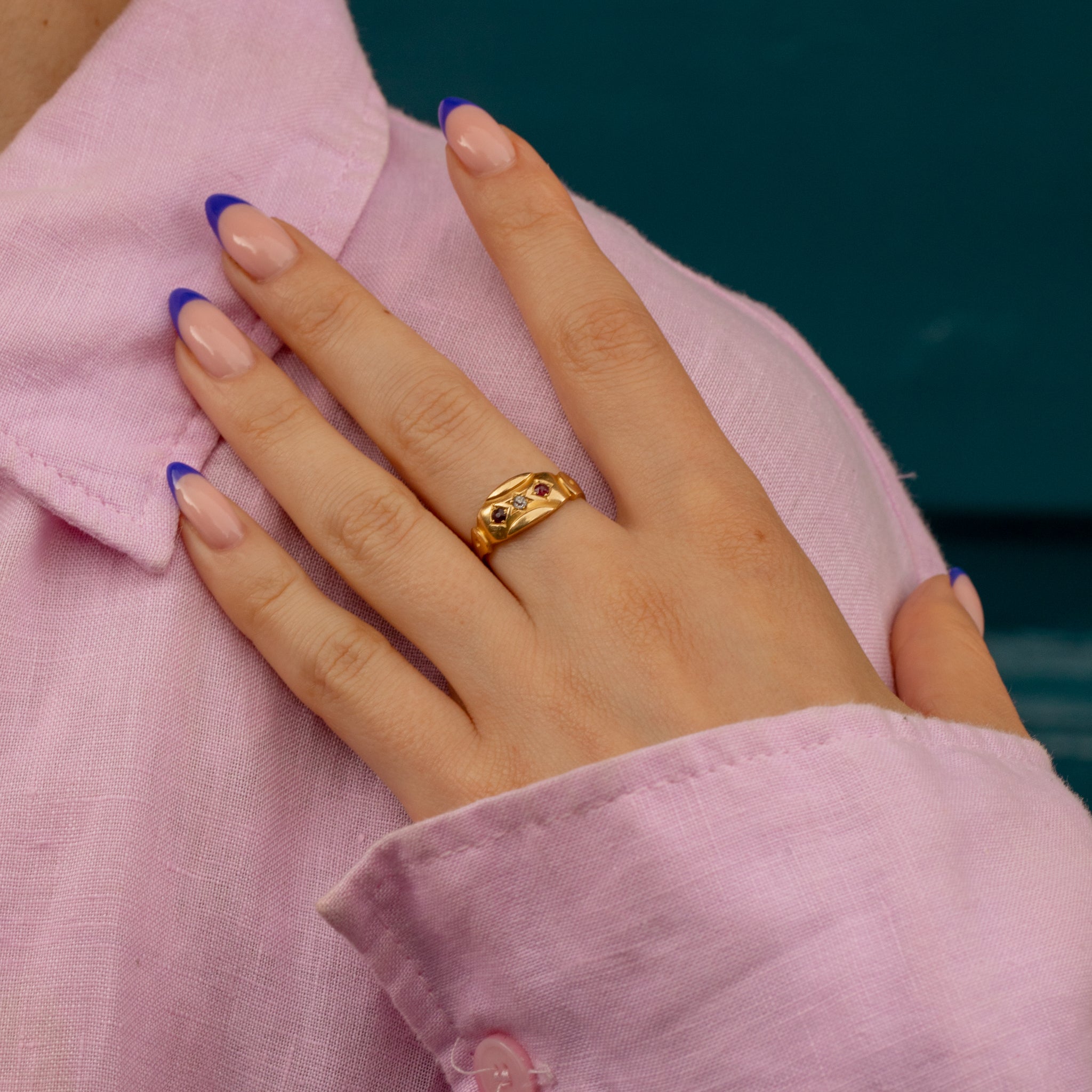 This striking antique 18ct Gold Garnet Diamond gypsy ring will add a unique flare to your ring stack! Beautifully crafted in luxurious 18ct Gold, this chunky delight has been uniquely formed and set with a trio of delectable gemstones.