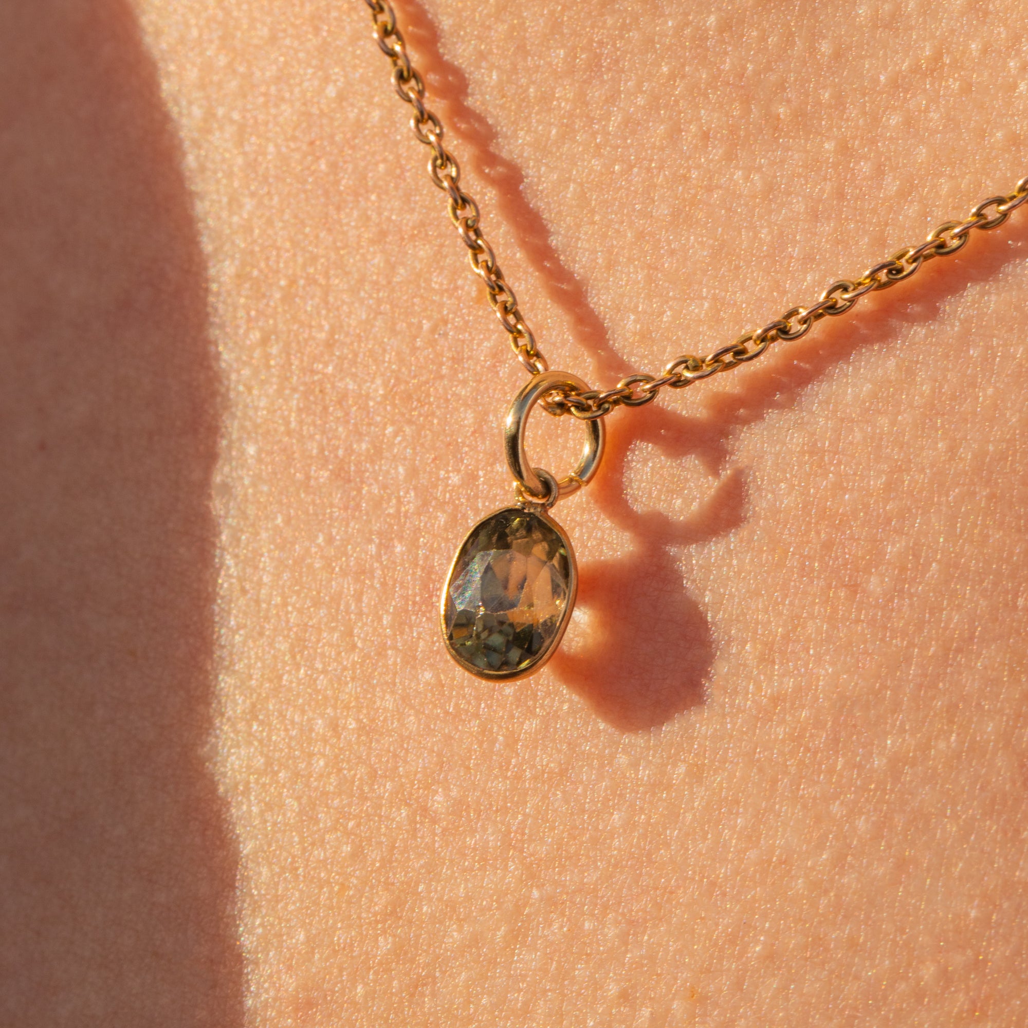 The green 1.89ct Zircon is wonderfully faceted, catching the light beautifully, and highlighting her subtle earthy tones. She is encased in a buttery 18ct Gold bezel setting, making this Edwardian Zircon charm a splendorous addition to any antique jewellery collection. As this antique Gold Zircon charm adorns your neck, her sheer beauty is bound to turn any onlooker green with envy!