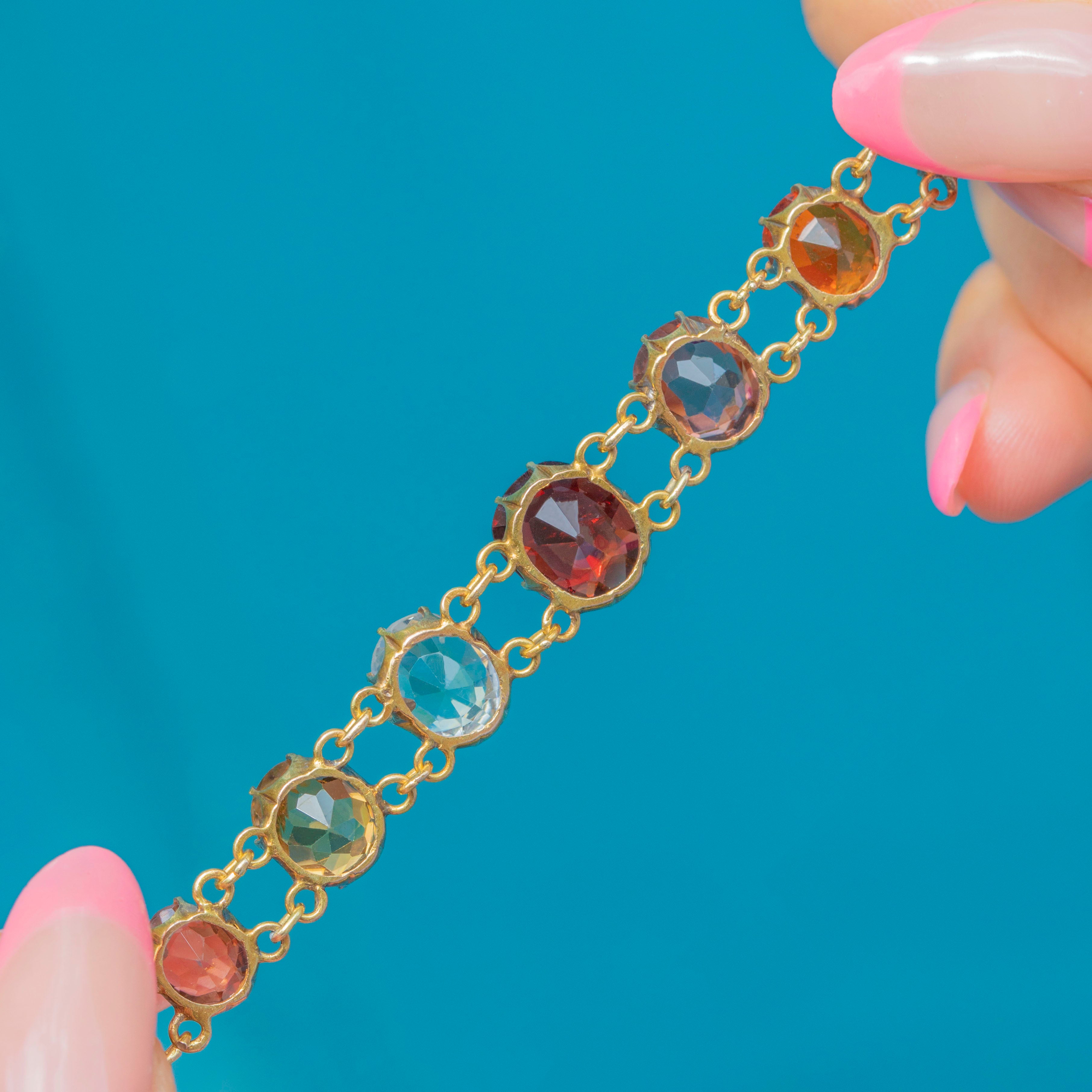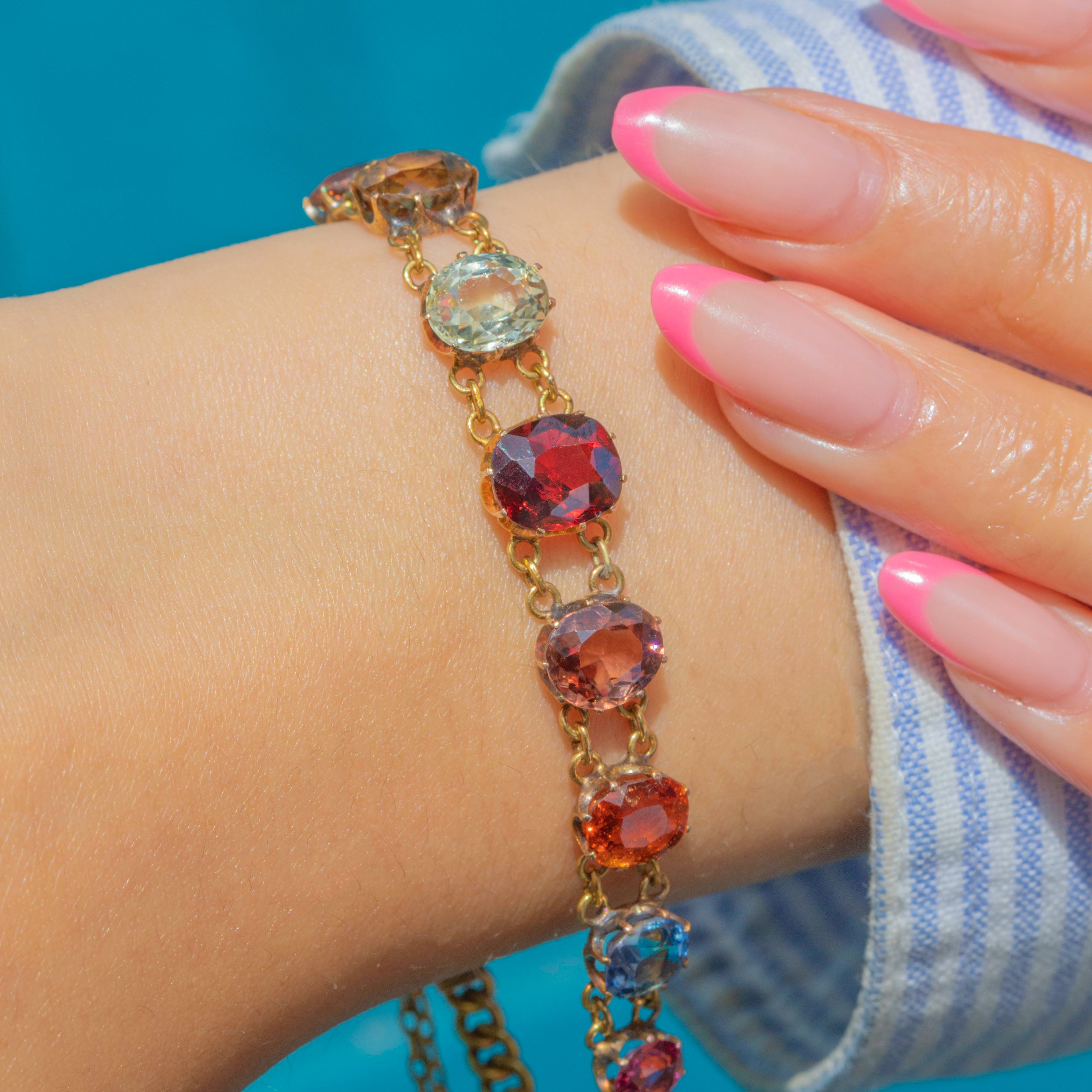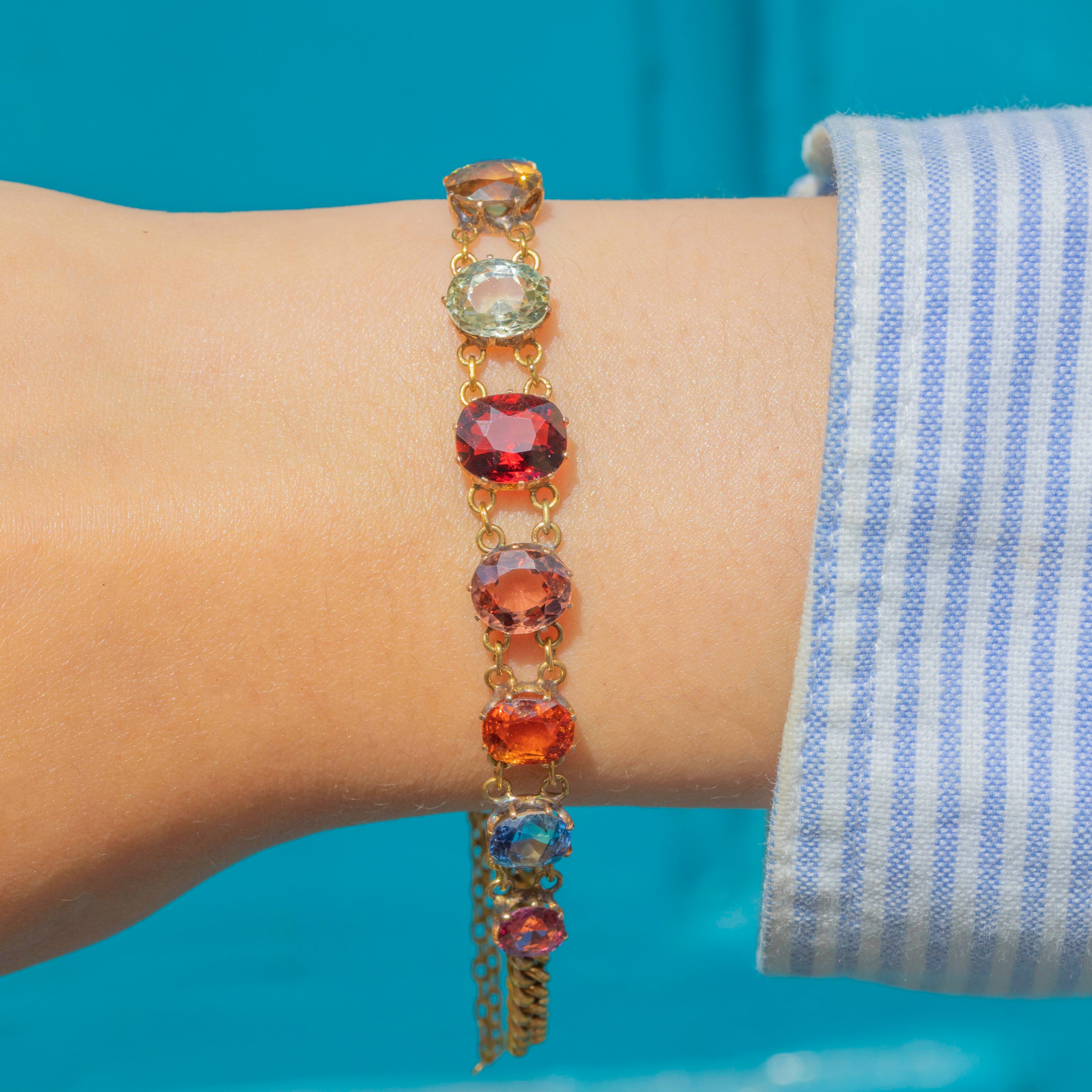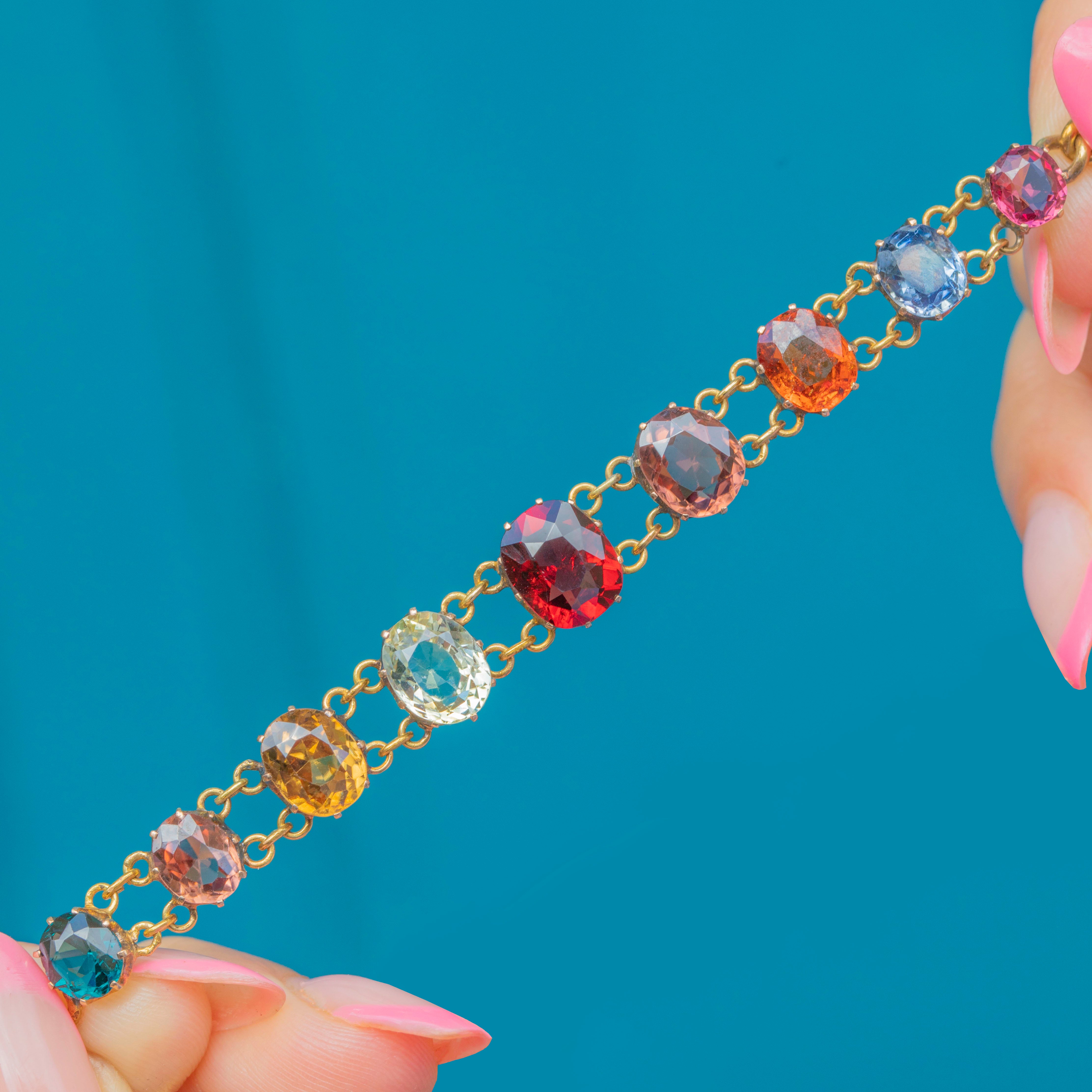 A fantastically beautiful antique 18ct Gold multi-gemstone harlequin multi-gemstone Riviere bracelet to brighten your attire! Comprised of nine gemstones, including Tourmalines, Sapphires, a Citrine and Garnet, this multi-gemstone bracelet is emboldened with glamour and Victorian charm.