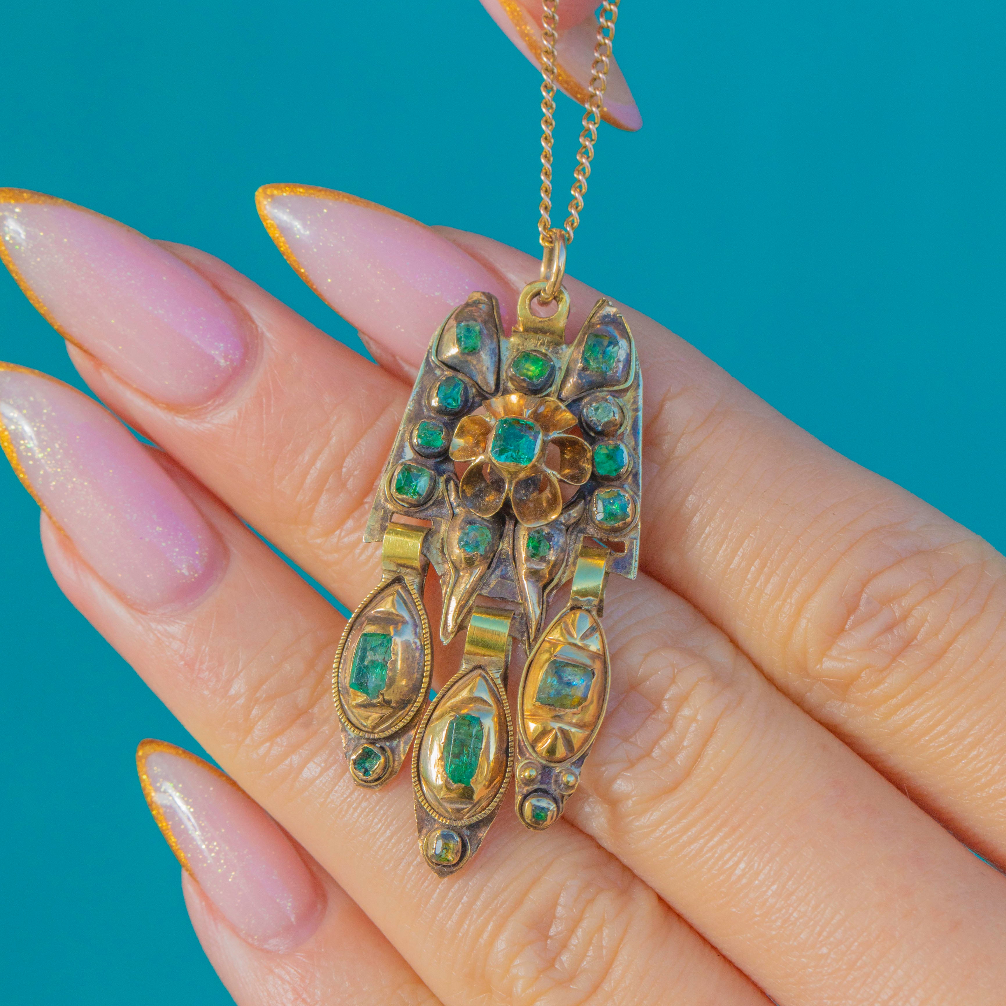 This striking 19th-century Iberian pendant showcases the bold, opulent styling characteristic of Iberian jewellery. Originally crafted as an earring, the pendant is made in rich high-carat Gold and set with vibrant natural Emeralds, each stone glowing with bright green colour and enhanced by traditional foiling behind the gems—an authentic historic technique that adds depth and radiance.