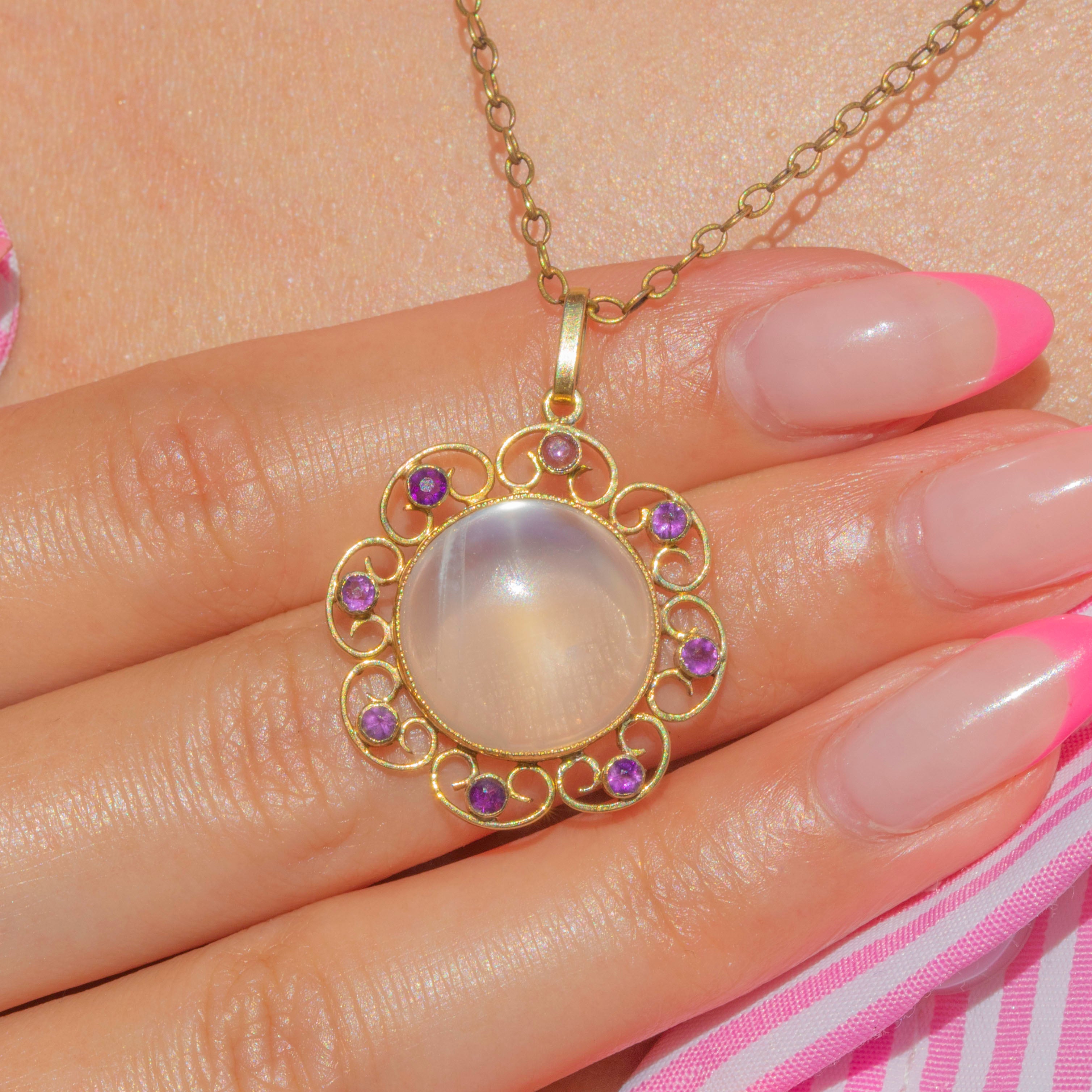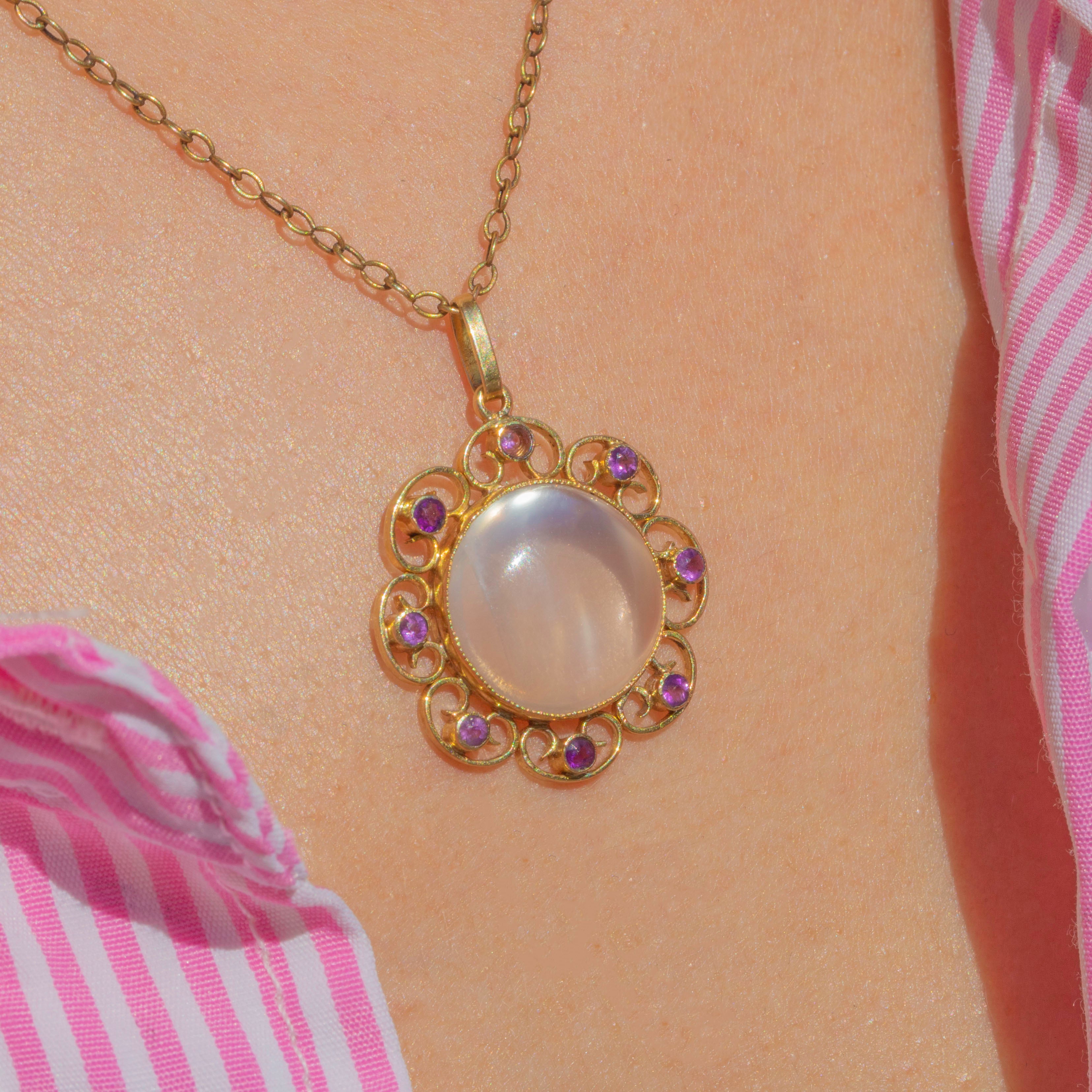 Add Victorian charm to your décolletage with this antique 18ct Gold Moonstone and Amethyst pendant!