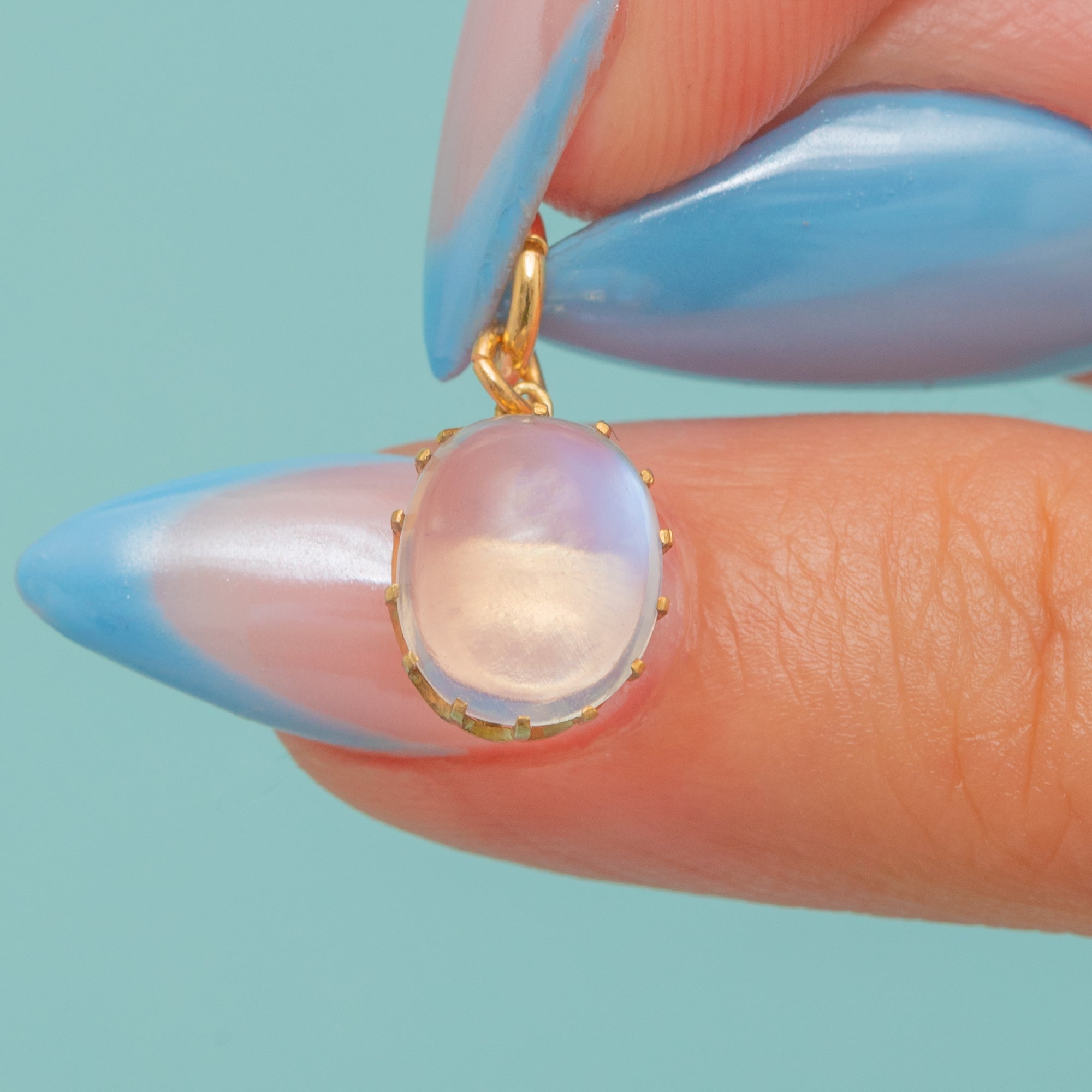 This Victorian Moonstone charm is just the sweetest thing! The high-domed 1.00ct Moonstone glows with an ethereal blue adularescence as it moves in the light, and is hugged by elegant 18ct Gold claws for a refined finish.