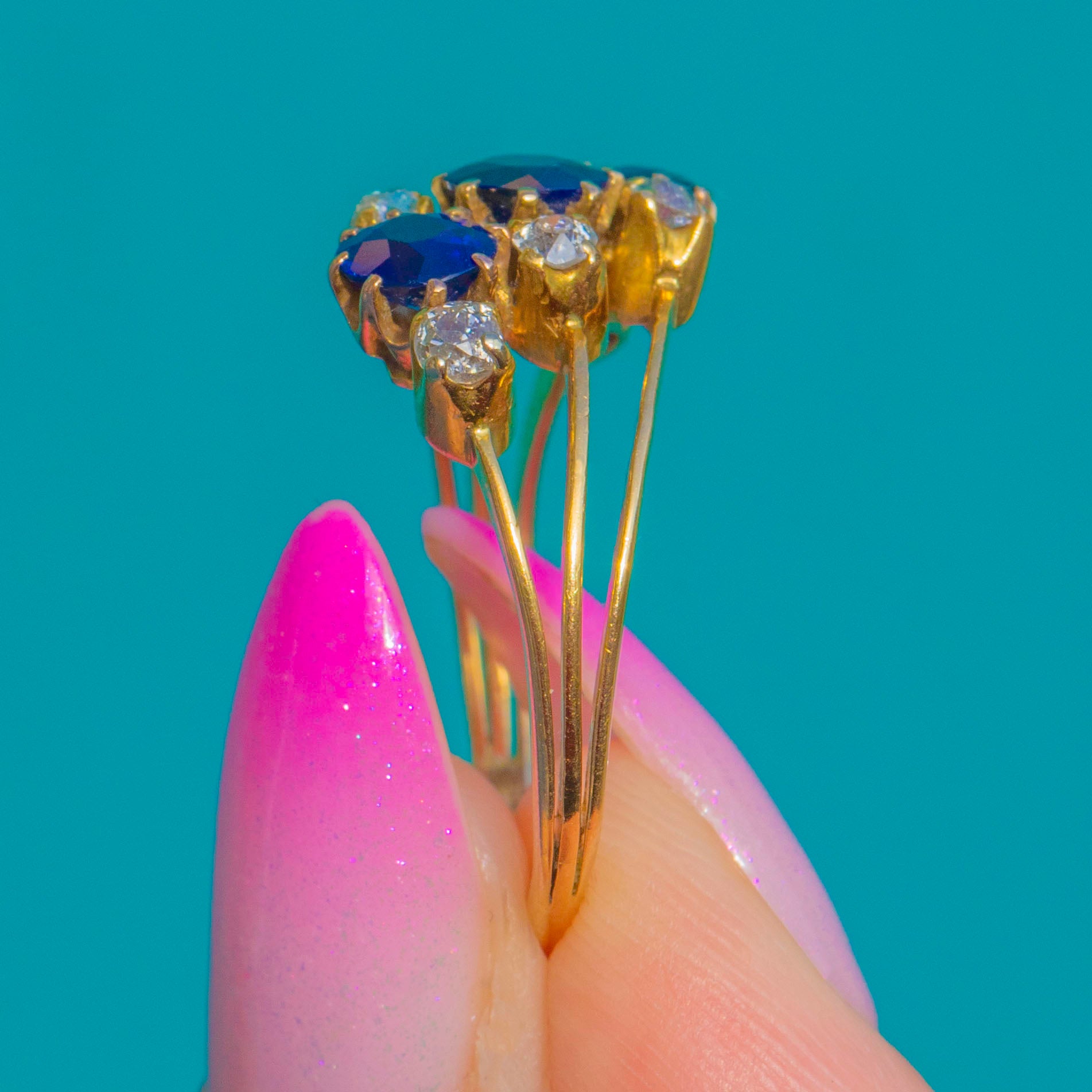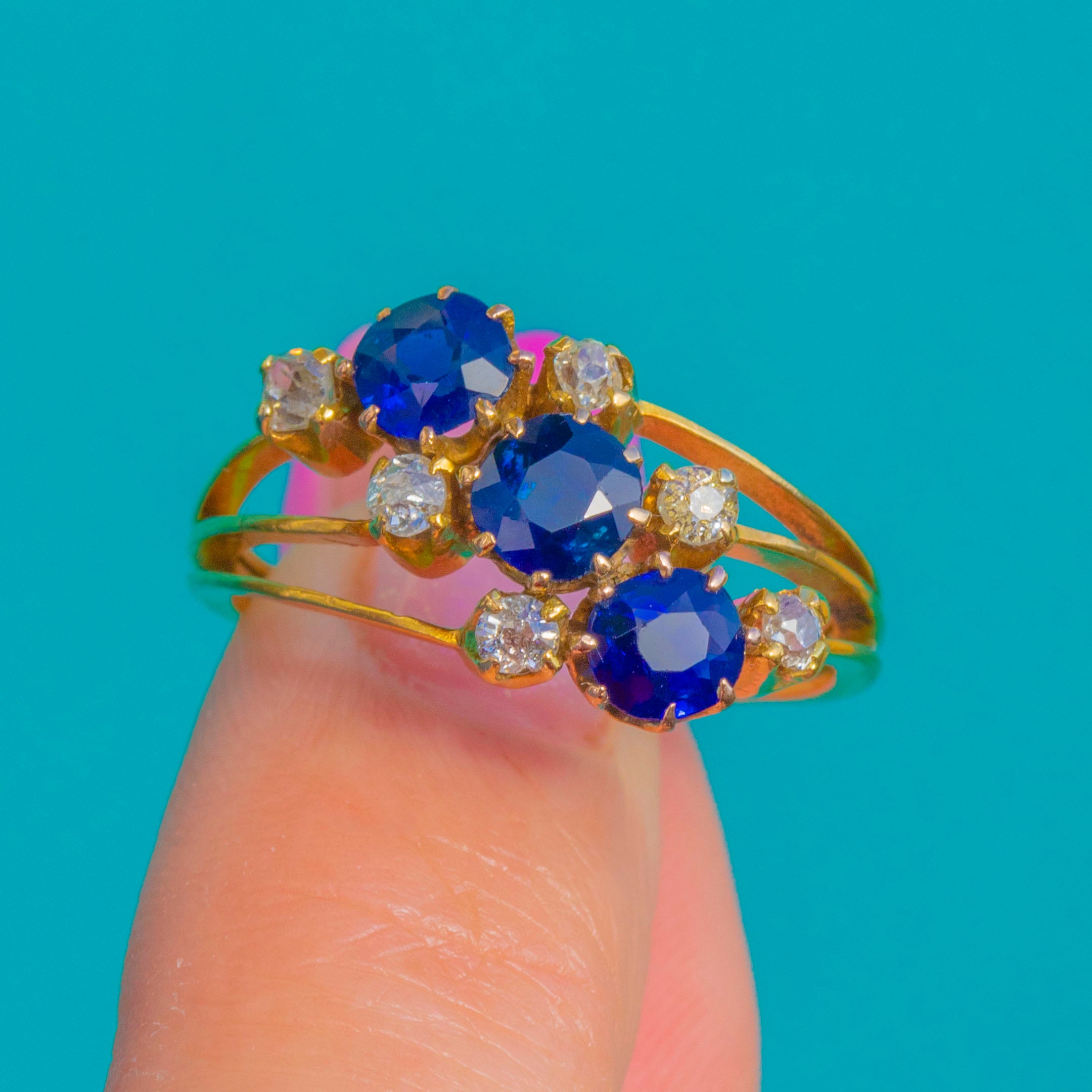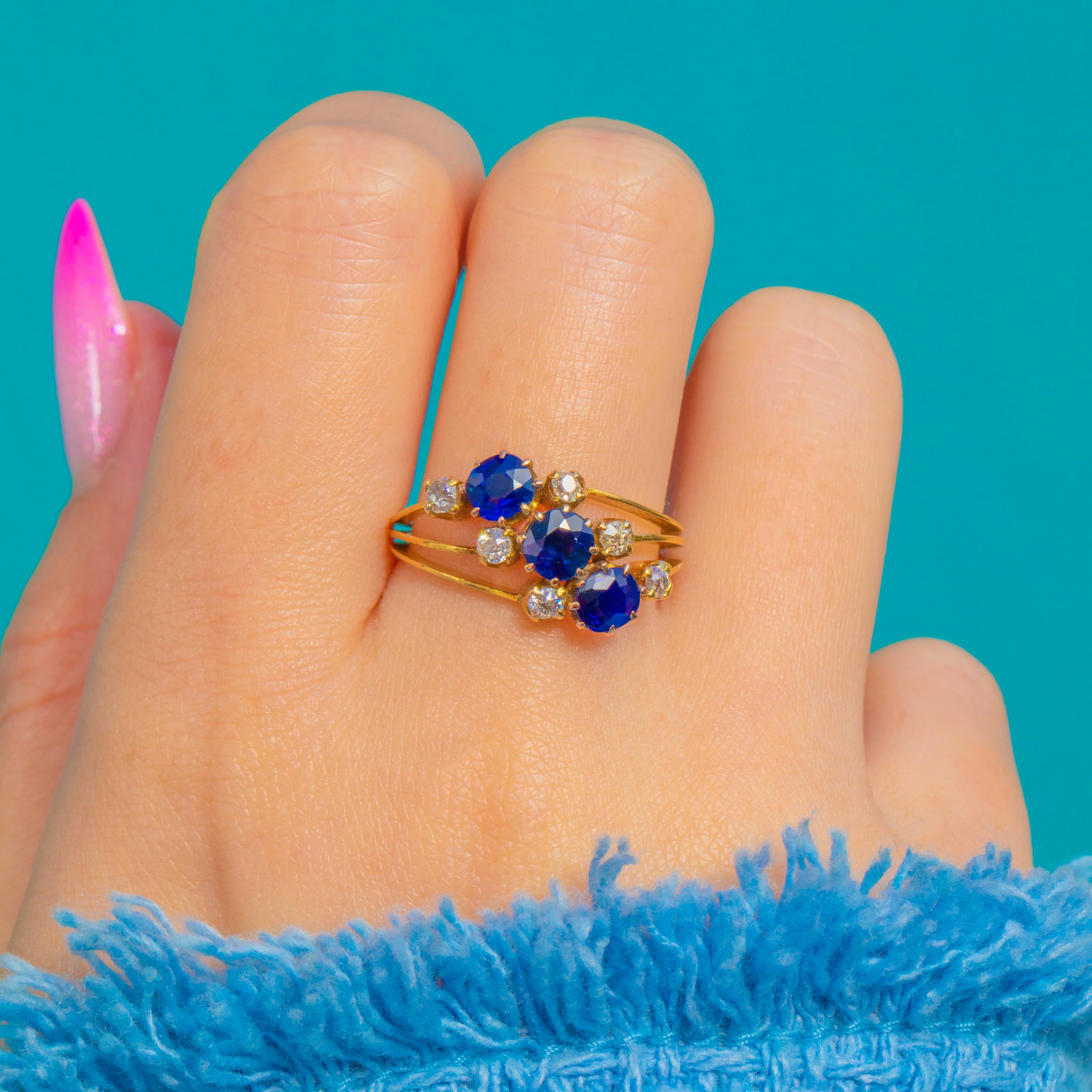 A glowing Victorian “Hareem” ring in rich 18ct Gold, set with a trilogy of deep blue Sapphires framed by six scintillating old mine-cut Diamonds. The 1.50cts natural Sapphires offer a saturated, velvety midnight hue, beautifully lifted by the Diamonds’ antique sparkle for a refined, romantic presence on the hand.