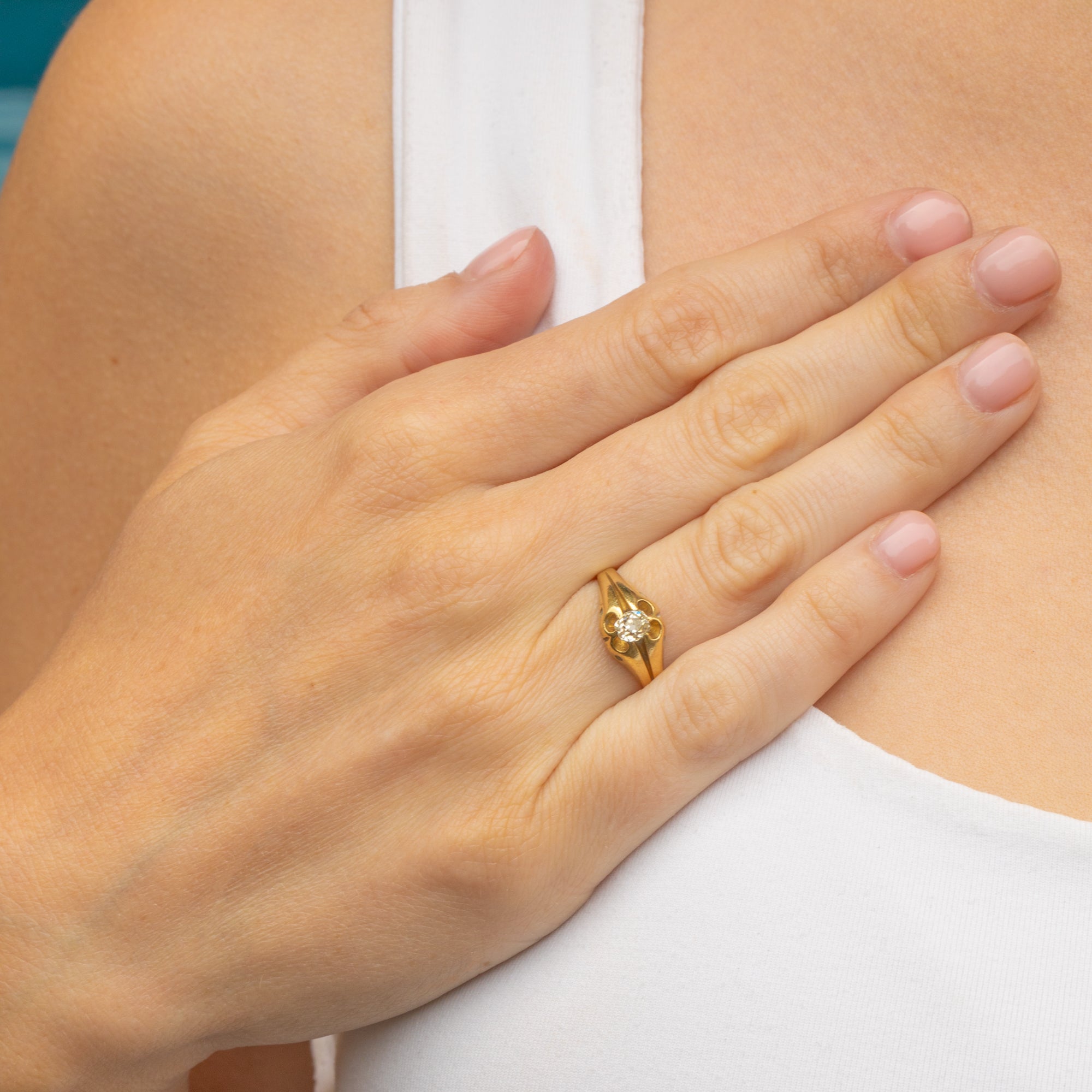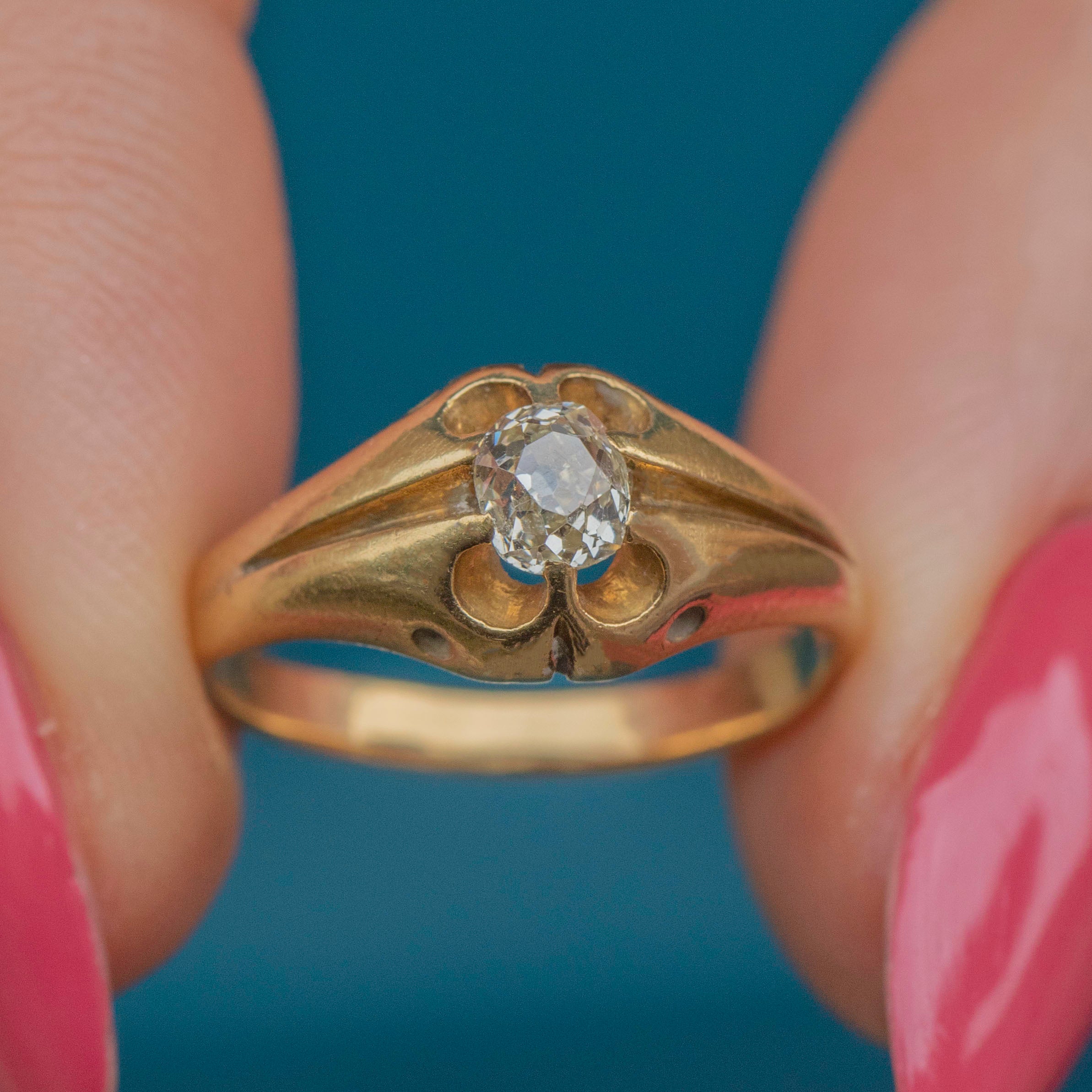 Bring classic chic to your hand with this antique 18ct Gold old-mine cut Diamond ring! Held in curvaceous and traditionally Victorian buttercup settings is a scintillating 0.40ct old-mine cut Diamond, with the light bouncing off her facets from every angle.