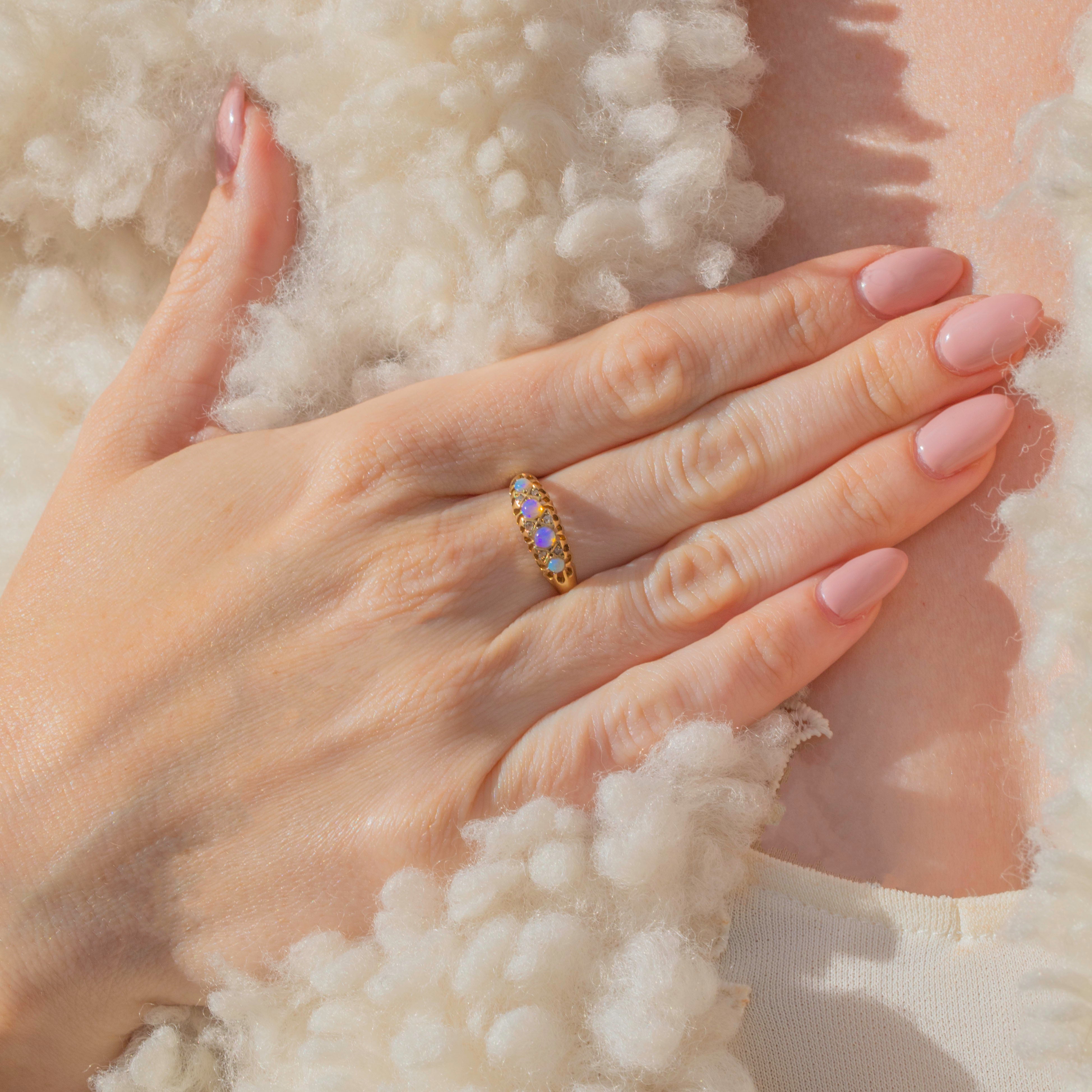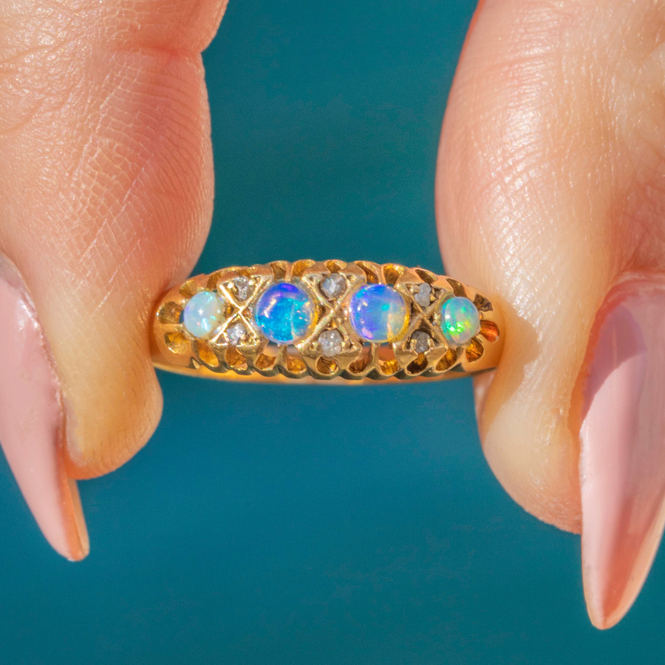 EXCELLENT. This antique 18ct Gold Opal Diamond boat ring is in wonderful condition. Her iridescent Opals look magical in the light, and are free from chips or scuffs, and her surrounding Diamonds are all present. The stones sit securely within a warm 18ct Gold setting and band, free from any visible signs of wear. In such superb condition, this Victorian ring is a must-have!