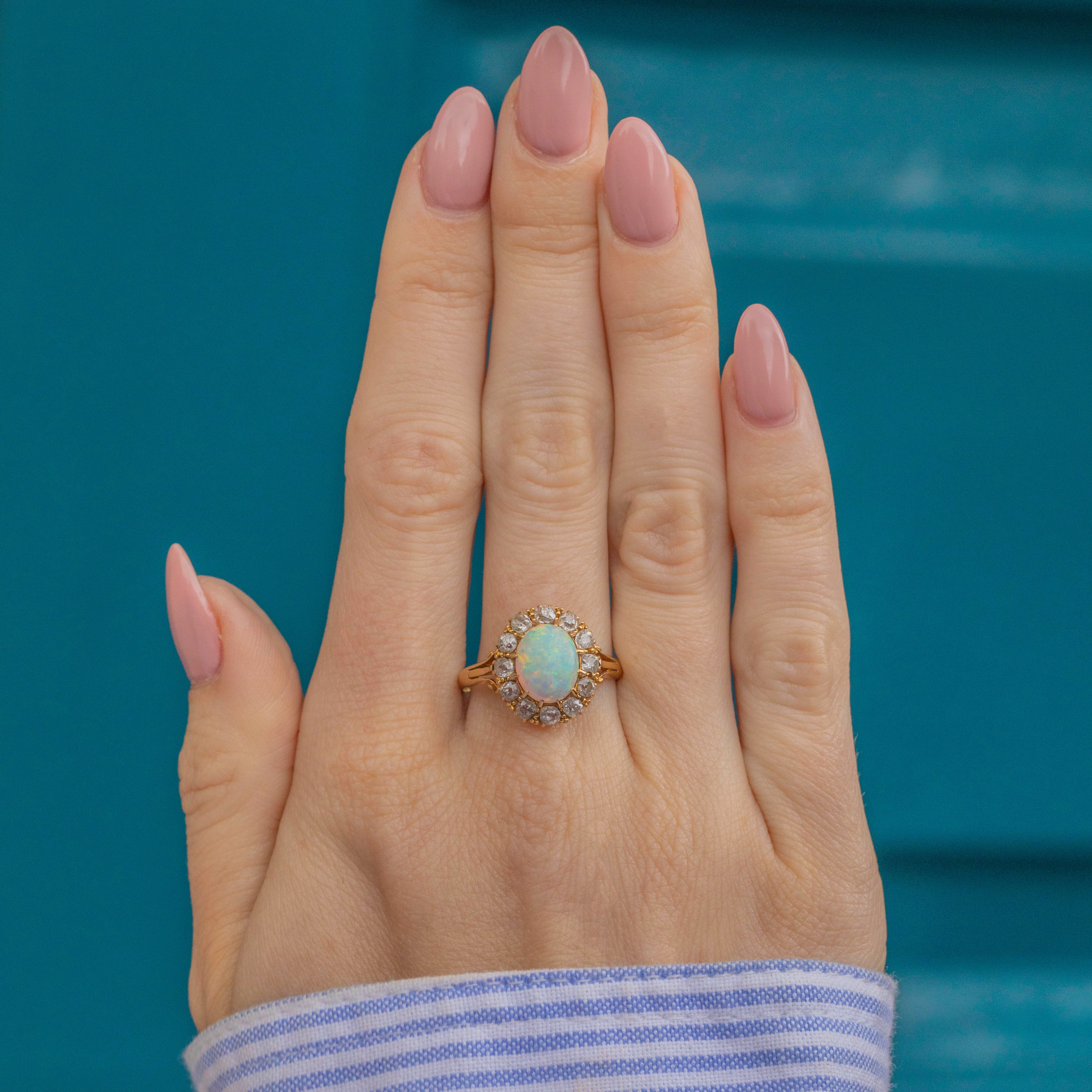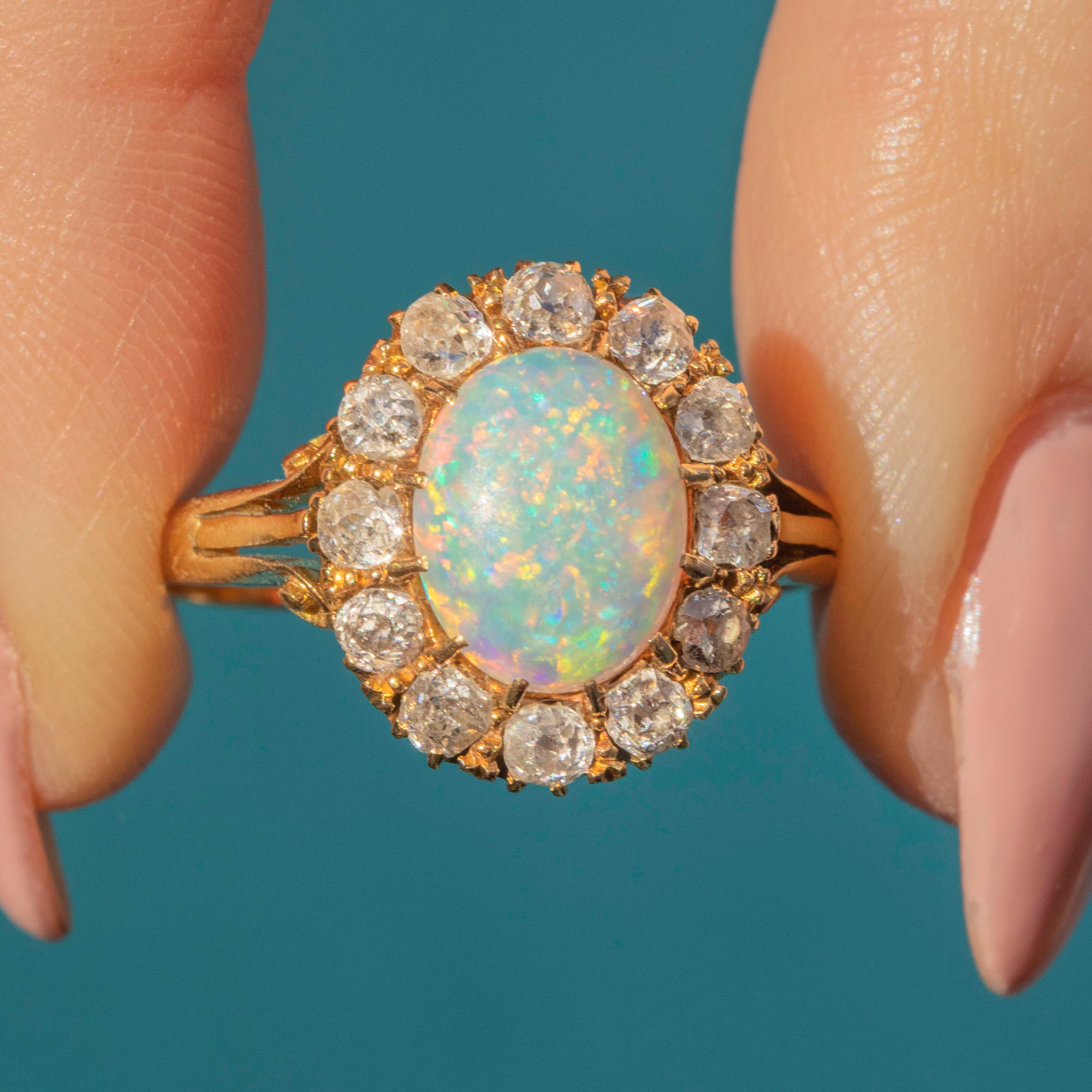 EXCELLENT. This antique 18ct Gold Opal Diamond cluster ring is in excellent condition. The Opal is smooth and free from signs of wear, securely held within its claw settings. The Diamonds are all present and free from fleabites, providing this antique ring with ample sparkle. The 18ct Gold has an even saturation throughout and the ring band has remained robust allowing you to wear this Victorian Opal Diamond ring with absolute confidence. With many more years of wear in her, this splendid piece of Victorian jewellery would make a fabulous heirloom to be passed down the generations!