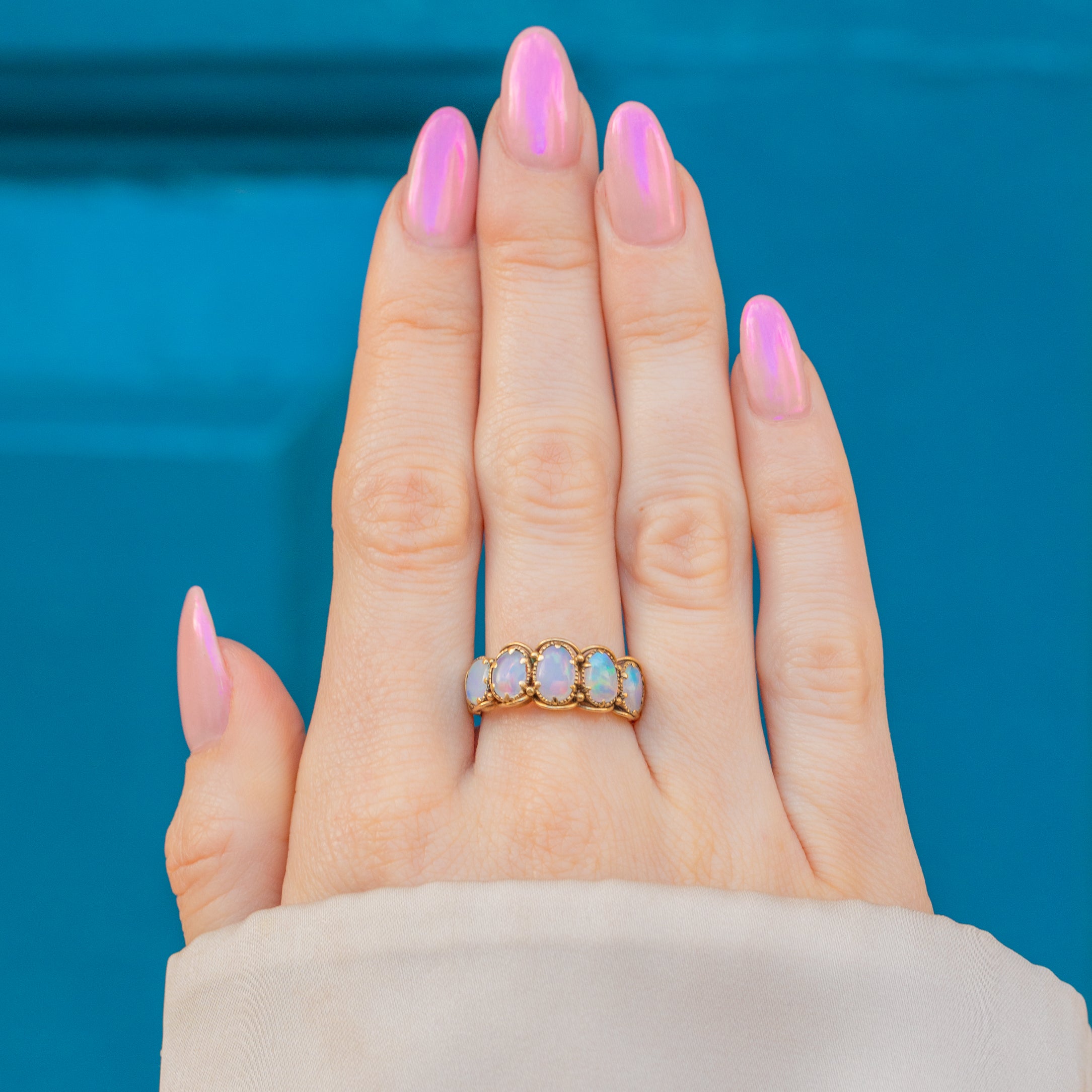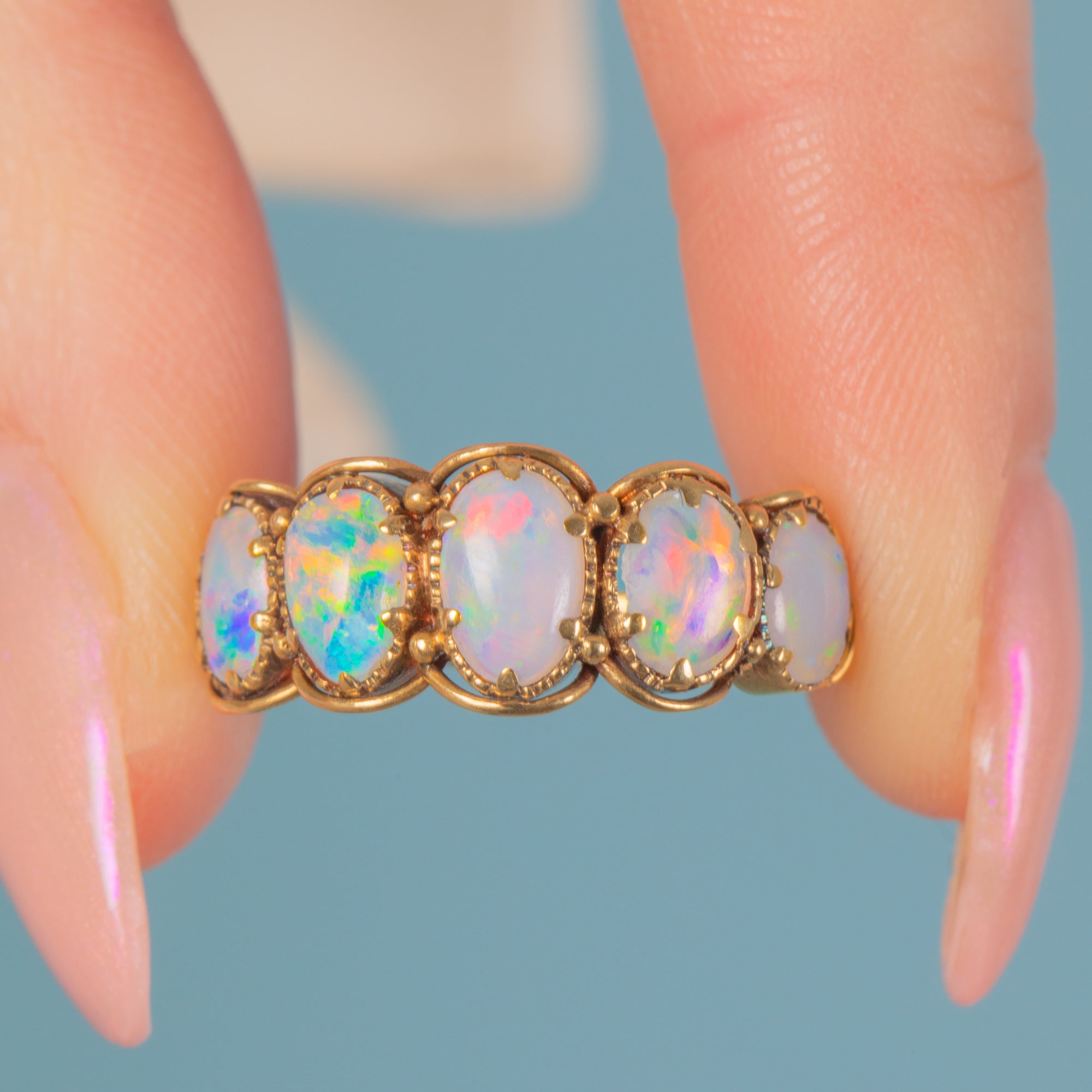 This jaw-dropping antique 18ct Gold Opal five stone ring will bring you all the right kind of attention! Crafted from luxurious sunshine-yellow 18ct Gold, she encases five luminous Opal cabochons, each with a galactic milky hue, fit for a space princess!