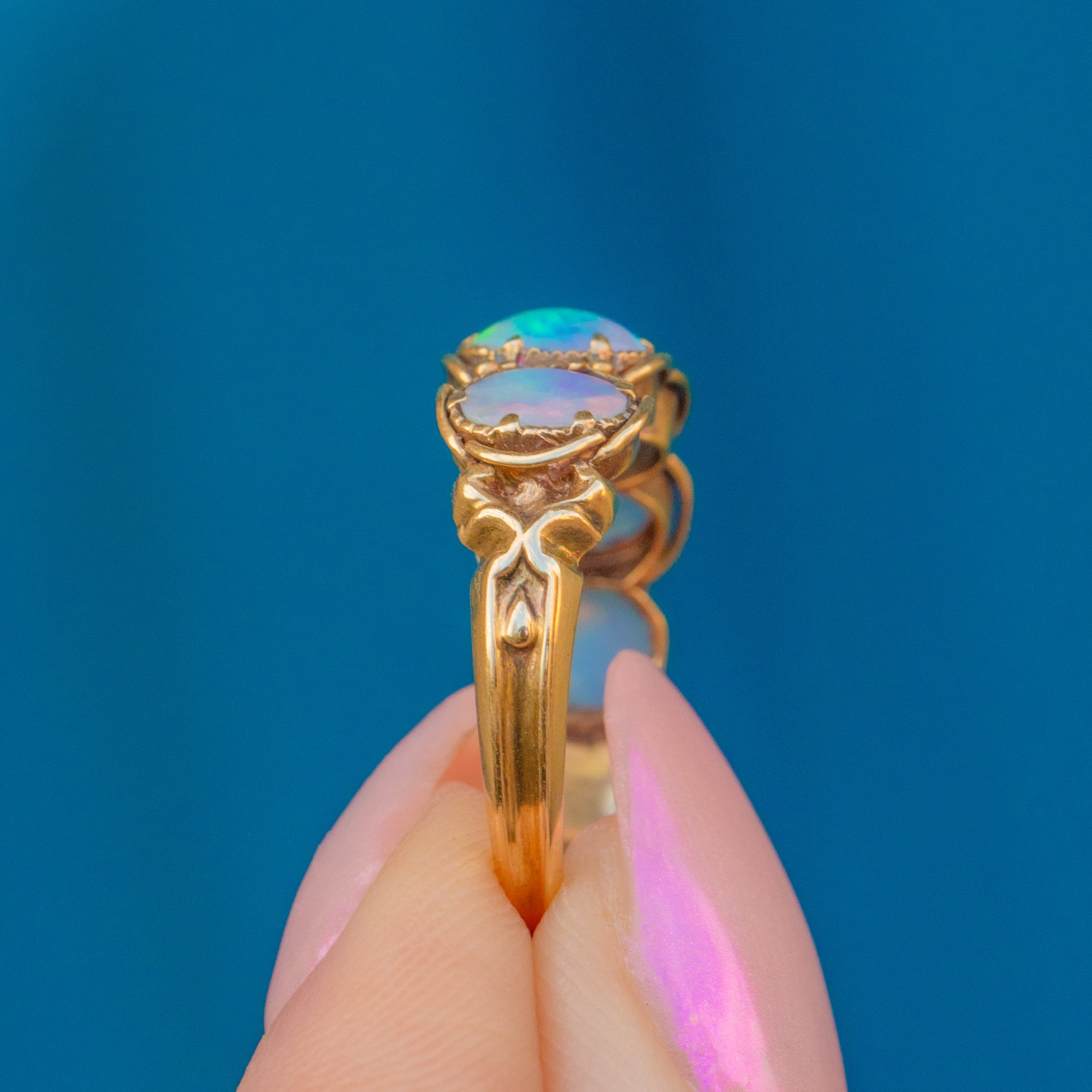 Each magical Opal exudes flashes of fluorescent greens, flaming oranges, and fuchsia pinks, encased in exquisitely detailed settings. A real Victorian showstopper, this antique Opal ring will prove hard to resist.