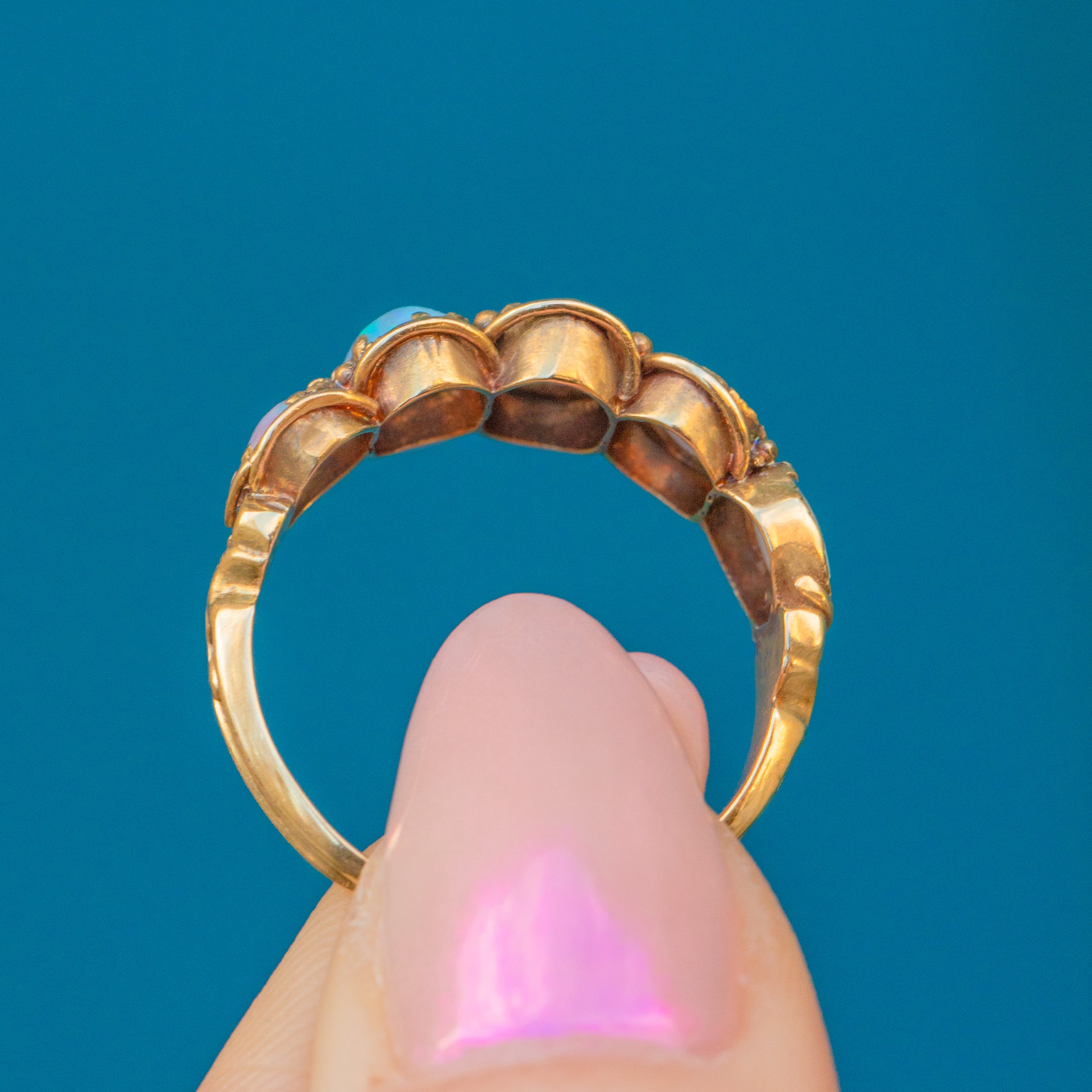 VERY GOOD. This antique 18ct Gold Opal five stone ring is in excellent condition throughout! Her Opal cabochons are vibrant and lively, perfectly domed and smooth to the touch. There is one scratch on the back of one of the Opals, however, this is only visible from the back of the ring. Crafted from richly saturated 18ct Gold her slender band remains ever so comfortable to wear. What a treat!