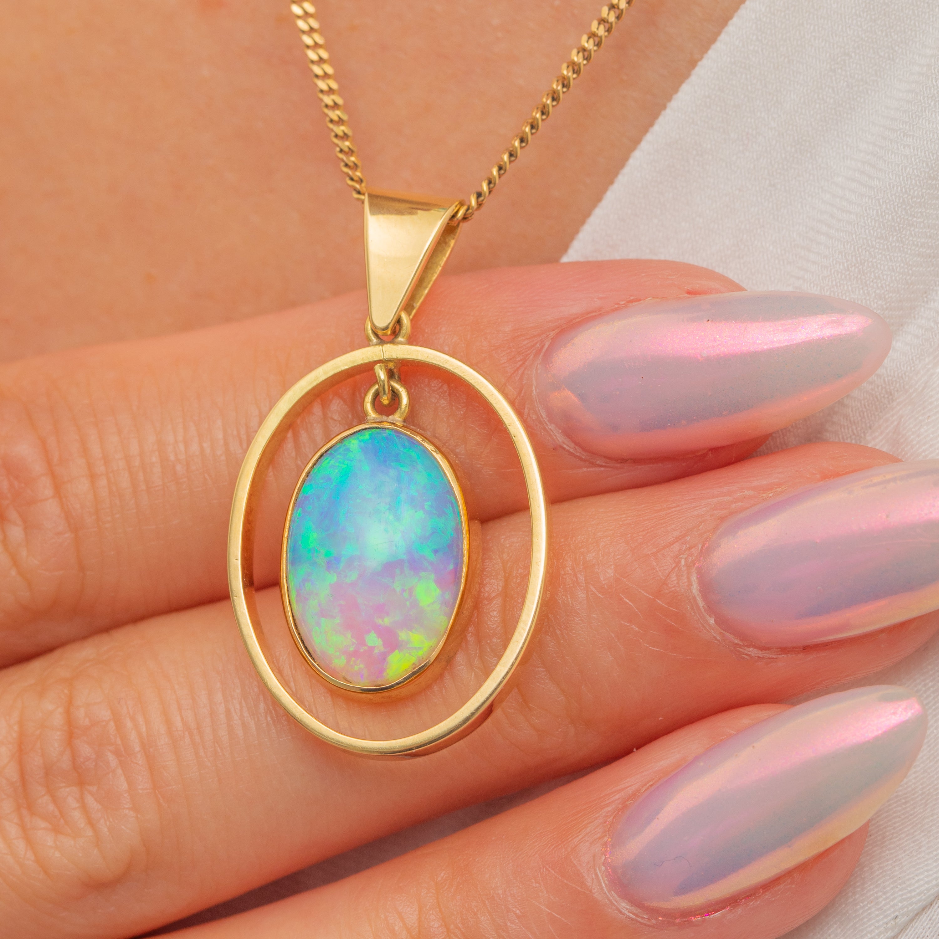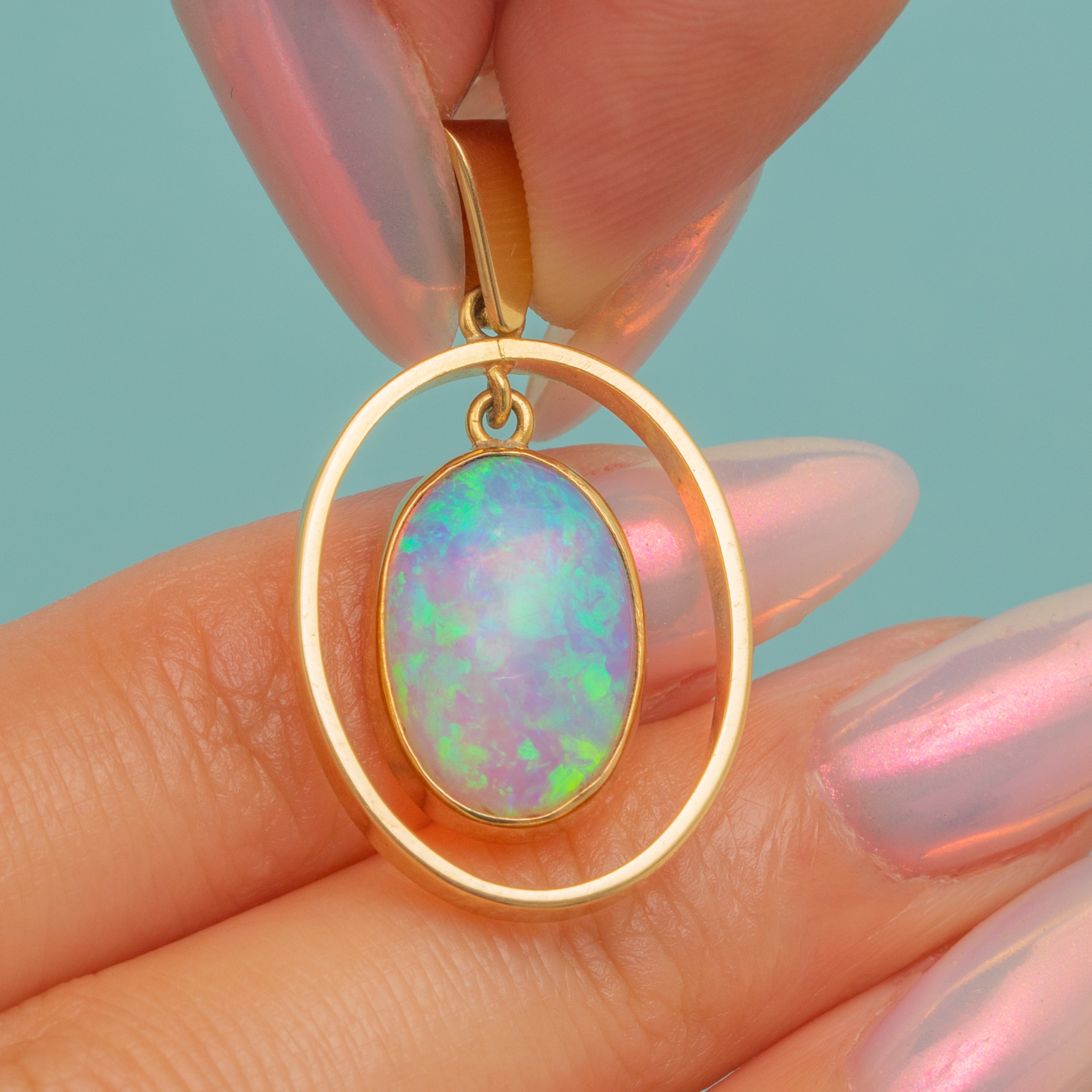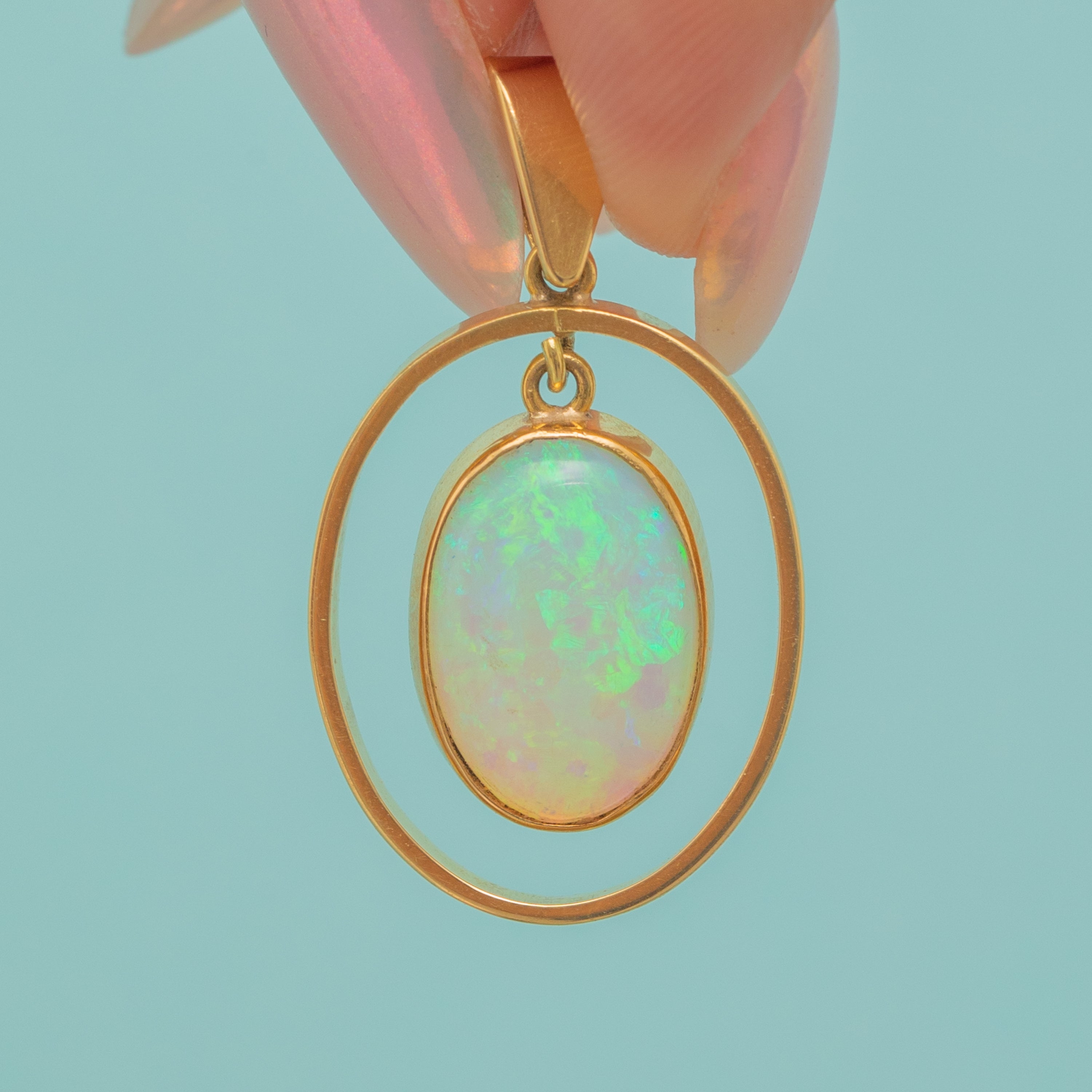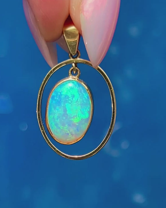We are pleased to present this irresistible antique 18ct Gold Opal pendant! Her natural solid 2.05ct Opal boasts a firework display of colours, from azure blues to vivid greens, and pinks bursting from her depths from every side.