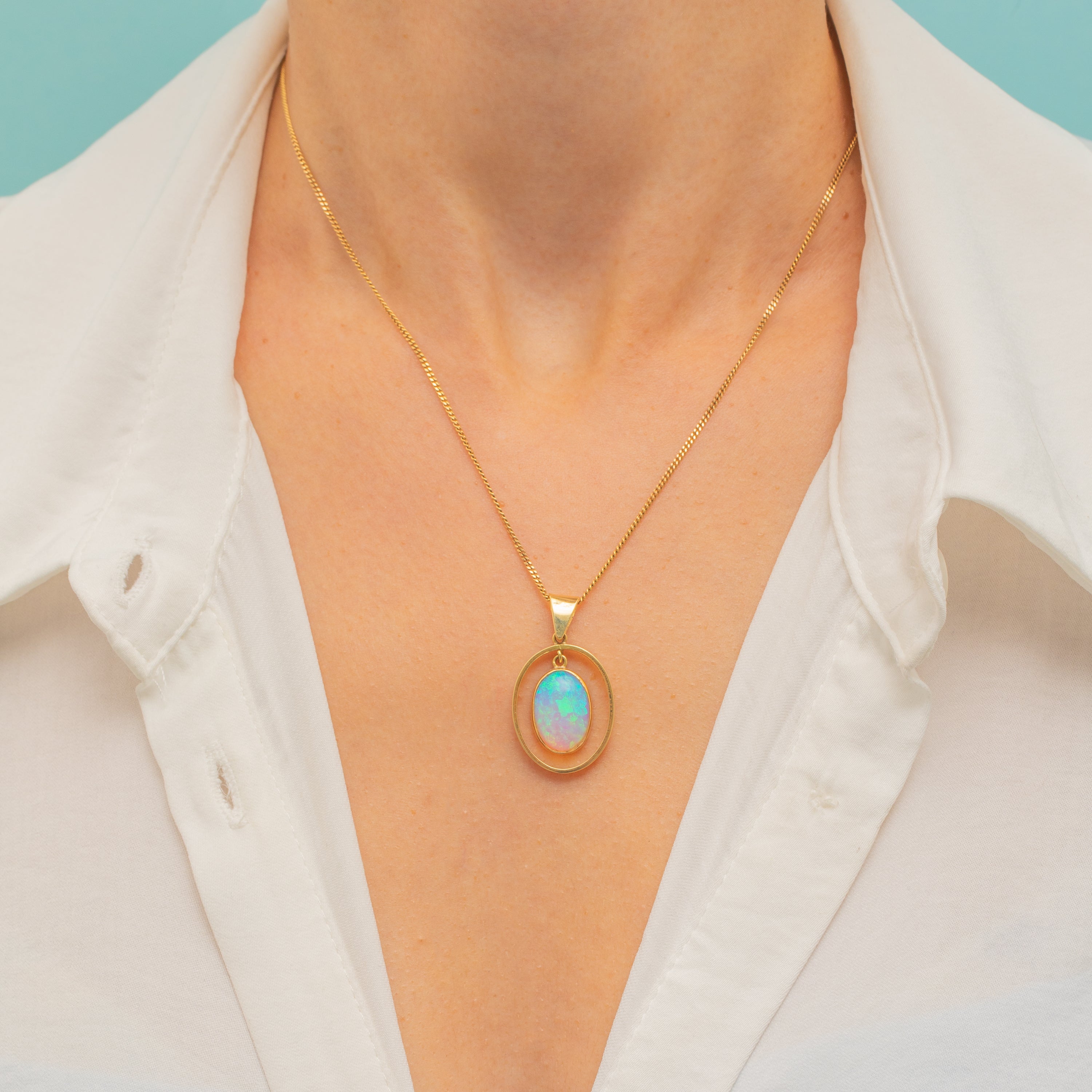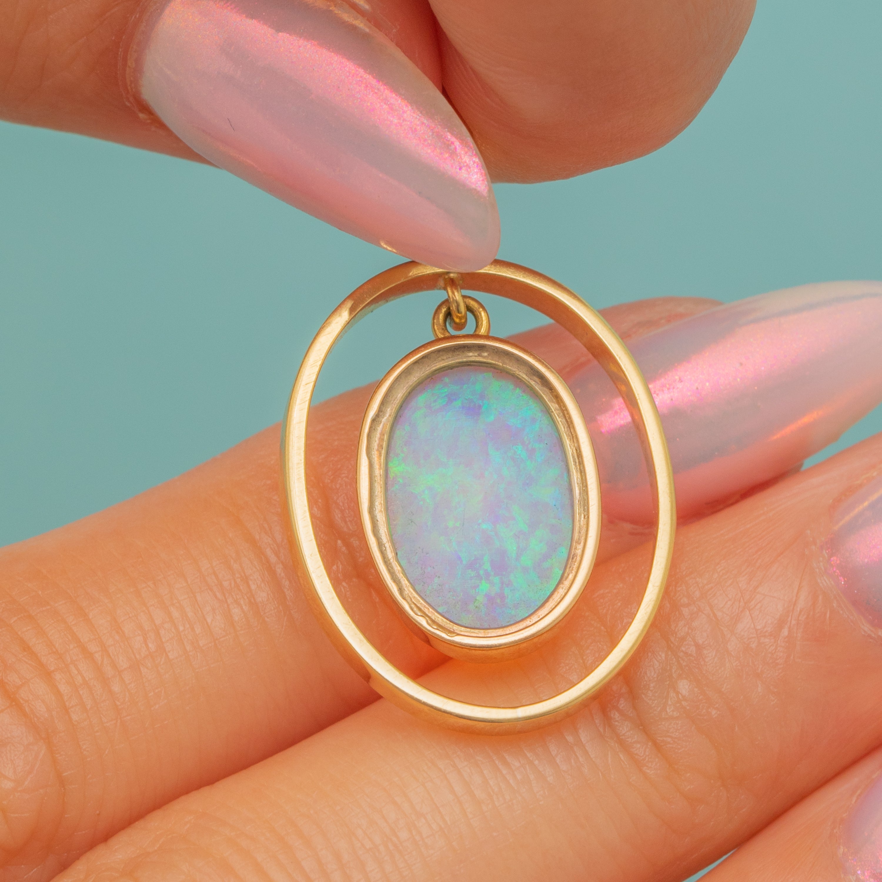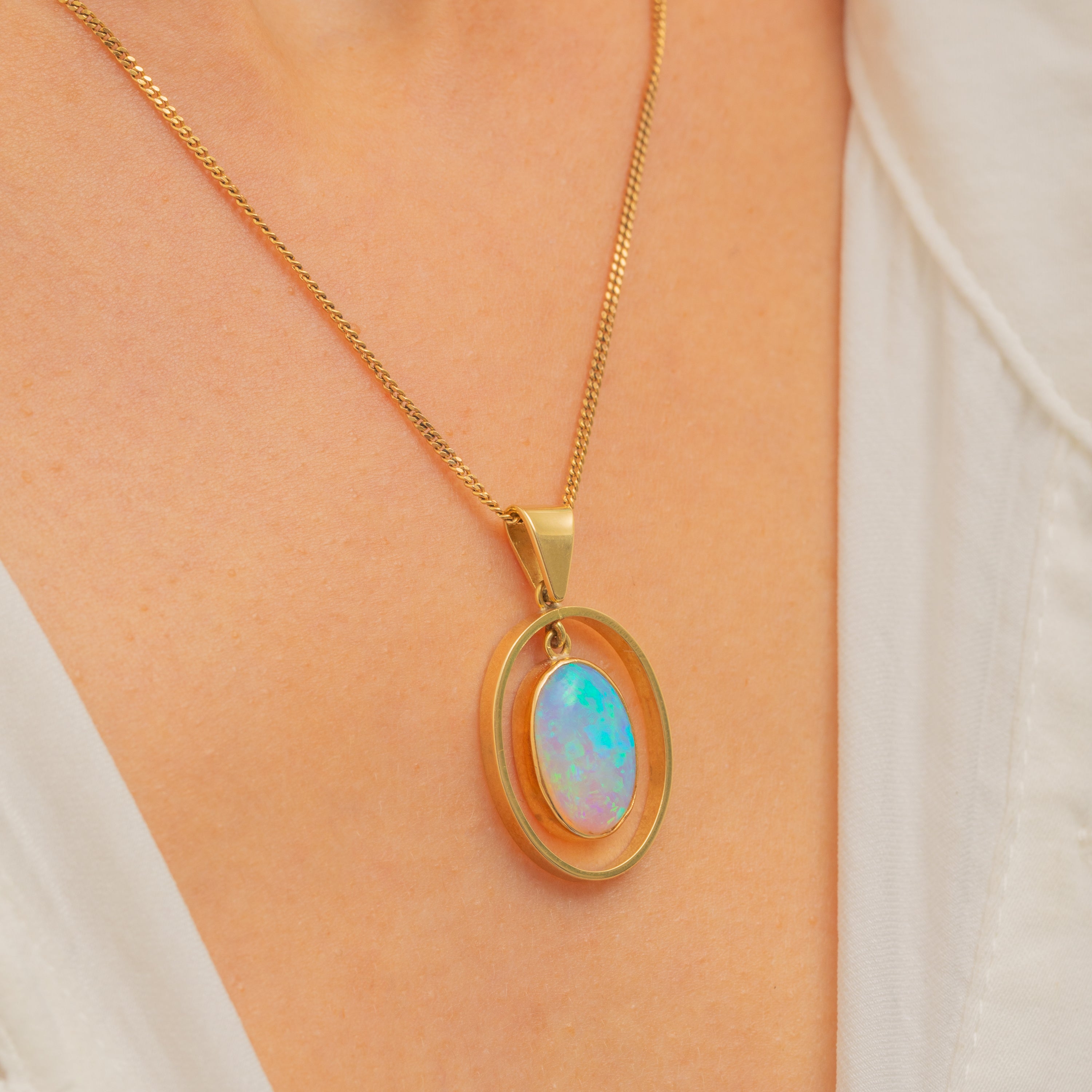 We are pleased to present this irresistible antique 18ct Gold Opal pendant! Her natural solid 2.05ct Opal boasts a firework display of colours, from azure blues to vivid greens, and pinks bursting from her depths from every side.