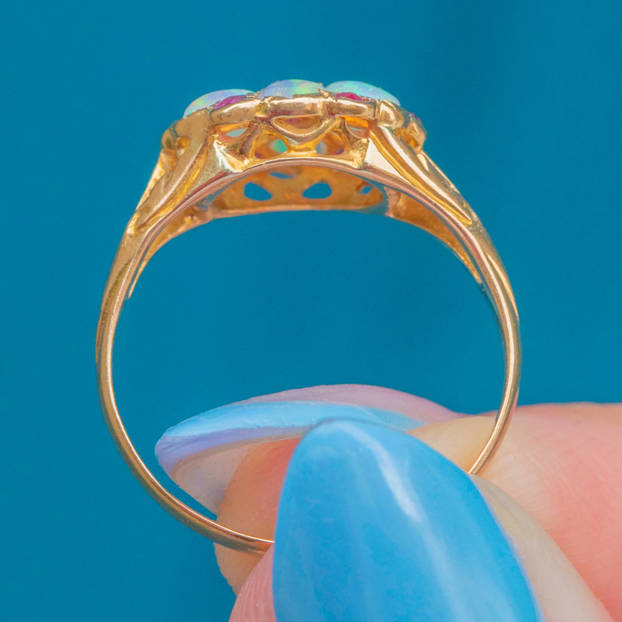 This lively antique ring is crafted from solid 18ct Gold and has a spectacular display of vibrant Opals and fuchsia Rubies arranged into a charming flower cluster. Each Opal cabochon shimmers with ethereal blues and grees, with specks of orange and pink revealed as they move in the light.