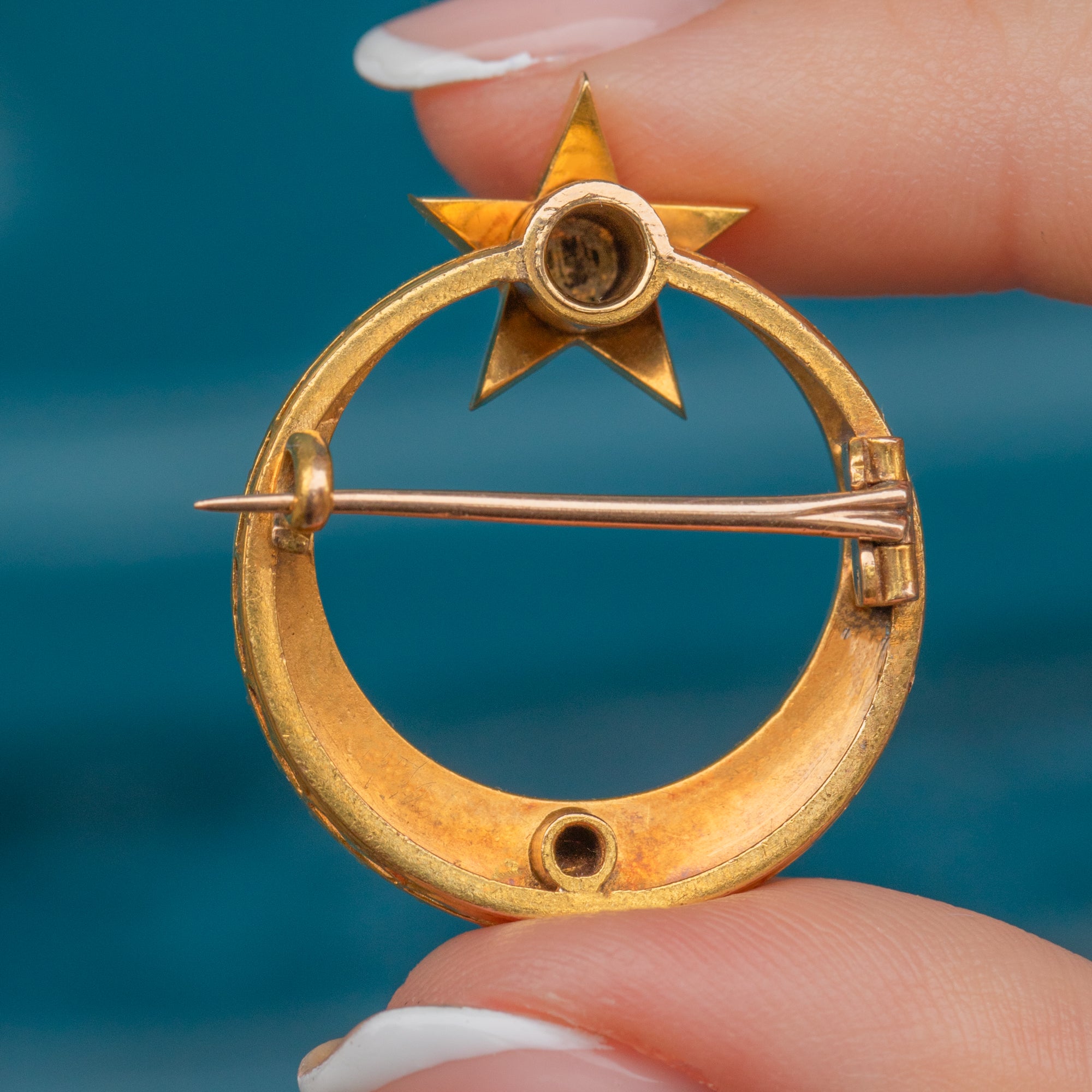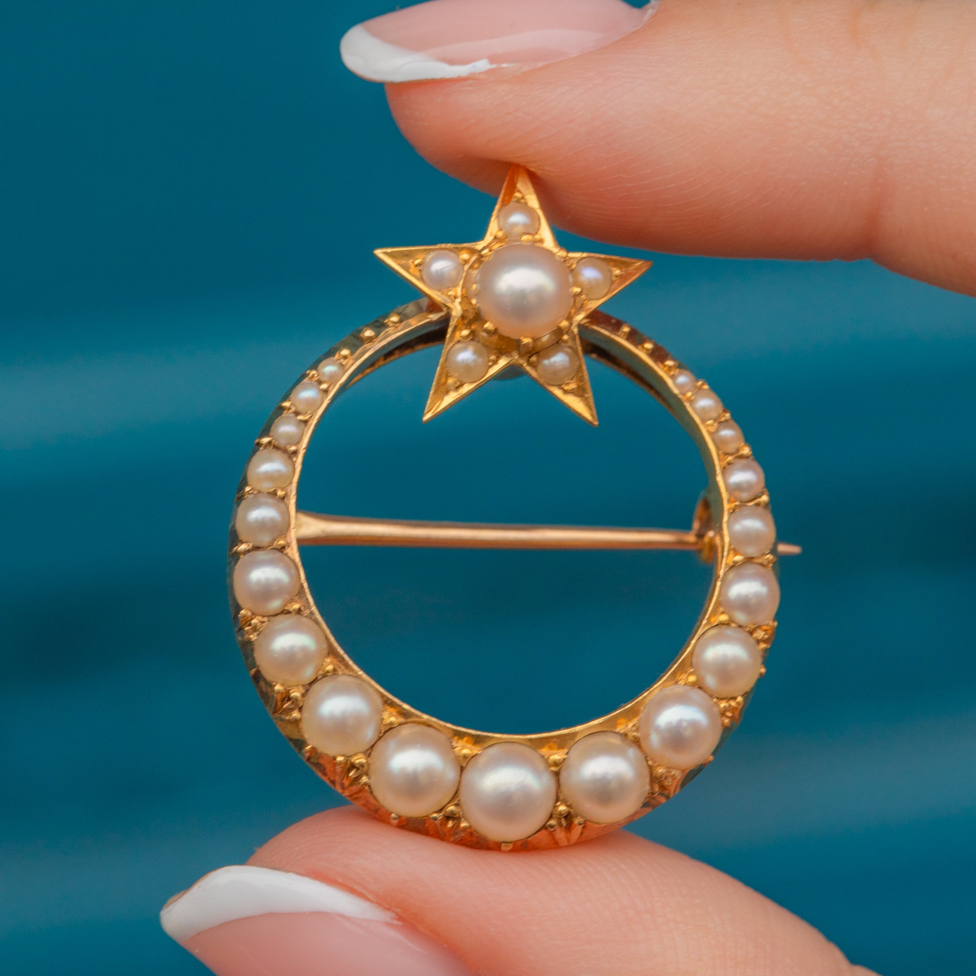 Antique 18ct Gold Pearl Crescent Moon & Star Brooch, Original Fitted Box