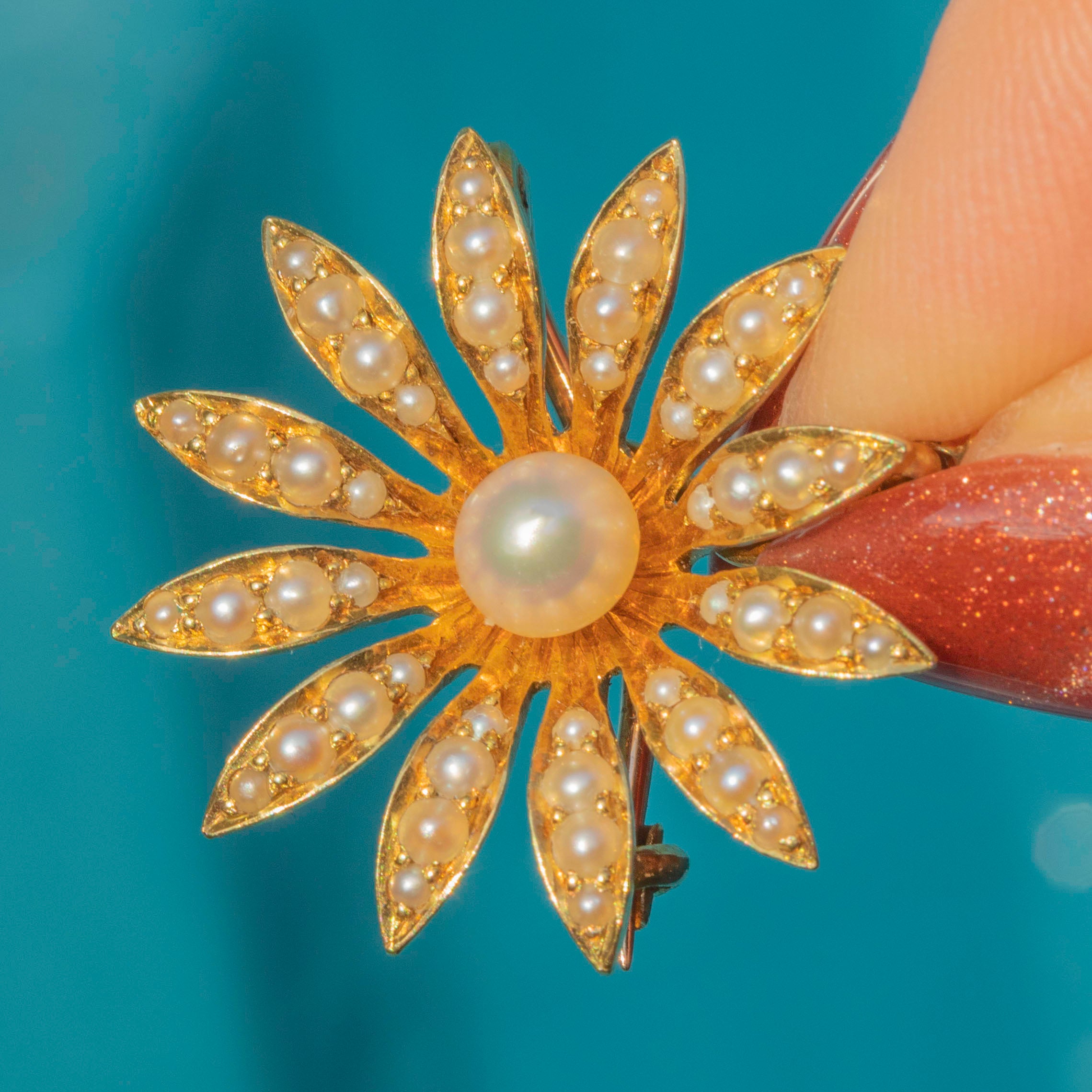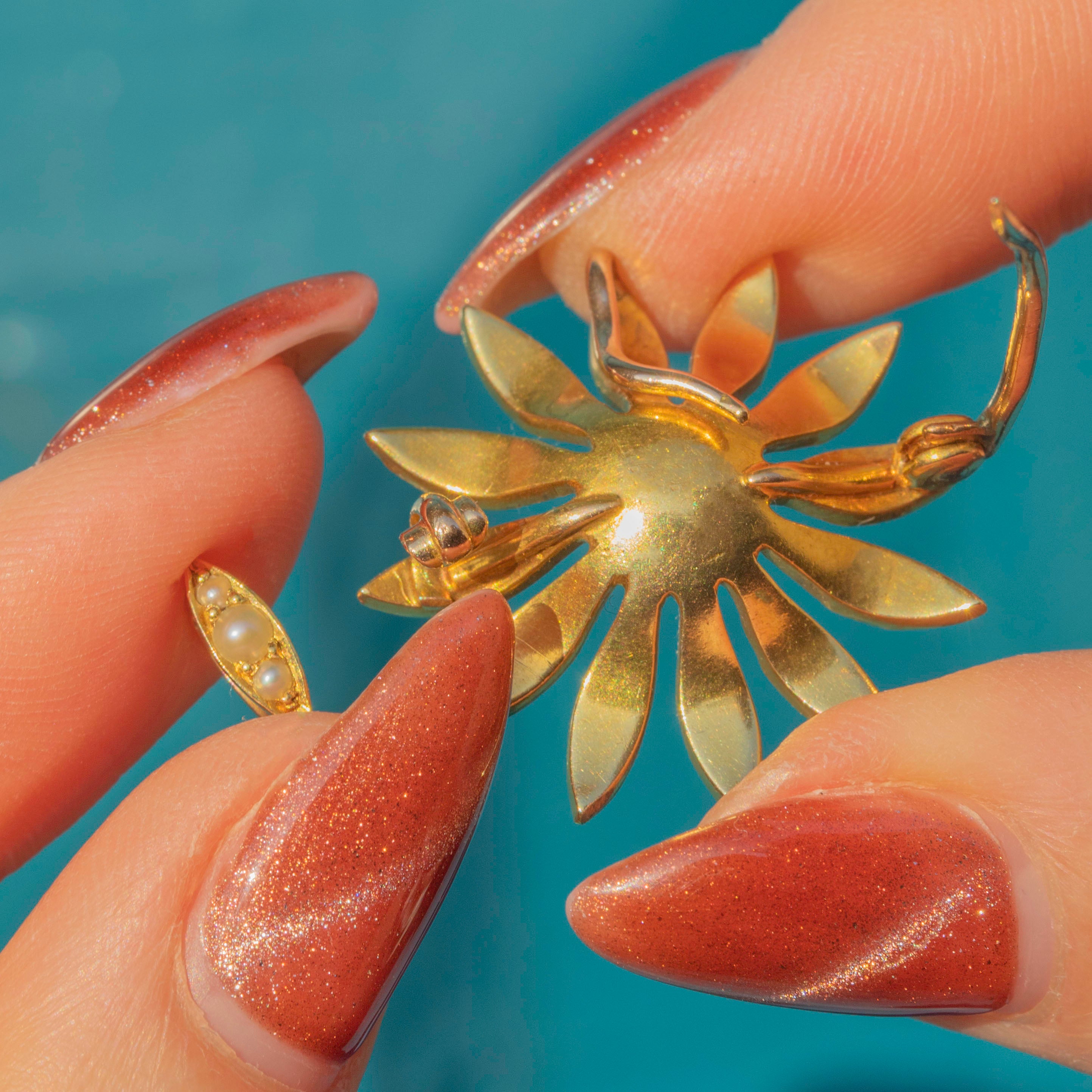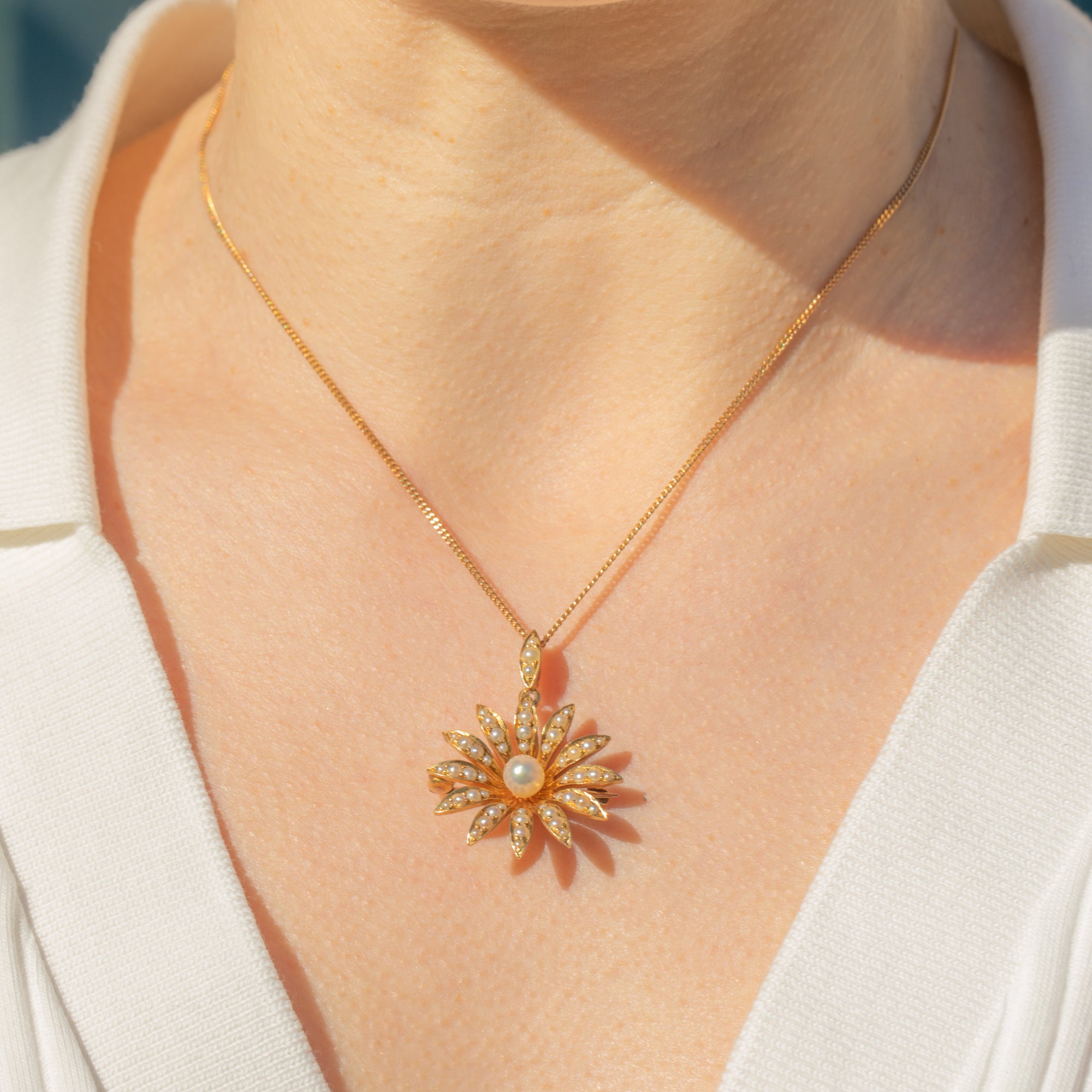 EXCELLENT. This antique 18ct Gold Pearl daisy flower pendant is in excellent condition. The lovely natural Pearl centre has a gorgeous ivory hue and pretty pink, lilac and gold overtones. Although the flower is 18ct Gold and the bale is 15ct, they do make for an incredible matching pair. The two purities of Gold in the pendant are unusual, but it appears original and well-matched. The pin is of lower purity, at 9ct Gold, which is quite typical of the era, and makes for a solid and robust pin. All the components are original and antique, with no damage.