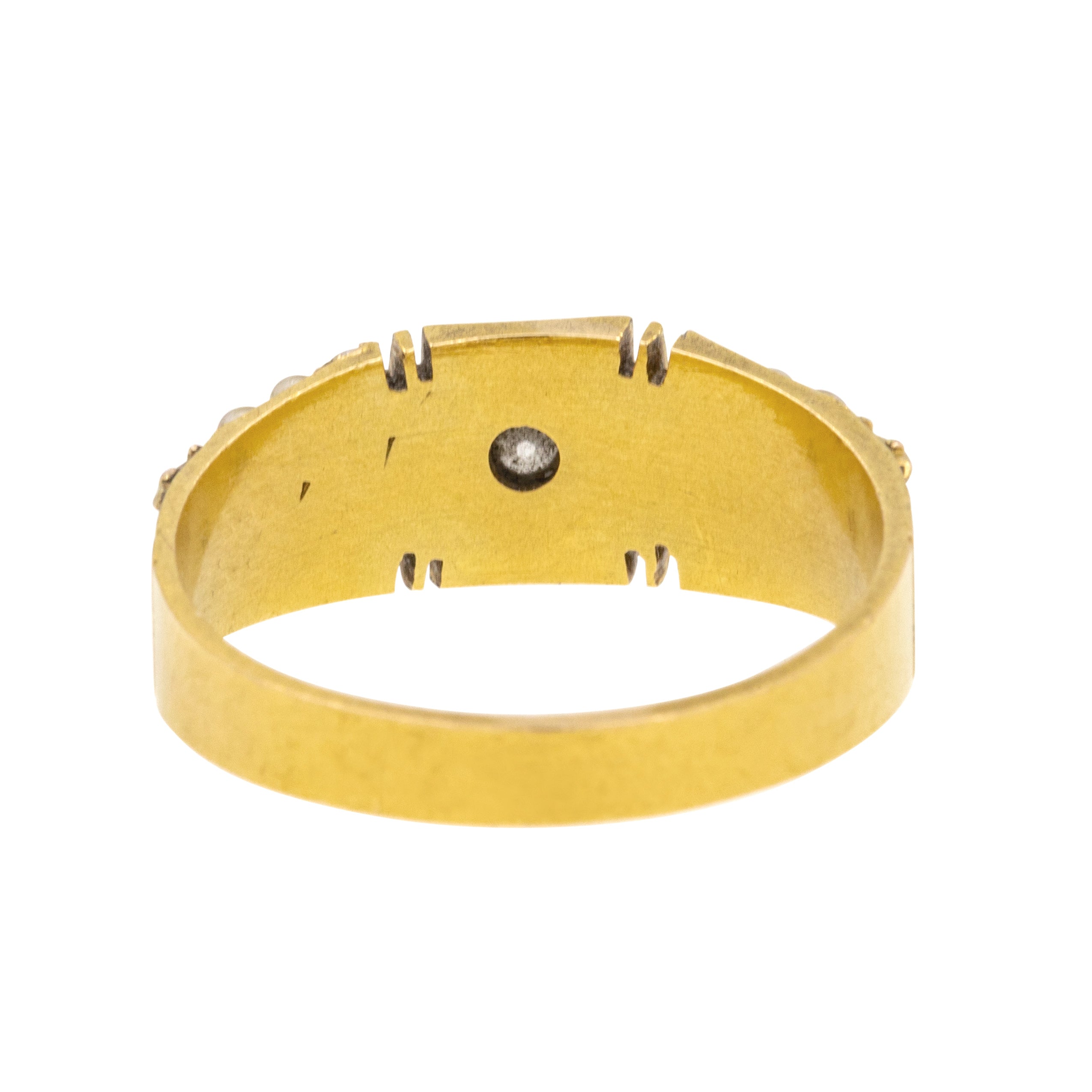 This antique 18ct Gold Pearl Diamond ring exemplifies the exquisite craftsmanship of the Victorian era! Crafted from saturated 18ct Gold, the uniquely formed and detailed band is inlaid with a 0.10ct Diamond flanked by rows of plump creamy Pearls.