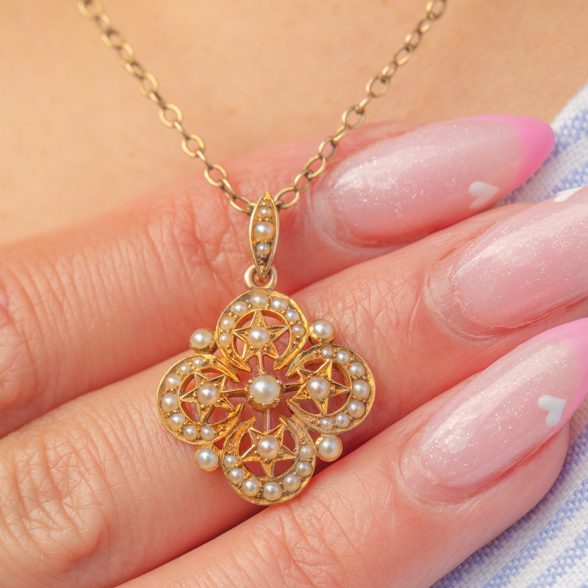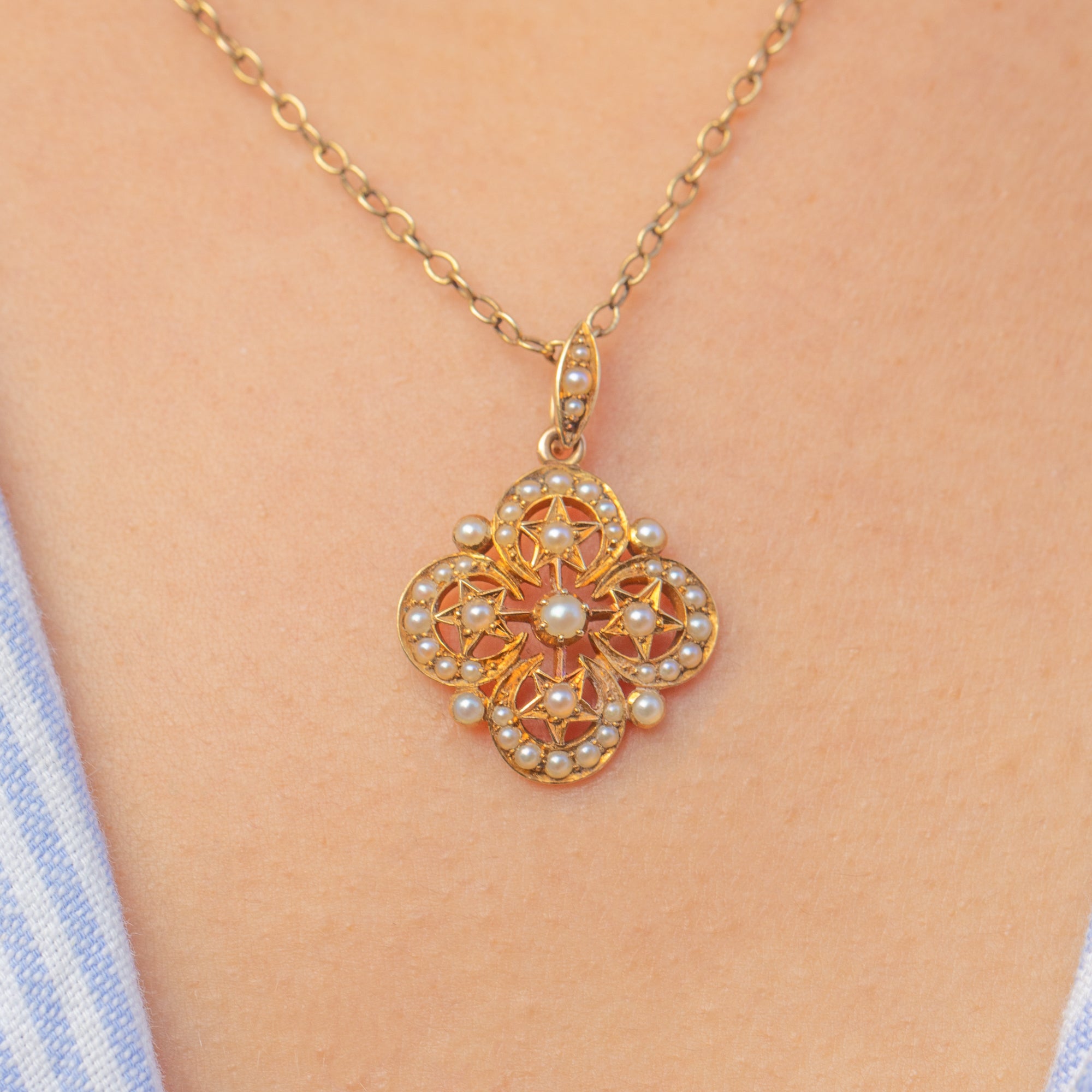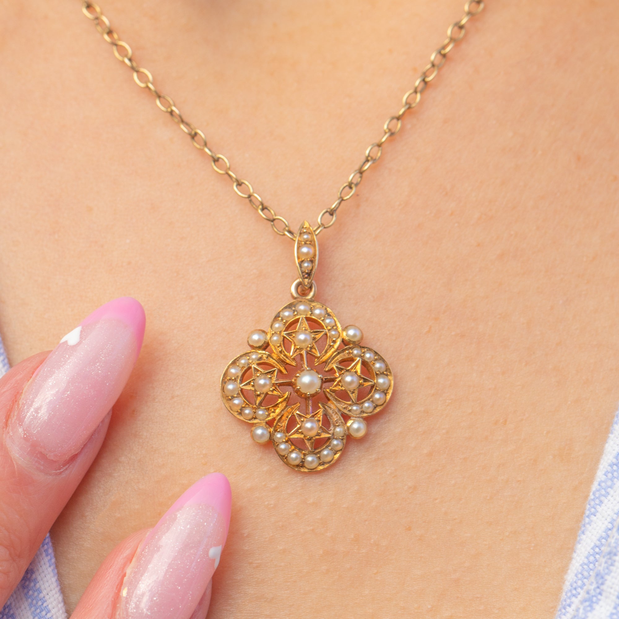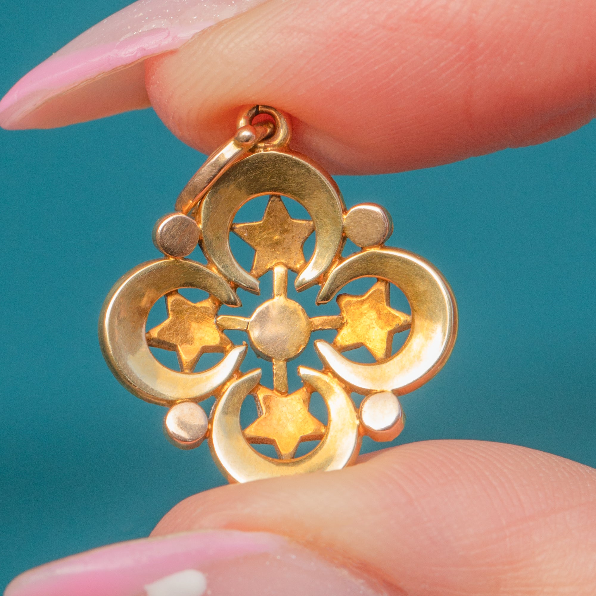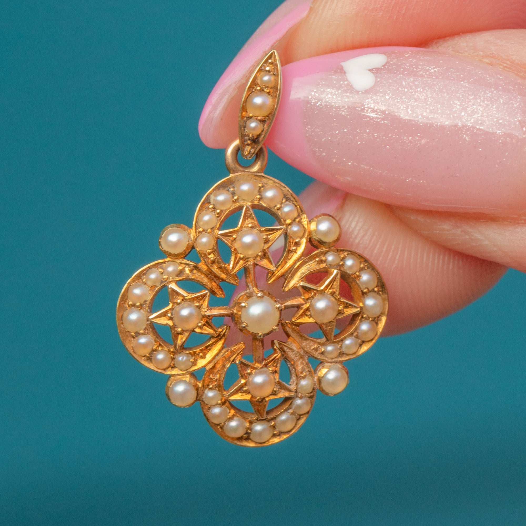 This charming Victorian crescent and star charm is crafted in glowing 18ct Gold and set with delicate natural Pearls. The celestial motif was a beloved symbol of romance and protection during the late 19th century, the crescent representing femininity and the star, divine guidance and hope.