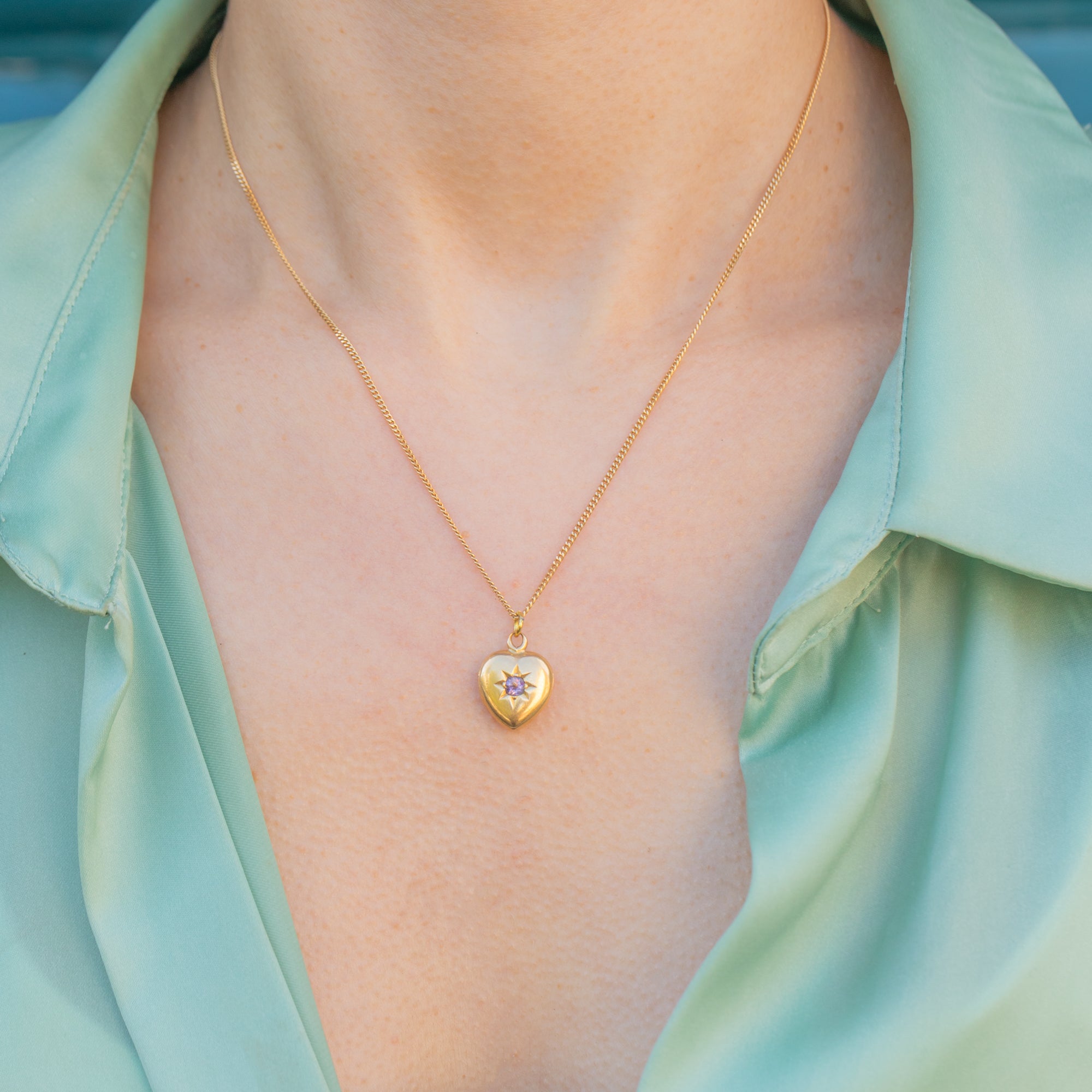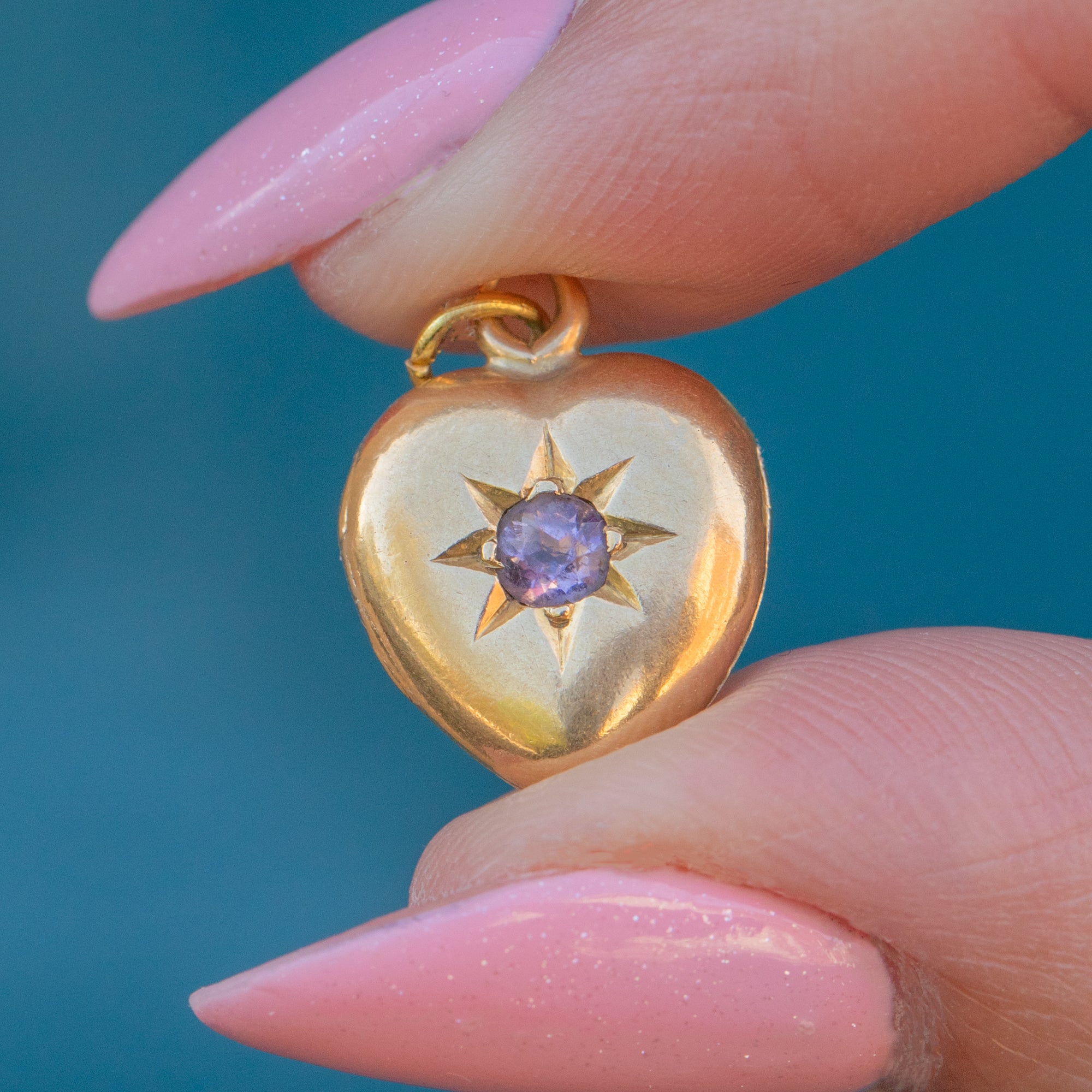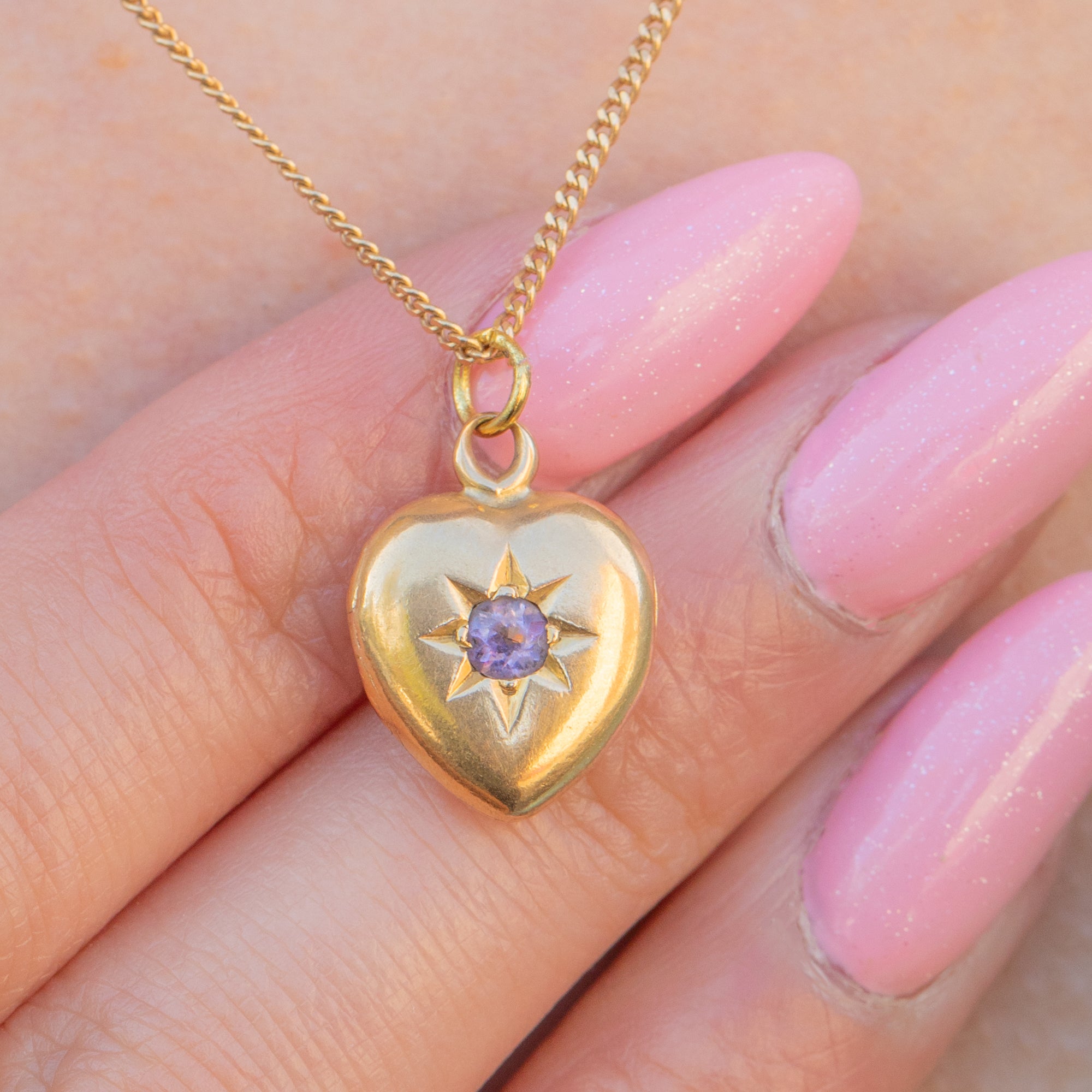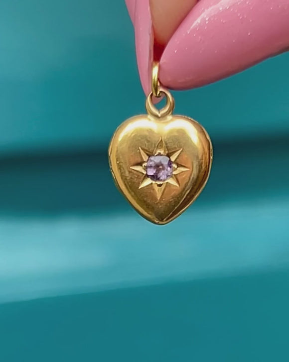 This exquisite antique 18ct Gold pink Amethyst heart locket is a lovely little treasure! Crafted from rich 18ct yellow Gold, this Victorian locket displays an Amethyst held within a bold star setting.