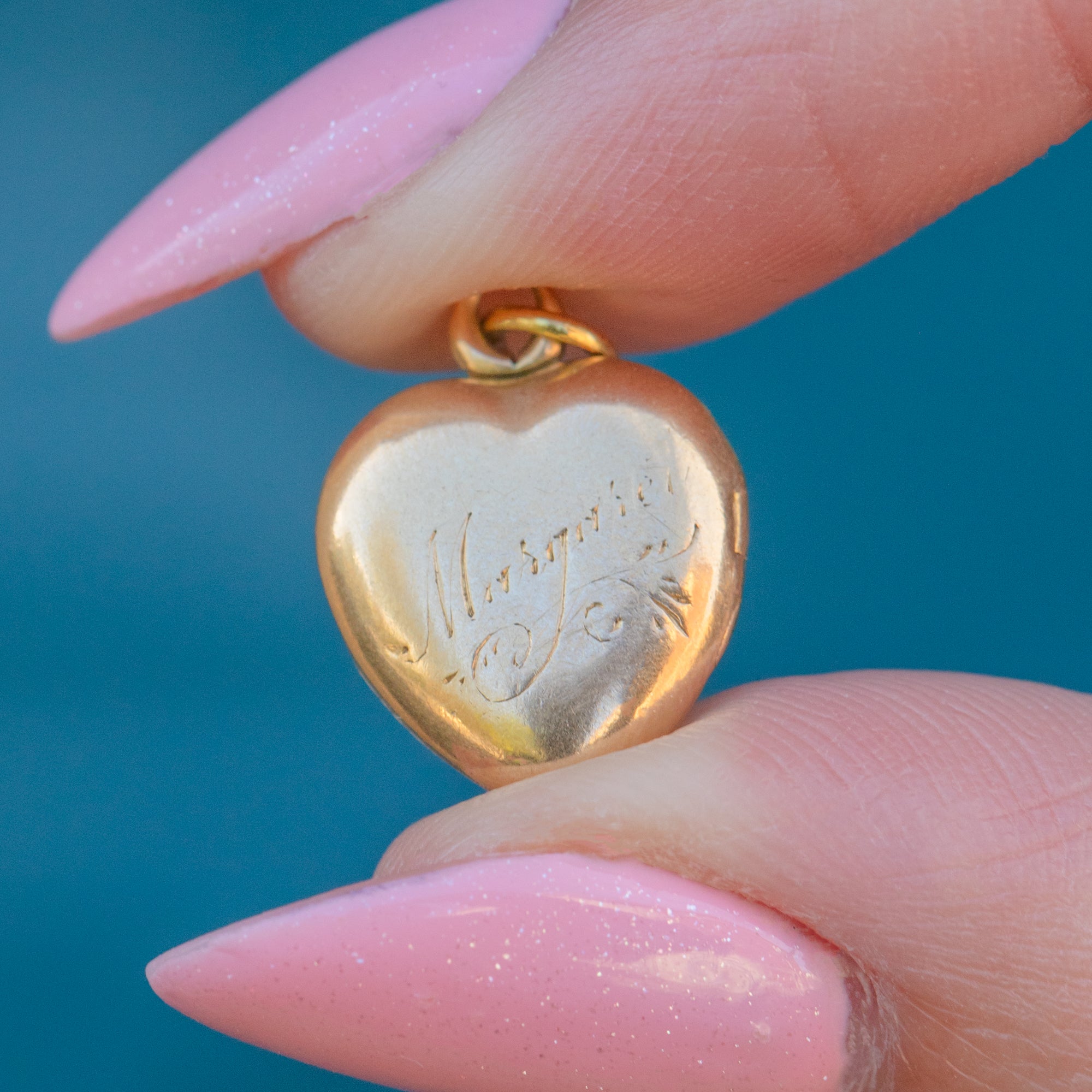 The lilac hue of the Amethyst offers a lovely contrast against the warm Gold. The back is engraved with the name "Margaret", adding a touch of intrigue. A romantic piece, this antique heart locket would make a lovely, heartfelt gift!