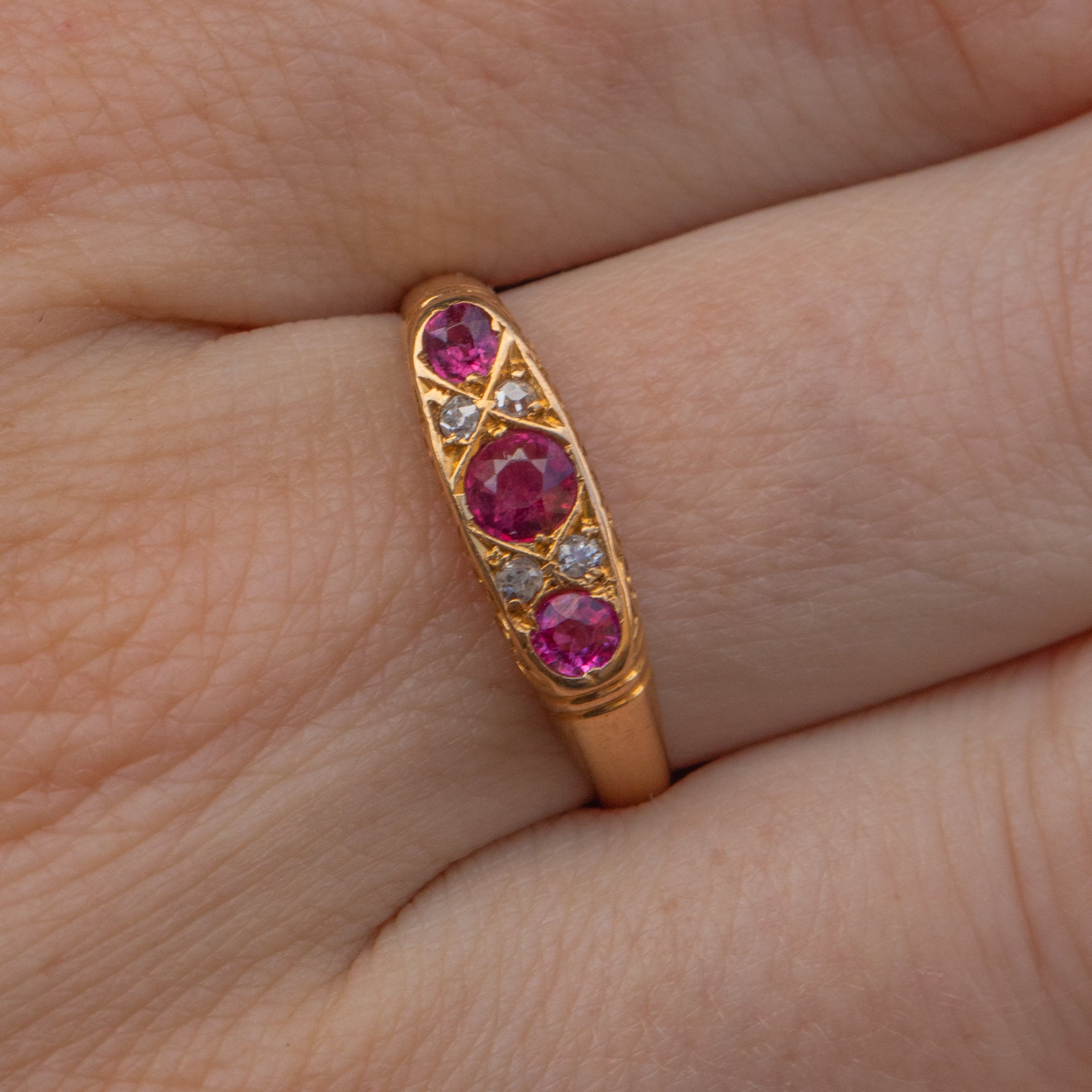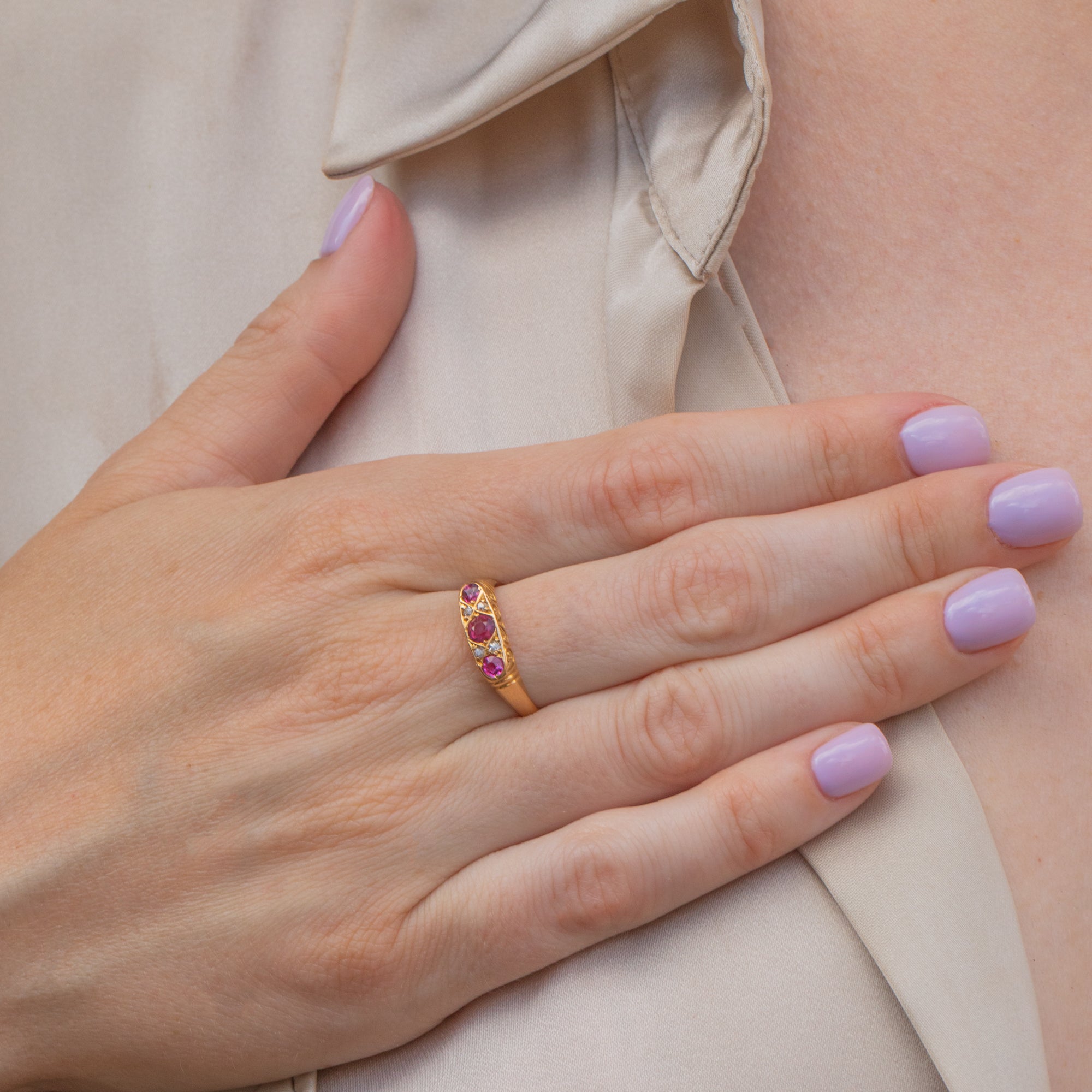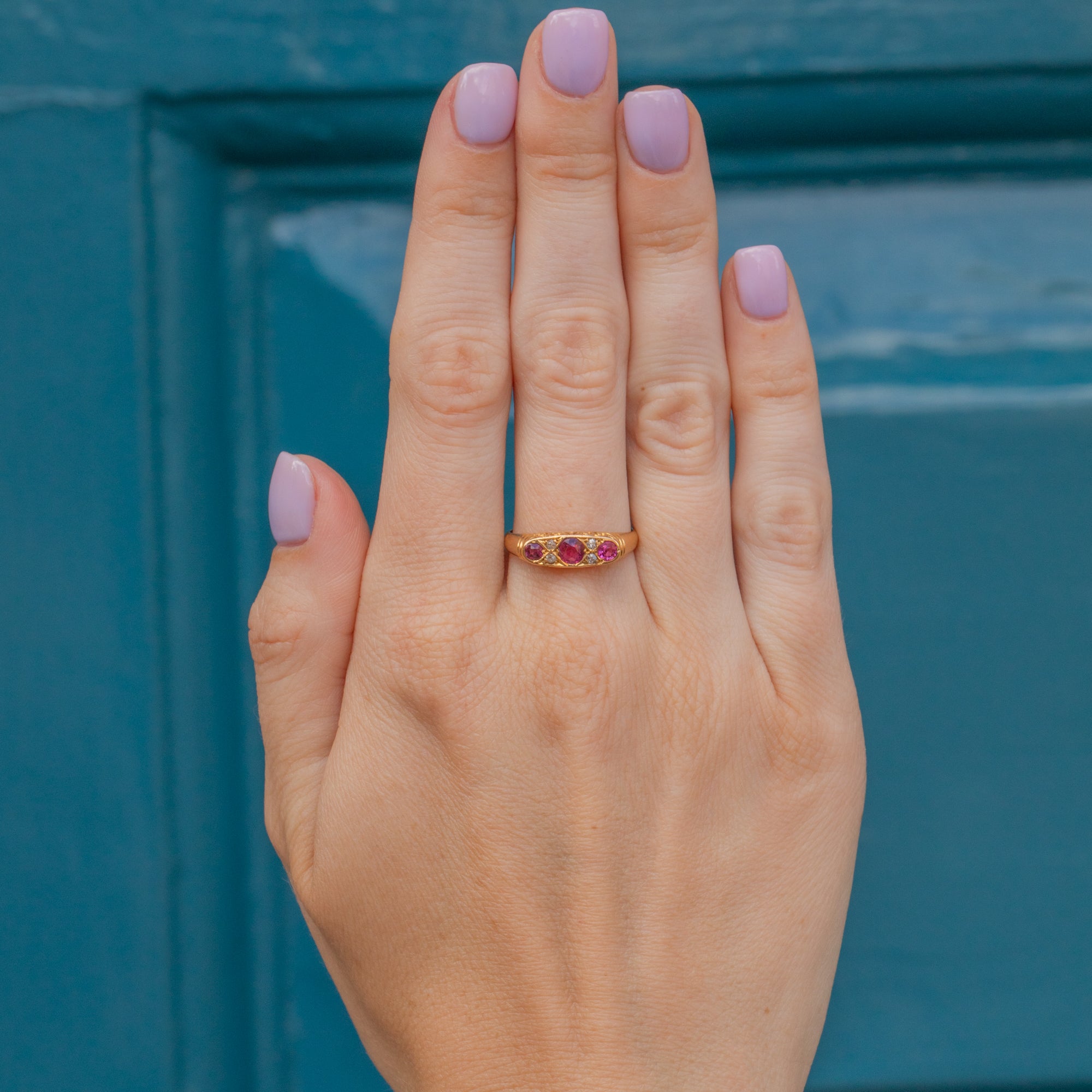 The trio of fuschia-infused Sapphires will instantly seduce you, accompanied by Diamond spacers all held proudly in a decorative scrolled gallery. The low profile of this Edwardian ring makes her ideal for stacking; she would make a pretty choice for a unique engagement ring!