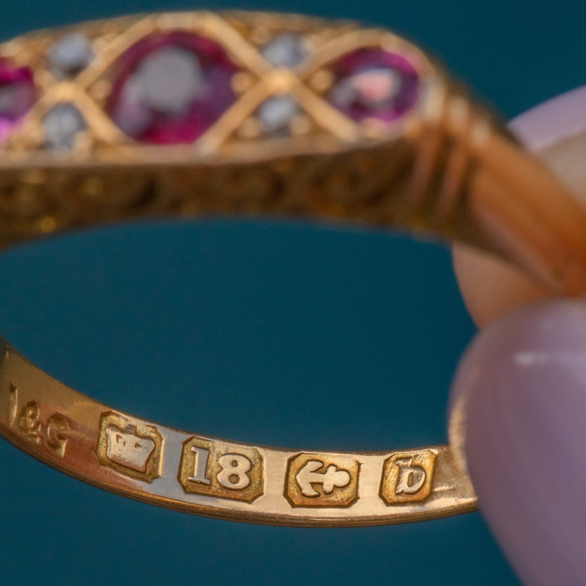 HALLMARKS: I&G Makers mark, Crown, 18, Birmingham Anchor, Date letter 'b' for the year 1901 inside band.