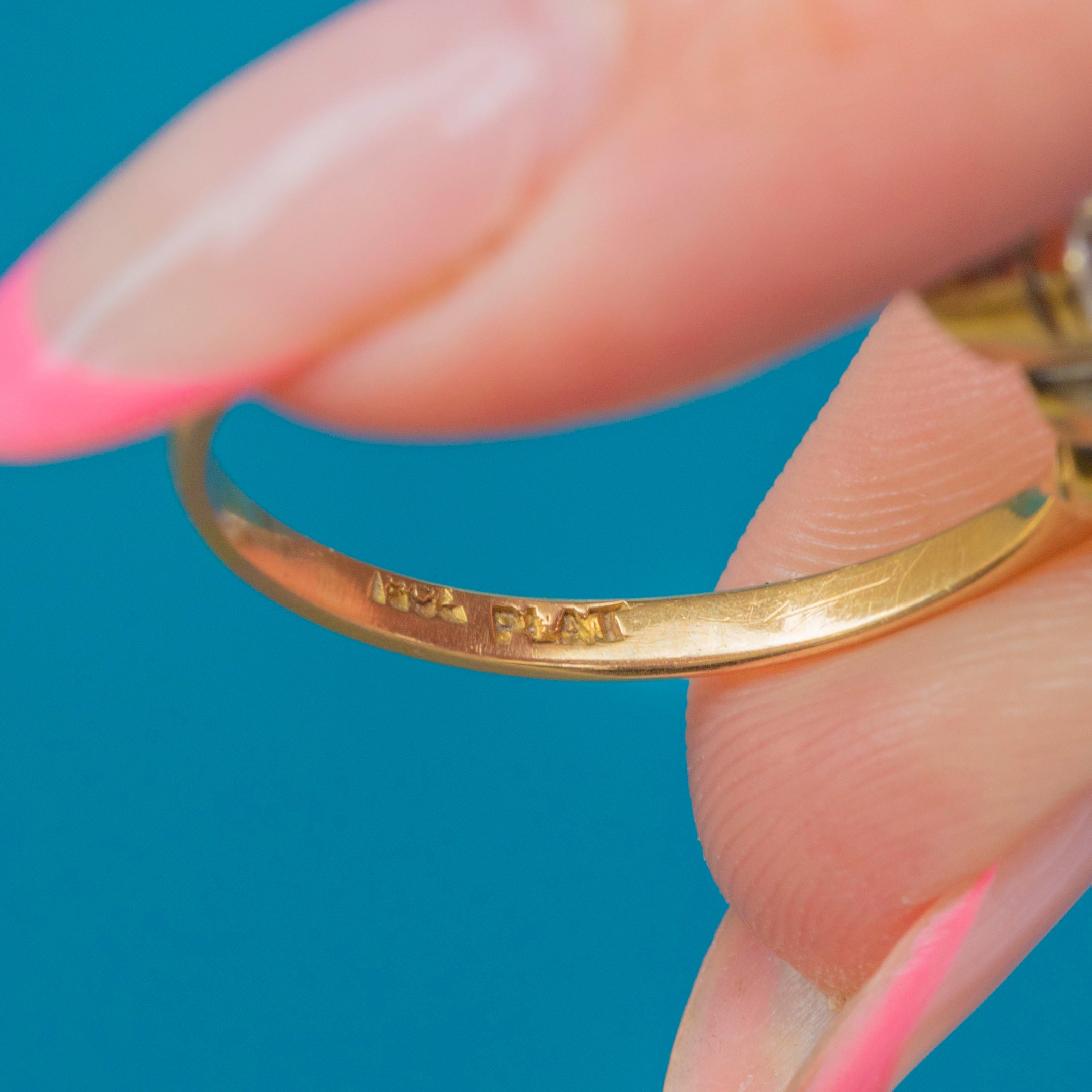 Weighing 0.54ct combined, this Art Deco ring flaunts three fabulous old-Mine cut Diamonds, each with a distinct scintillation. They are each set within lustrous Platinum bezels and rest on a buttery 18ct Gold band, making this antique Diamond ring ideal for everyday wear.