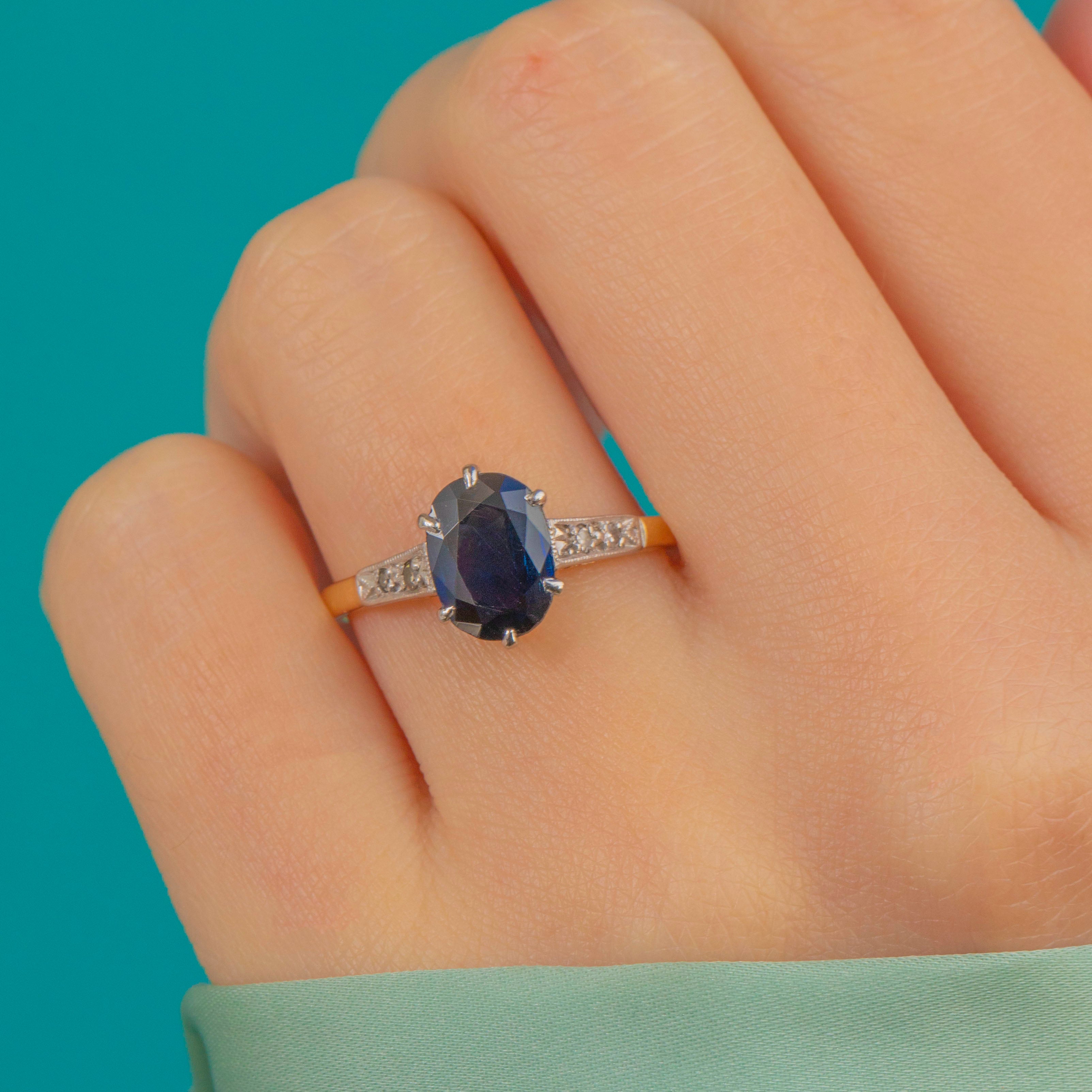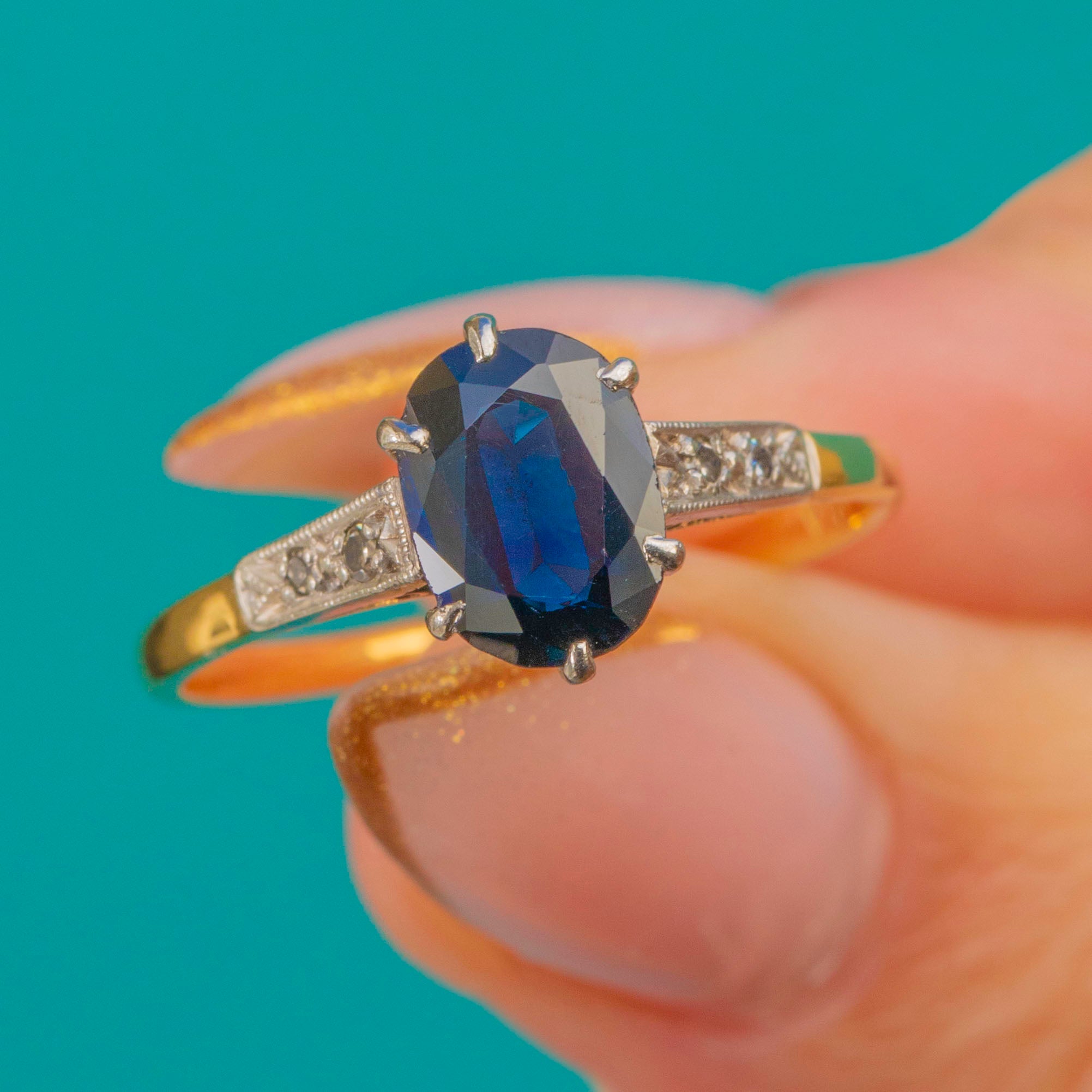 A magnificent 1.50ct Natural Sapphire sits at the heart of this exceptional Art Deco ring, unheated and full of rich, velvety colour. Its striking oval profile is beautifully showcased in a Platinum-topped setting, with sparkling Diamond shoulders adding the perfect touch of old-world glamour.