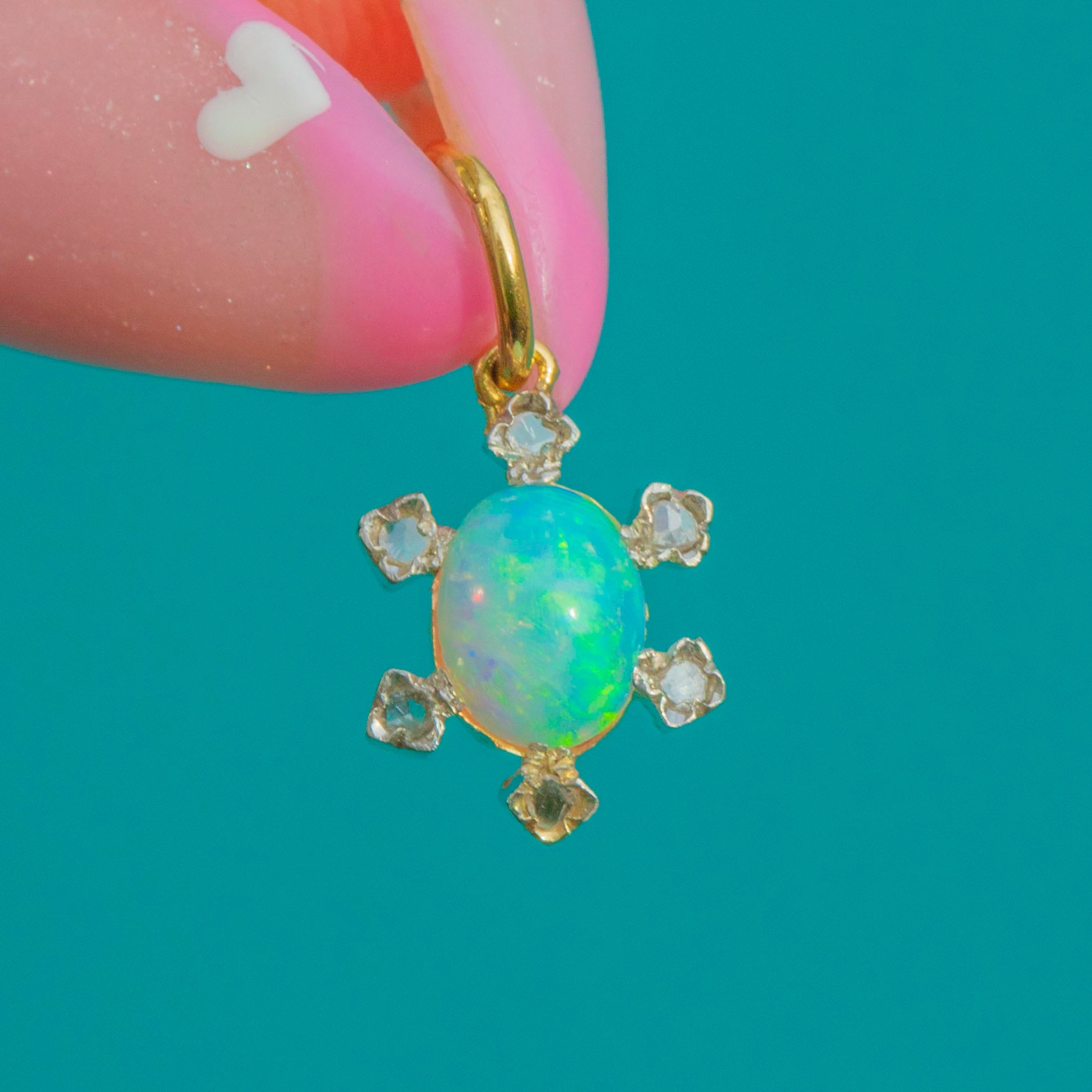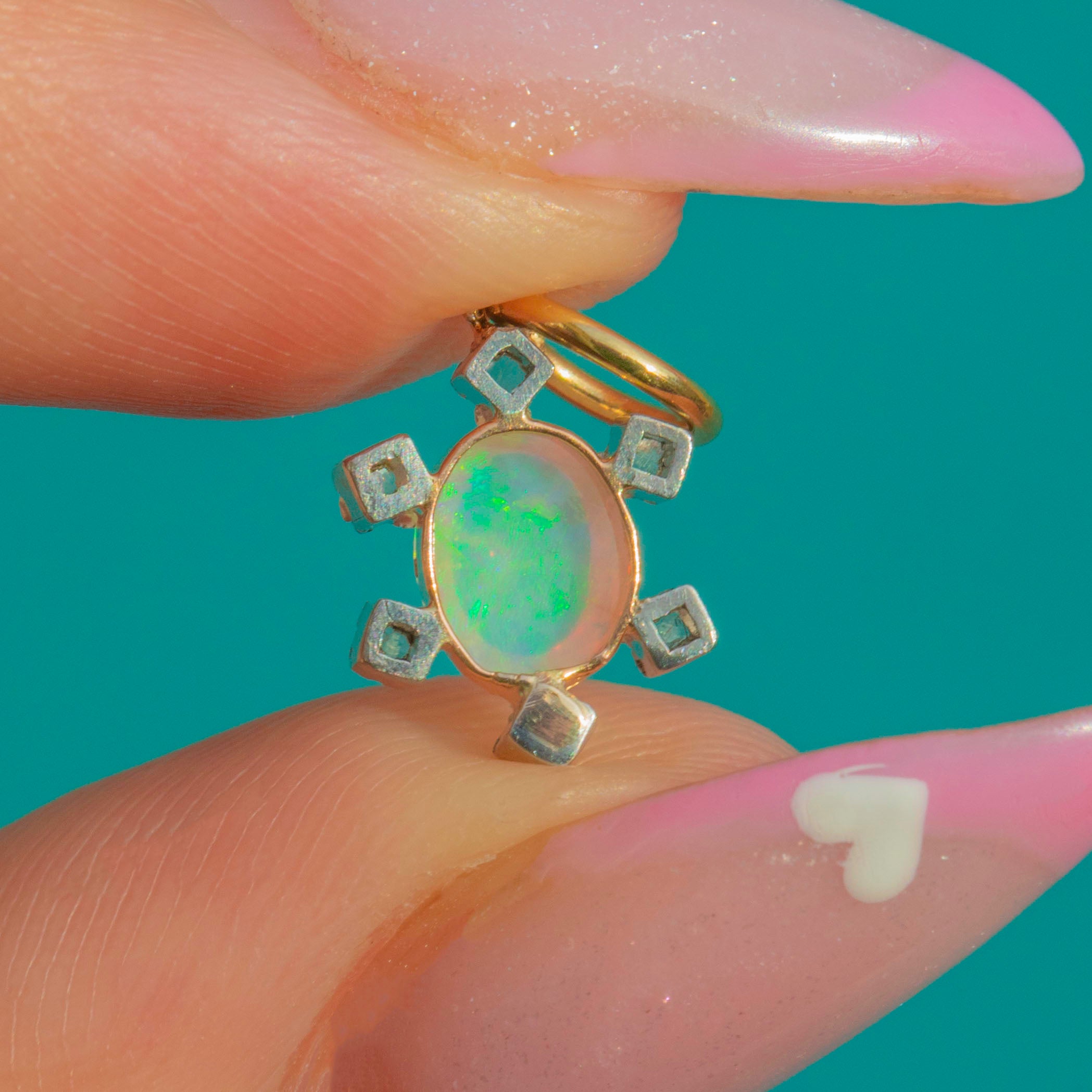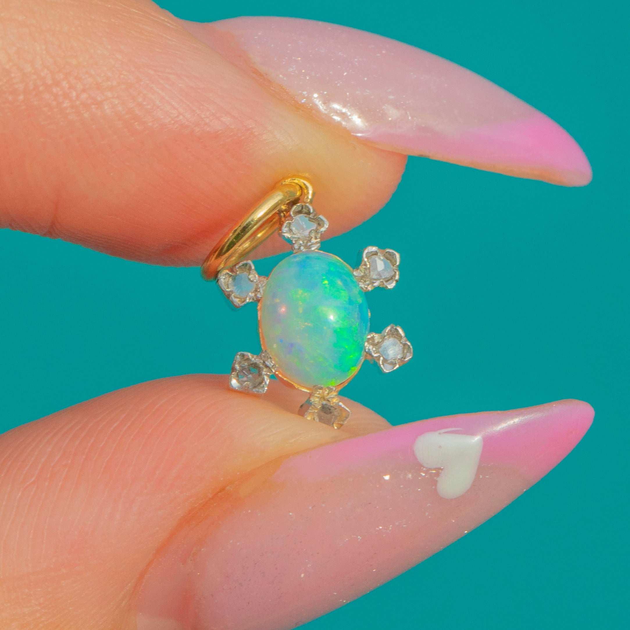 This charming early 20th-century Opal and Diamond charm is a miniature treasure, crafted in 18ct Gold with Platinum Diamond settings.