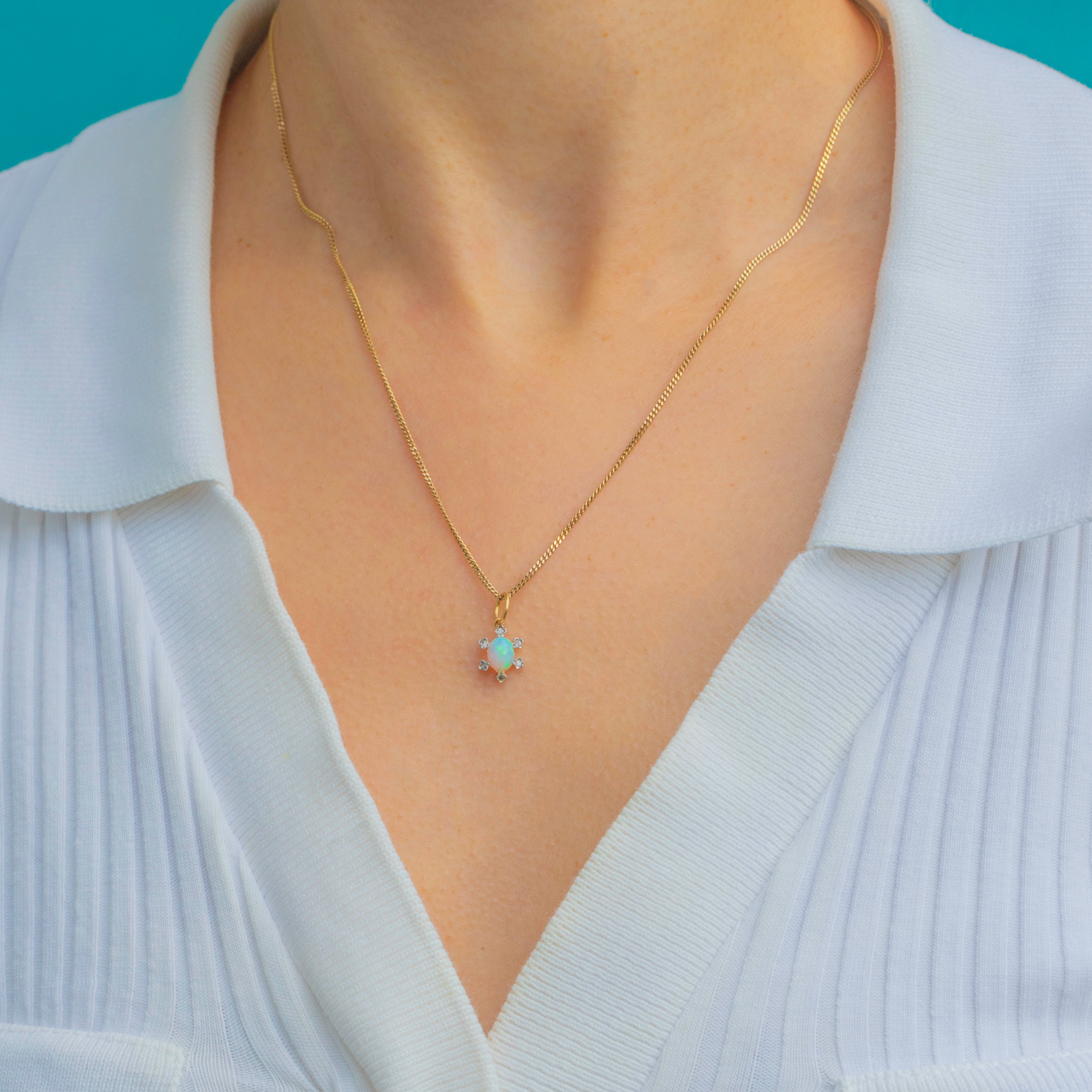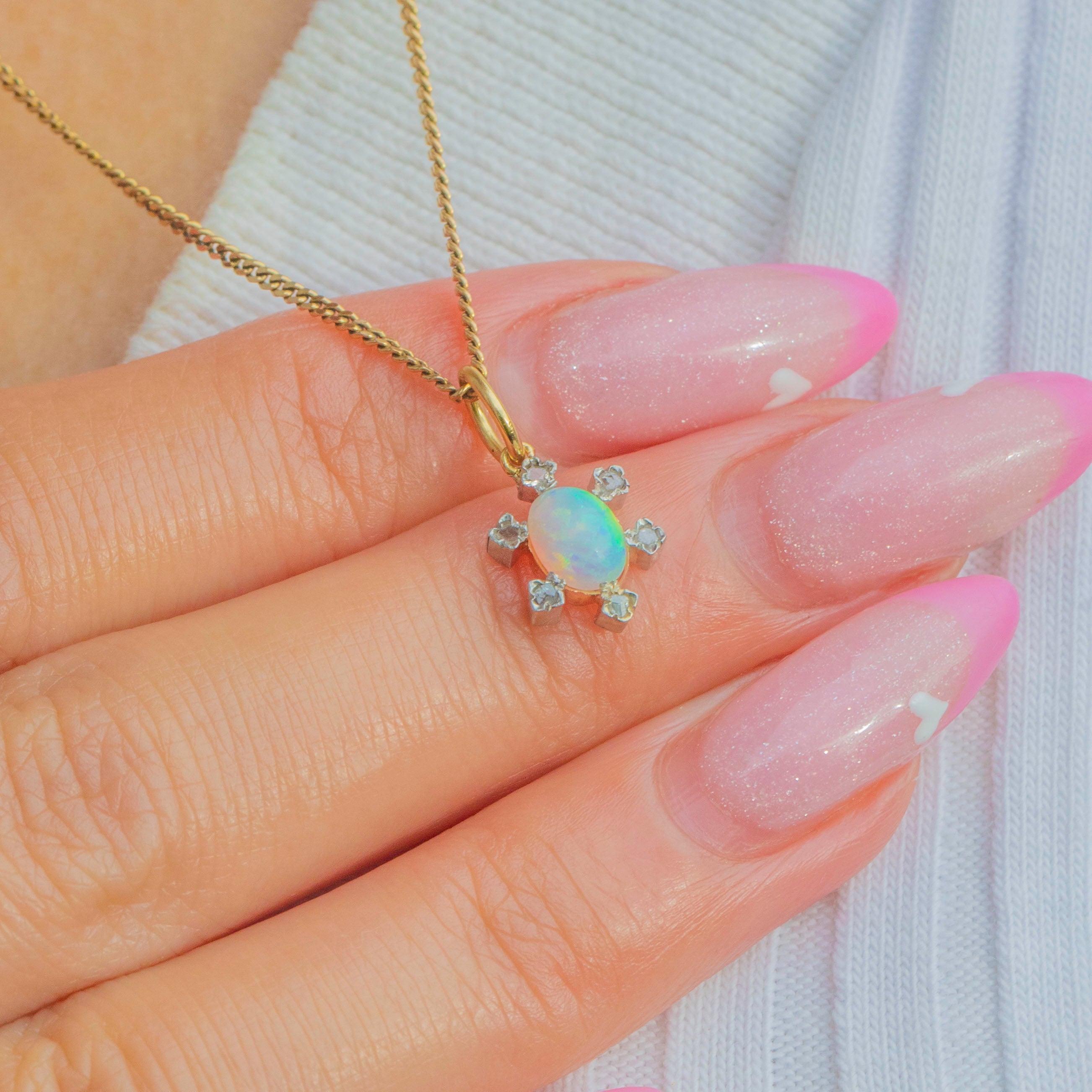 EXCELLENT: This pendant is in beautiful antique condition. The Opal displays strong play-of-colour, and the Diamonds are bright and securely set. Minimal age-related wear visible only under magnification.