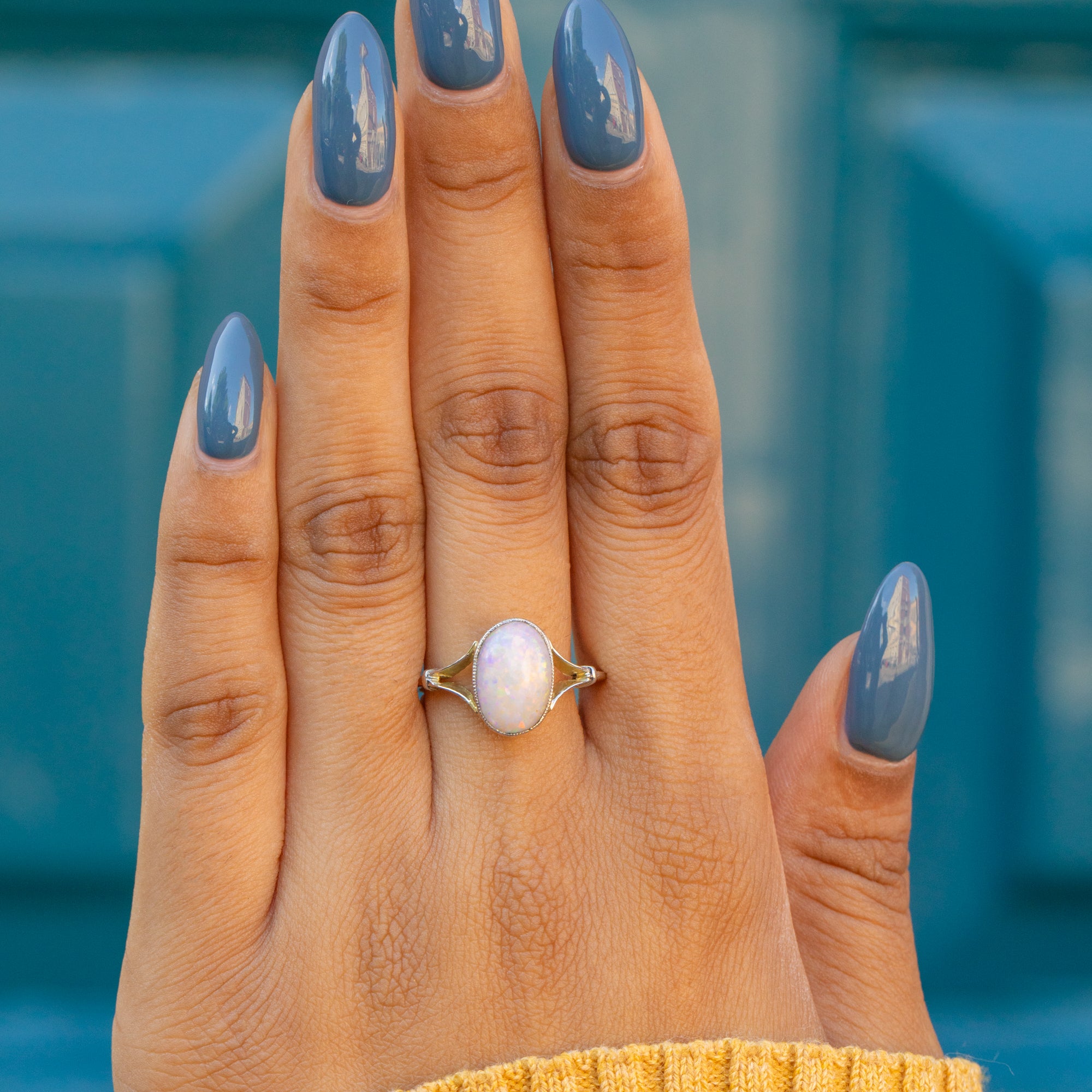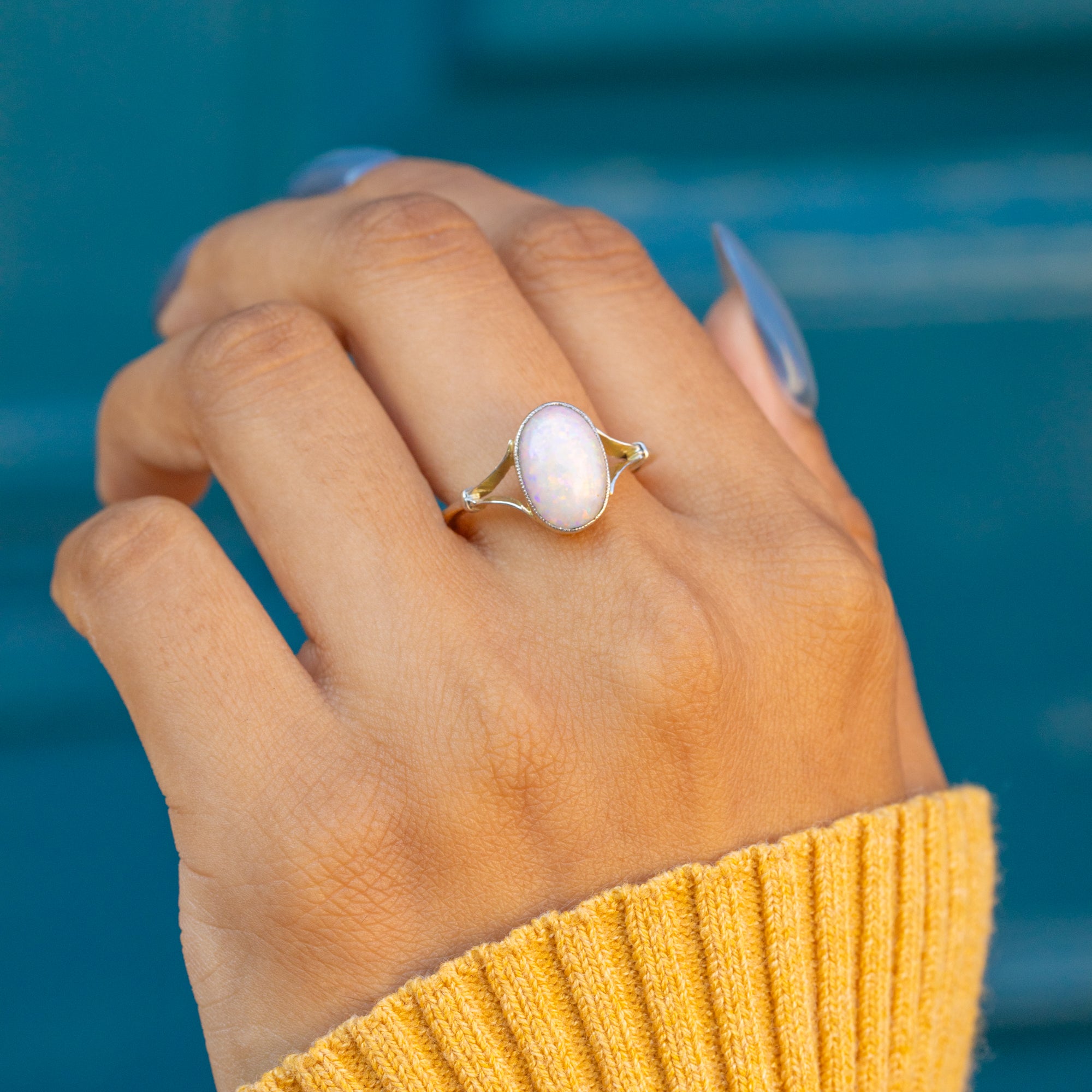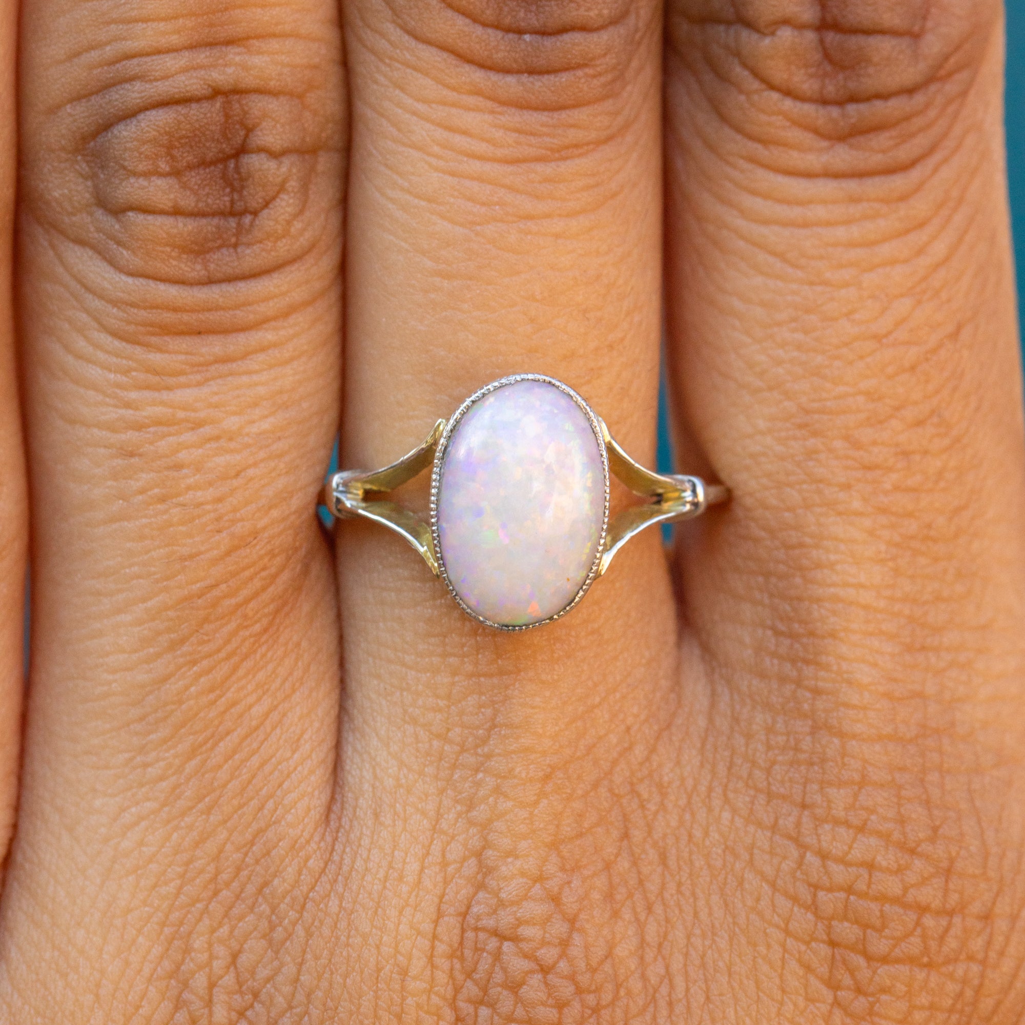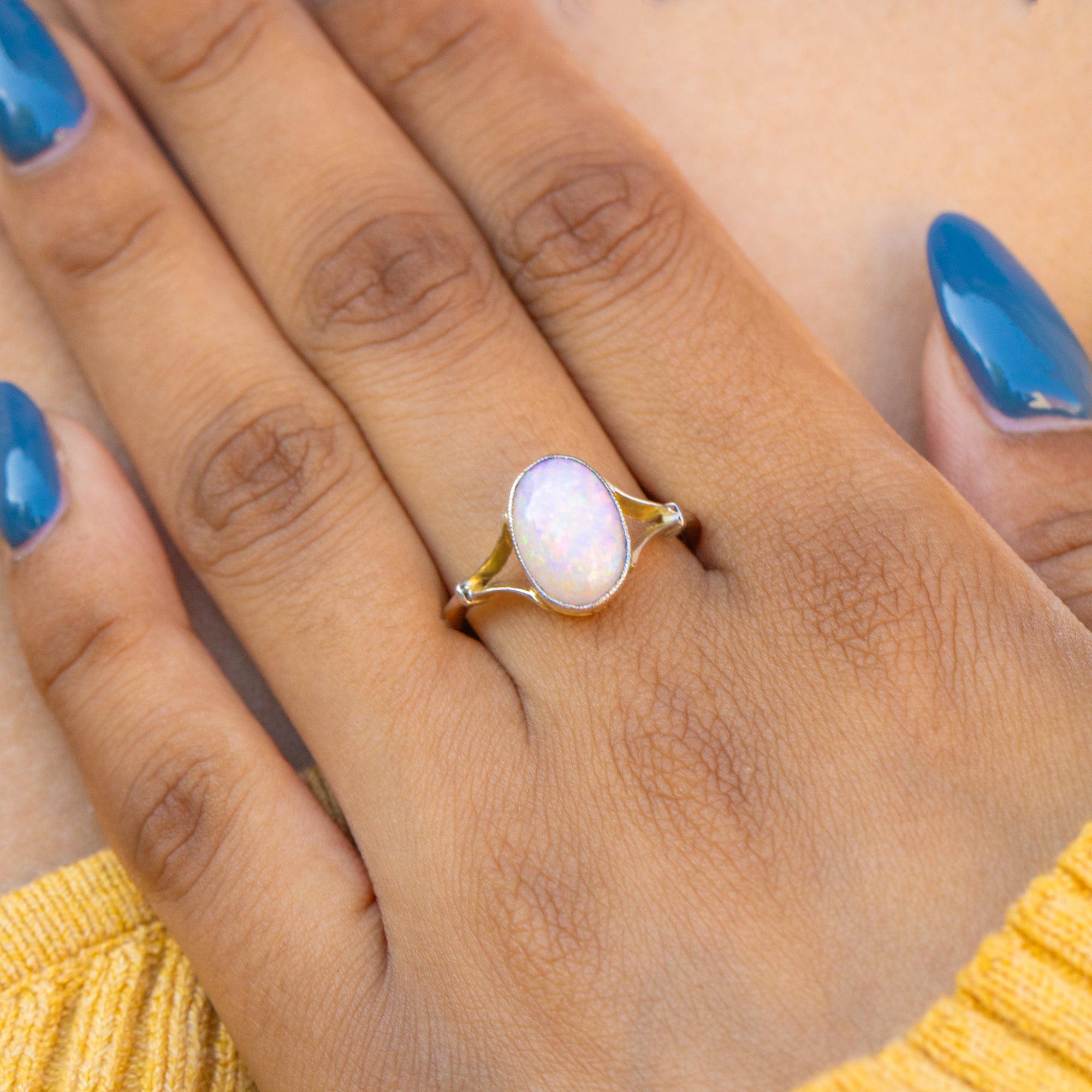 EXCELLENT. We are pleased to present this antique 18ct Gold & Platinum Opal ring in excellent condition! The Opal is smooth to the touch and securely held within its Platinum millgrain settings, free from chips or abrasions. Starting life as a brooch, this piece has been sympathetically converted into a highly wearable ring! The 18ct Gold band is robust and wears comfortably, promising you many years of enjoyment!