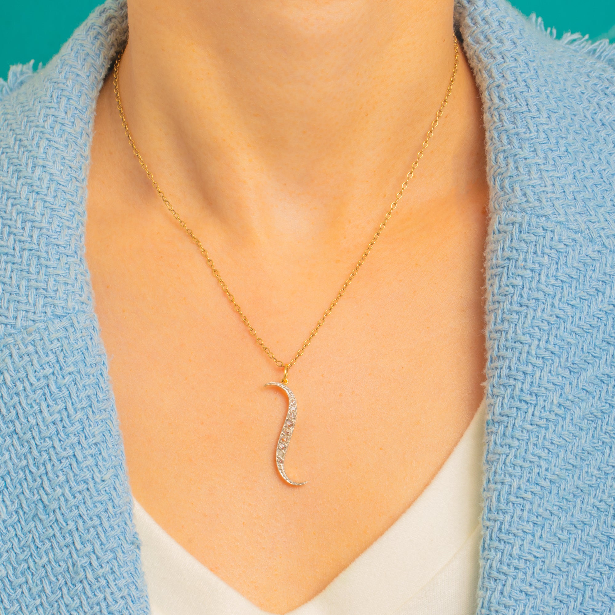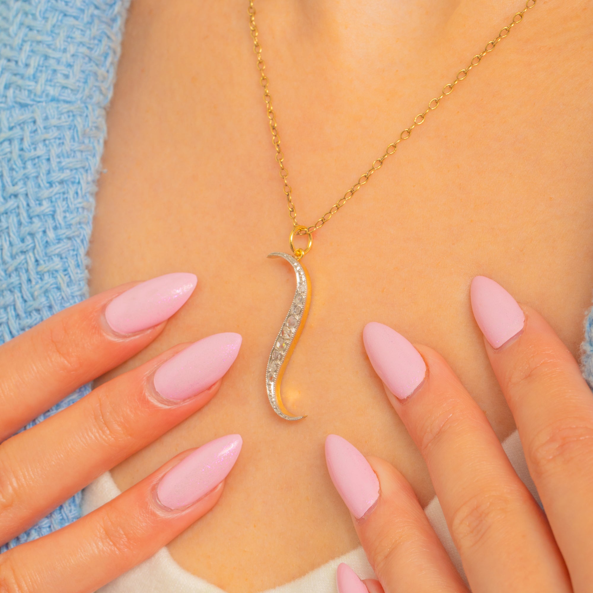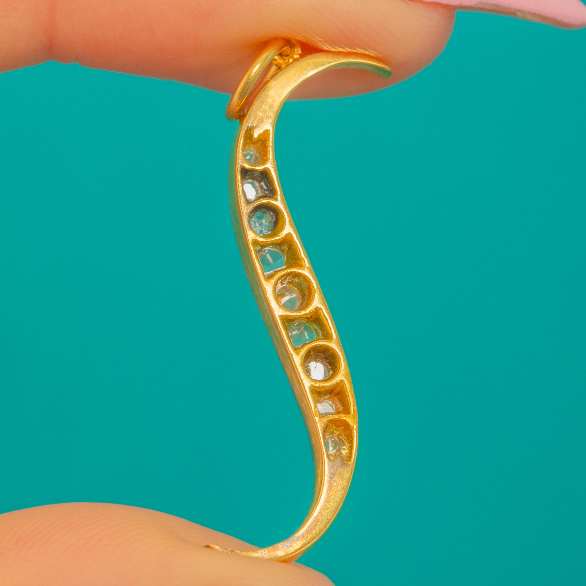 A slender swirl pendant in two sumptuous tones, this Victorian treasure marries rich 18ct Gold with a cool Platinum face dusted in nine glinting rose-cut Diamonds. The Diamonds are gracefully graduated along the arc, their antique faceting catching the light with a soft, romantic sparkle.