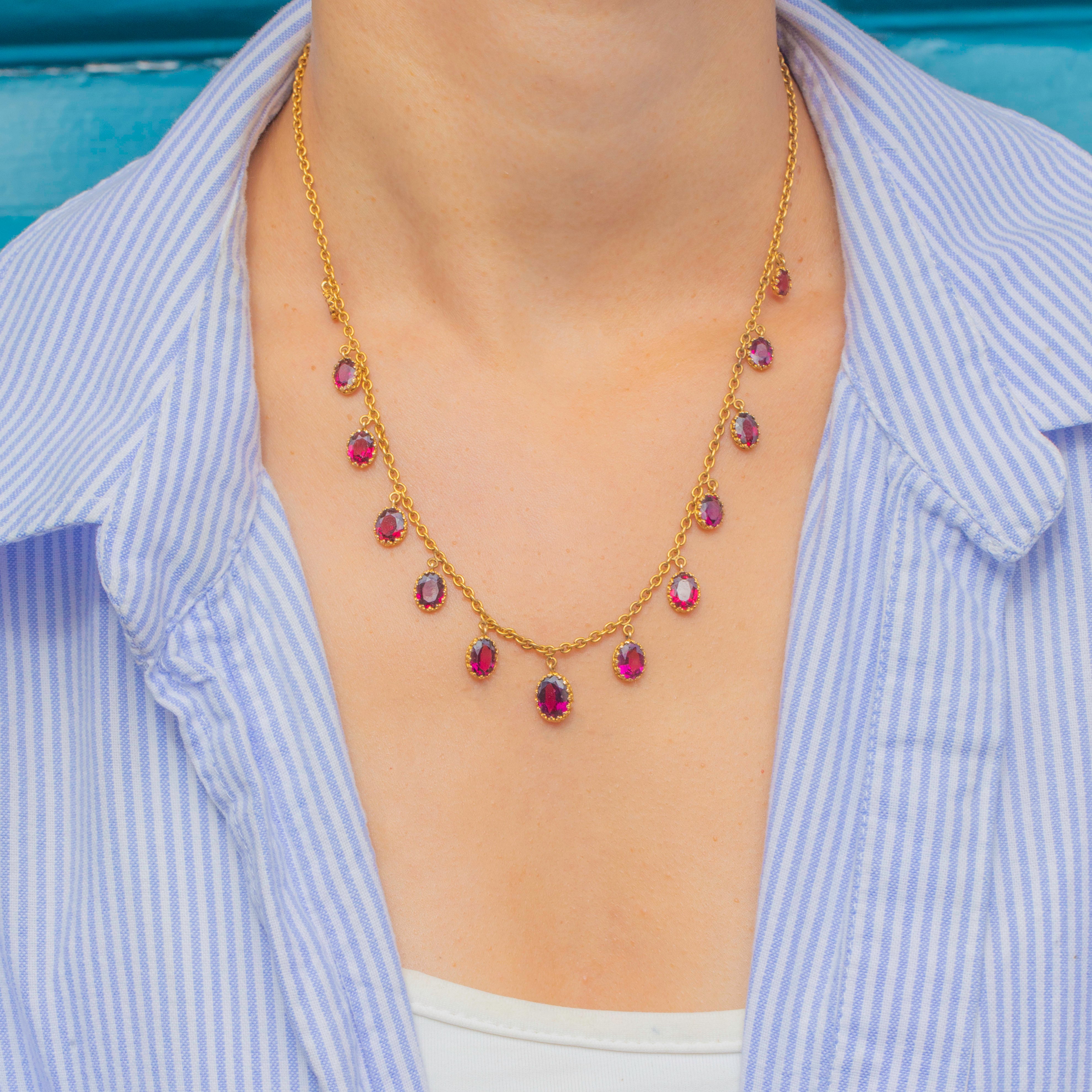 Each Garnet is beautifully faceted, displaying a deep raspberry hue characteristic of this prized gemstone- adding up to 4.50ct in total. Suspended from an elegant 17" long chain, the Garnets form a fringe design that moves gracefully when worn, catching the light with every turn.