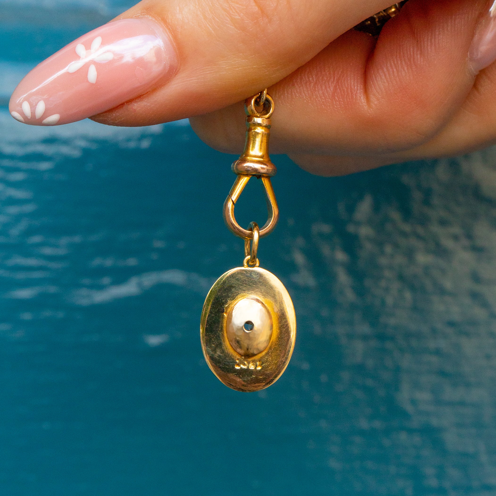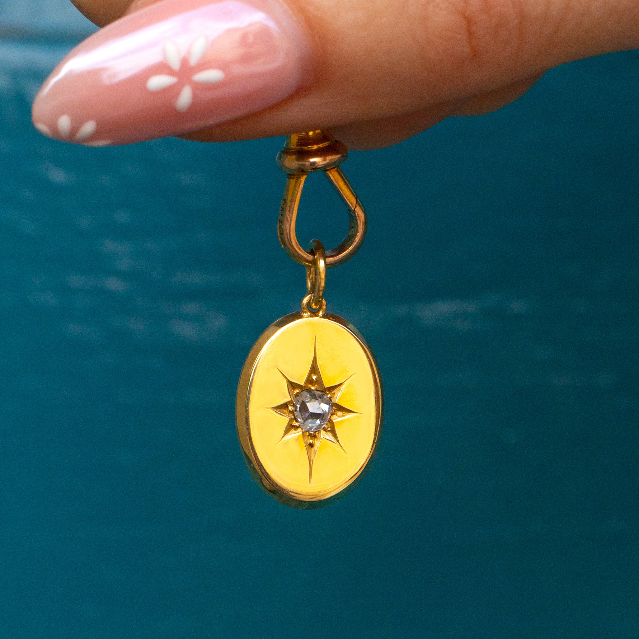 EXCELLENT. This antique 18ct Gold rose-cut Diamond Star-set oval charm is in excellent condition! The rose-cut Diamond is secure within its setting, with her facets crisp and refracting light beautifully. The 18ct Gold is smooth to the touch, with no damage to the front to note. To the back there is a small area of darkening from a stick pin conversion, but nothing that affects her overall rating. We will be sad to see this Victorian treasure go, but equally happy for its new owner!
