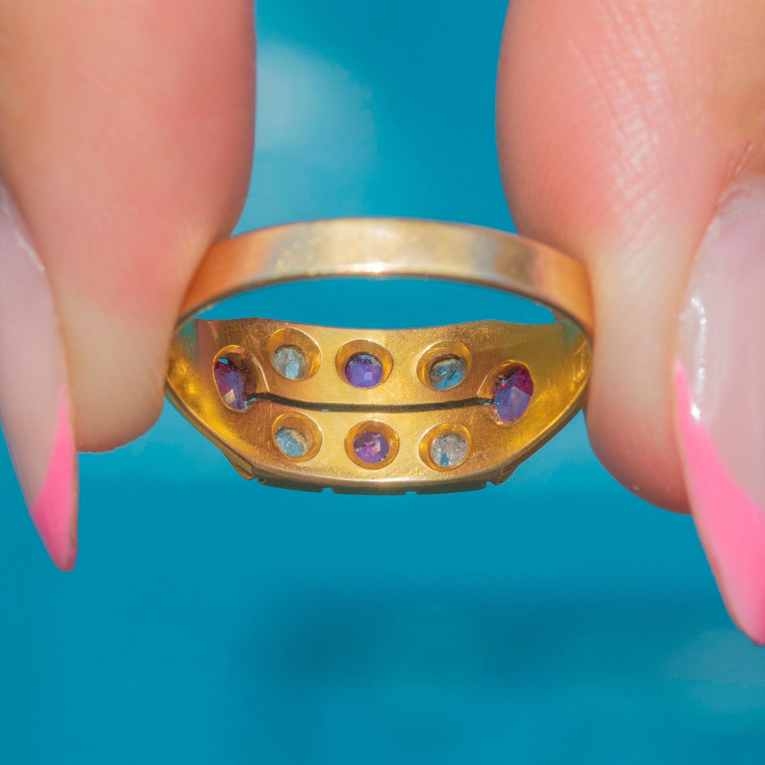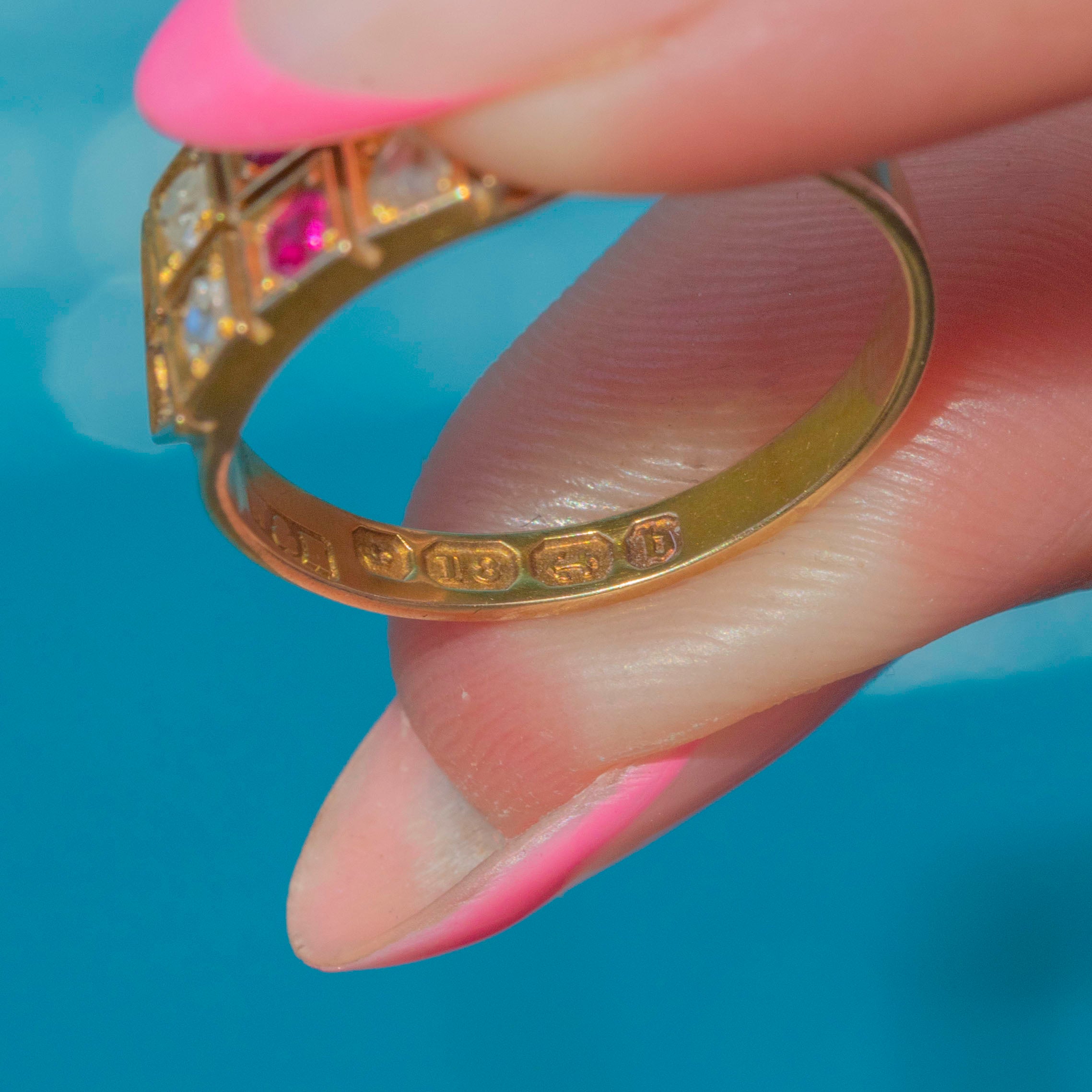 EXCELLENT: This antique 18ct Gold Ruby Diamond chequerboard ring is in excellent condition. The Gold has a bright saturation with a magnificent satin finish, and only mild age related wear visible under close inspection. The gemstones are crisply faceted and securely set, with no chips or abrasions. The chunky antique hallmarks are fully legible, allowing us to accurately date this Victorian treasure to 1876!