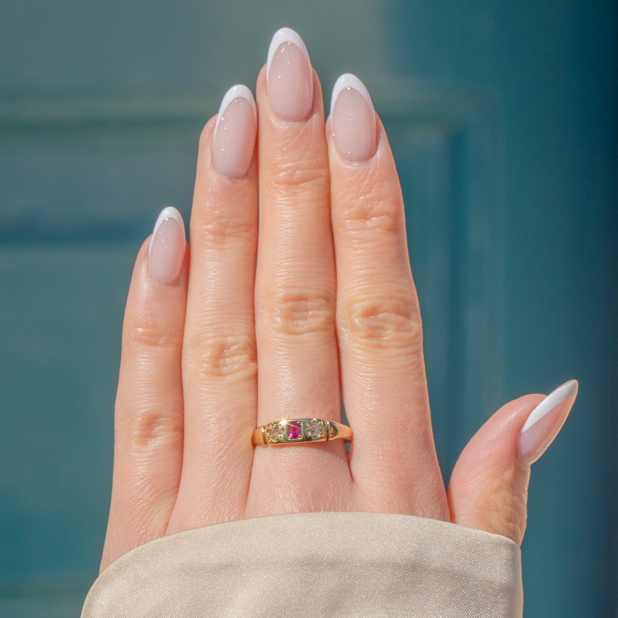 This antique 18ct Gold Ruby Diamond gypsy ring will bring a touch of celestial charm to your curated ring stack! The slender ring band is crafted from brightly saturated 18ct Gold with a high-shine polish giving it a luxurious finish.