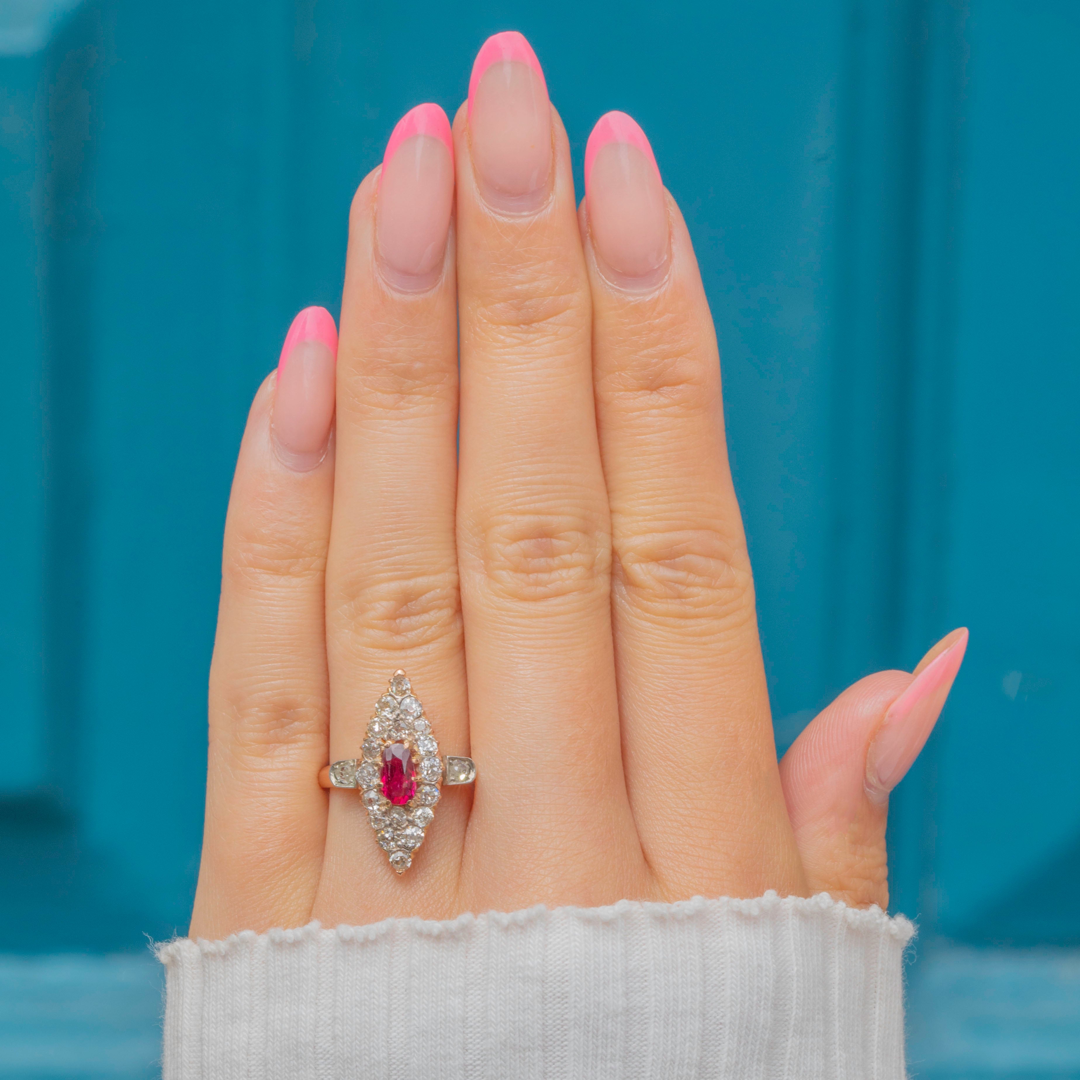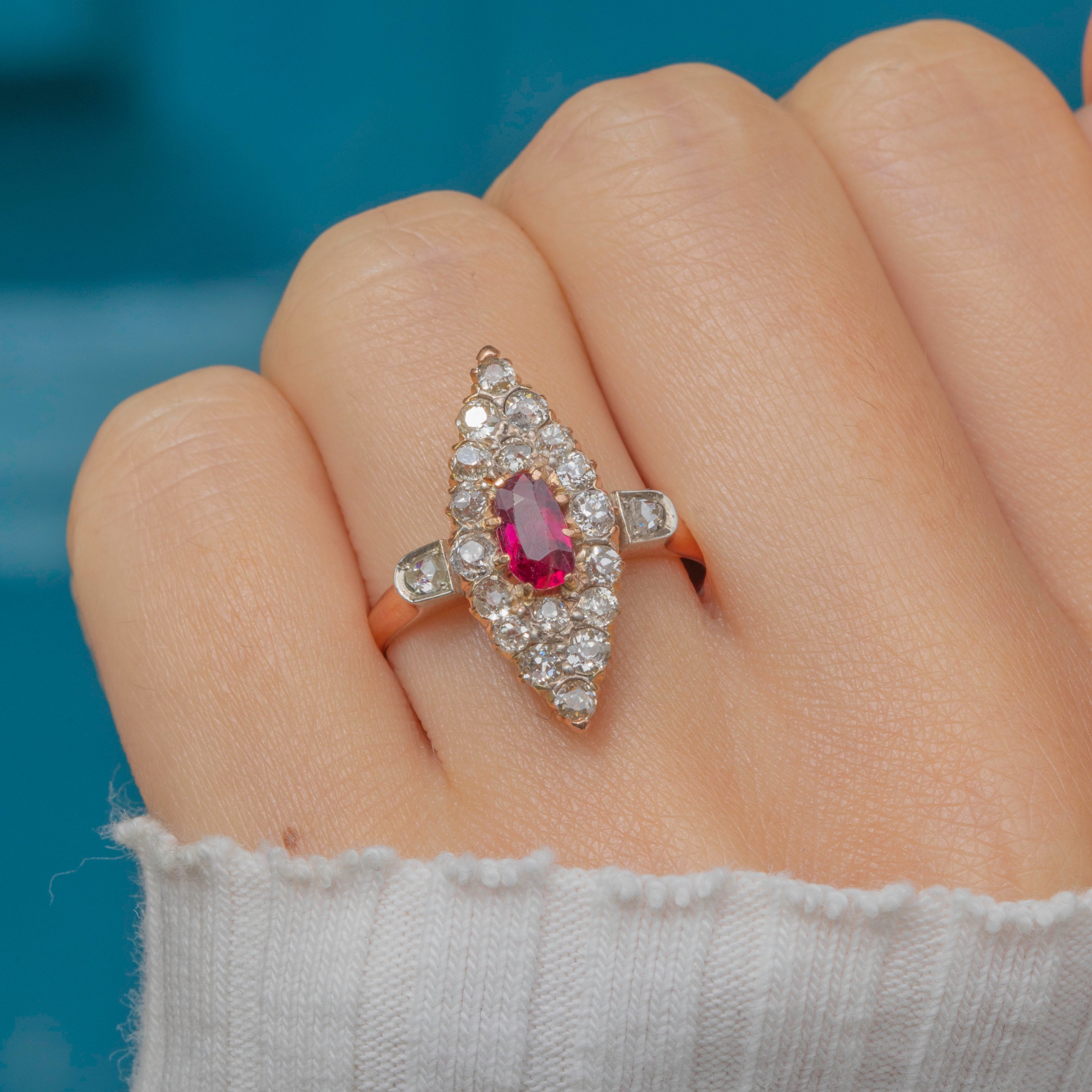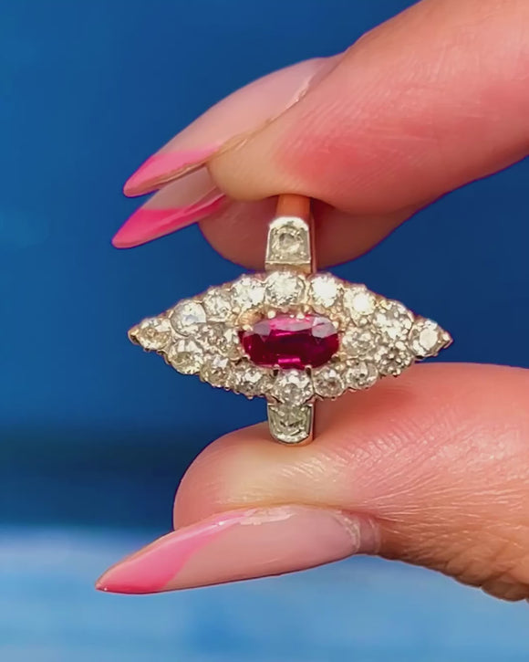 We are pleased to present this exquisite antique 18ct Gold Ruby and 0.60ct Diamond navette cluster ring!