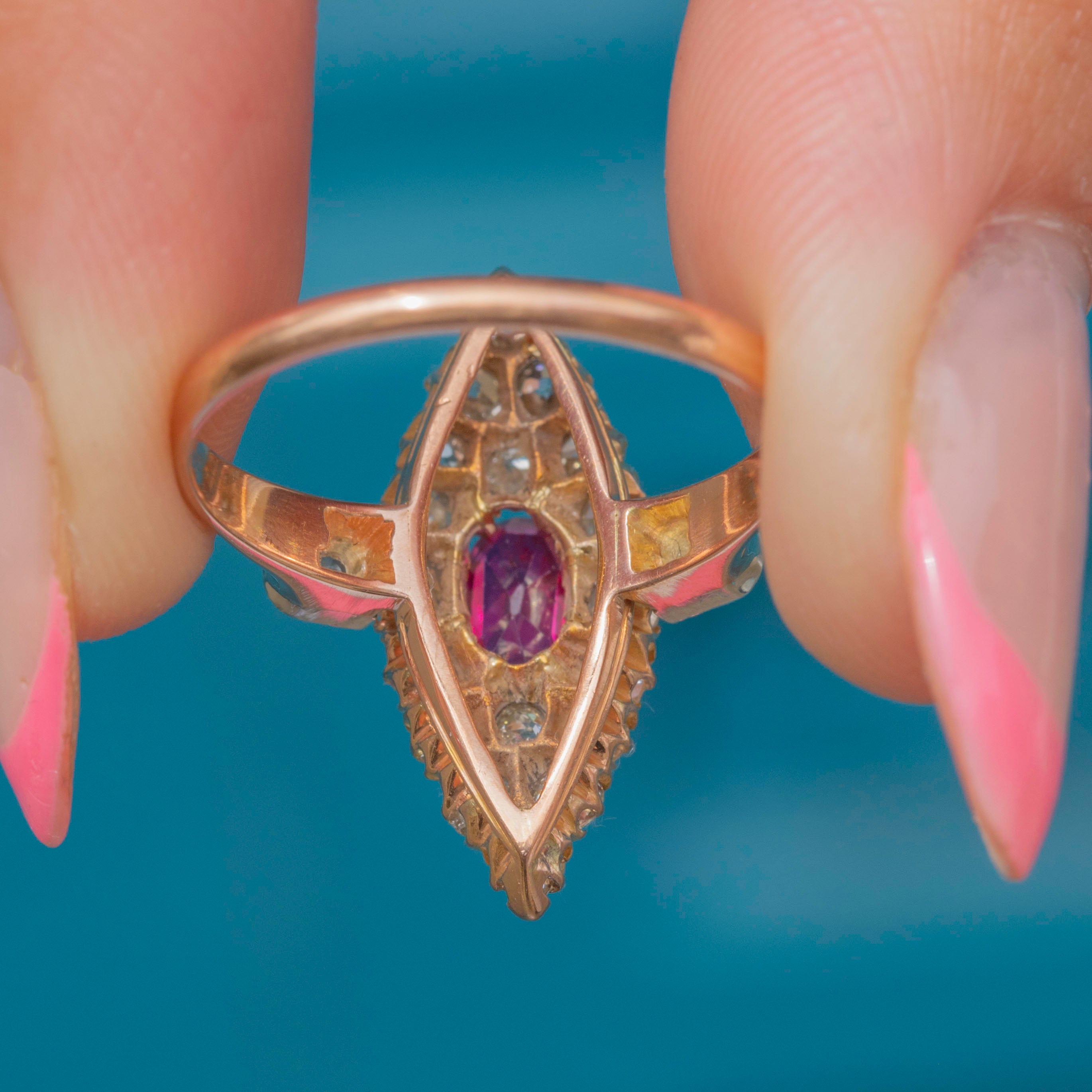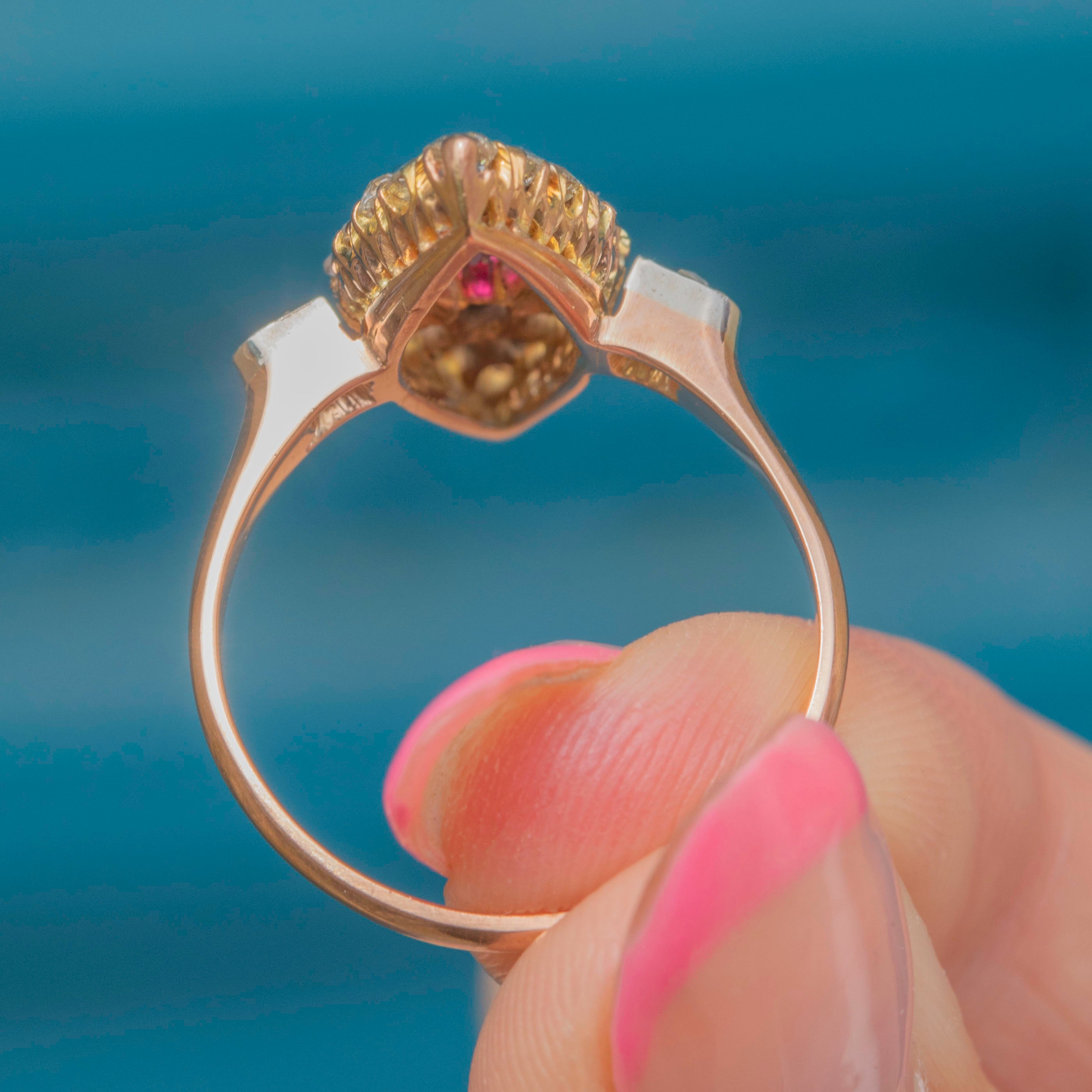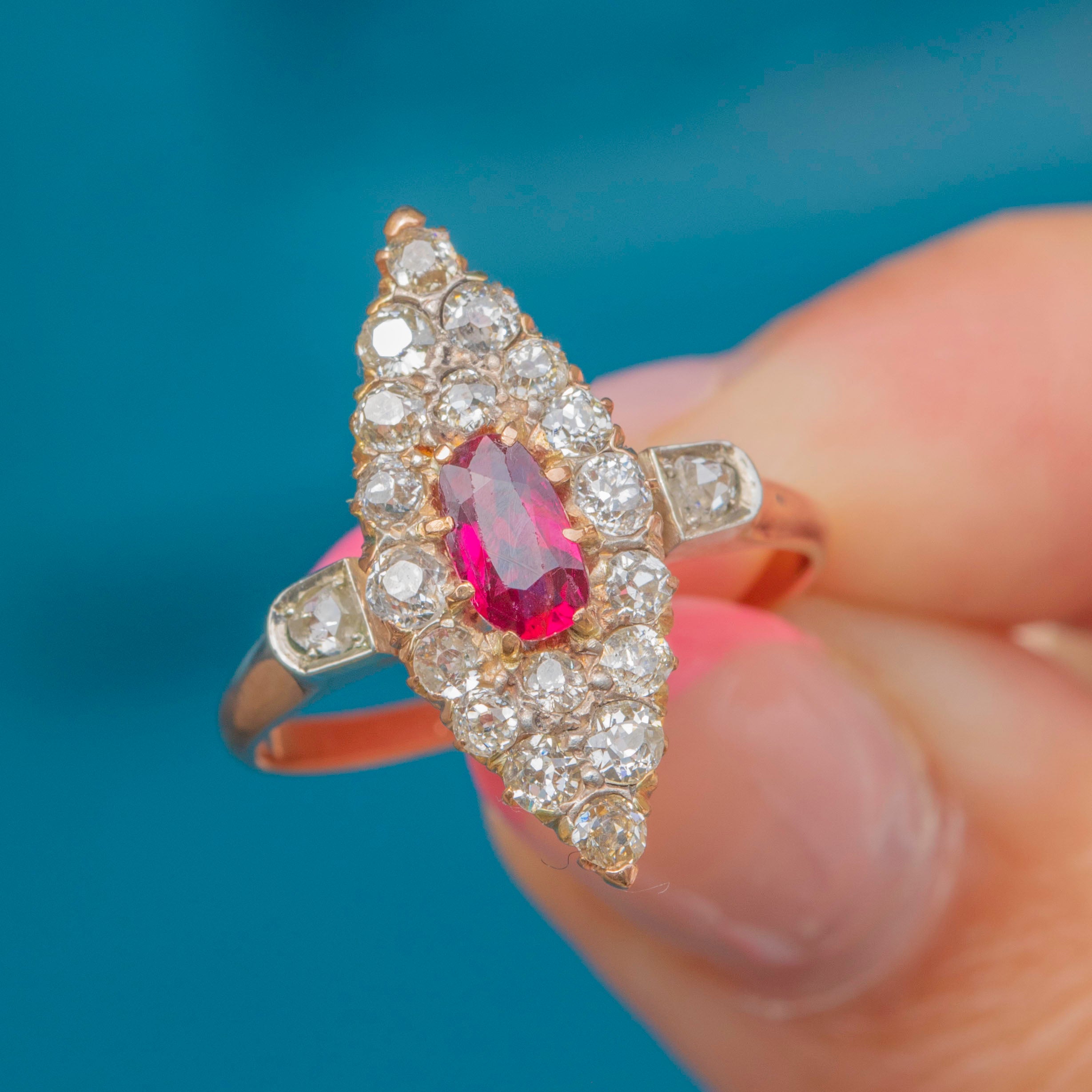 We are pleased to present this exquisite antique 18ct Gold Ruby and 0.60ct Diamond navette cluster ring!