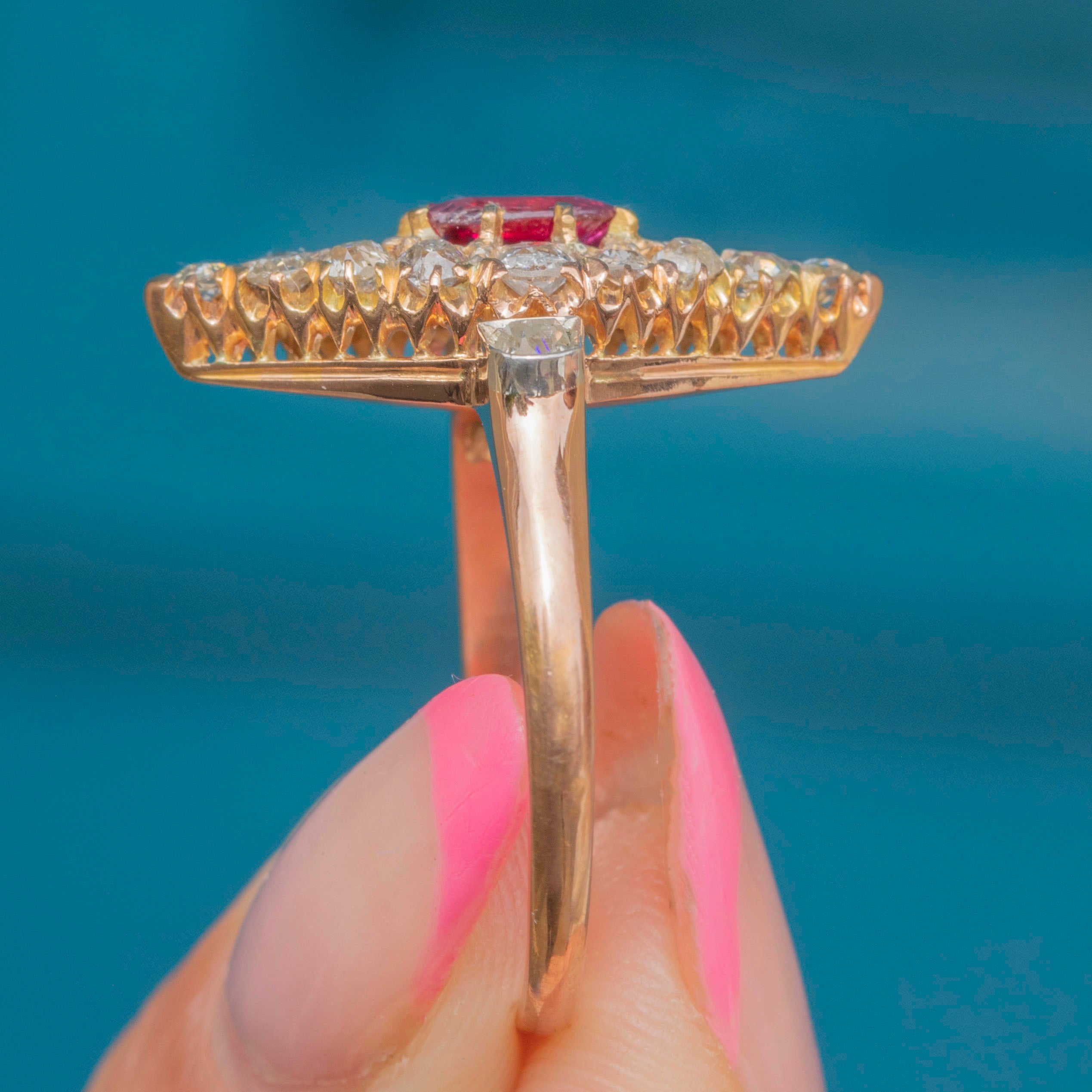 EXCELLENT: This antique 18ct Gold Ruby Diamond navette cluster ring is in wonderful condition. Each Diamond is radiant, with a distinctive twinkle, and is set securely within their 18ct Gold claws. The Ruby is equally as gorgeous, with a small inclusion present - what we like to view as a little nod to Mother Nature! With a secure band, this Victorian Ruby Diamond ring can be worn with utmost confidence.